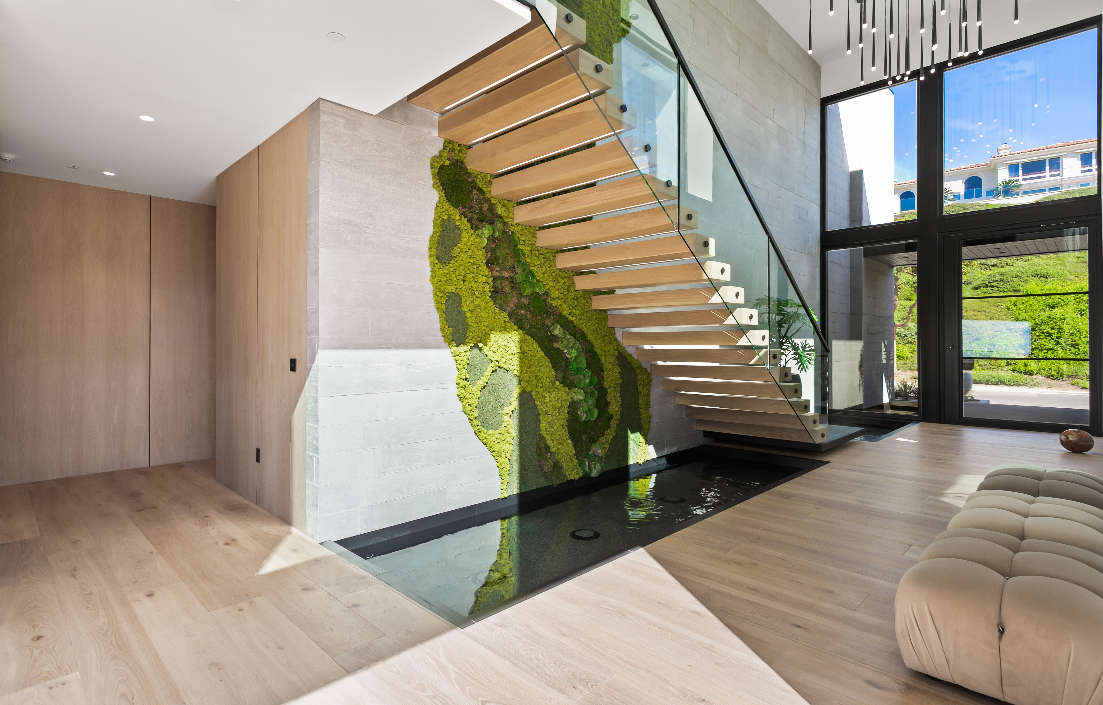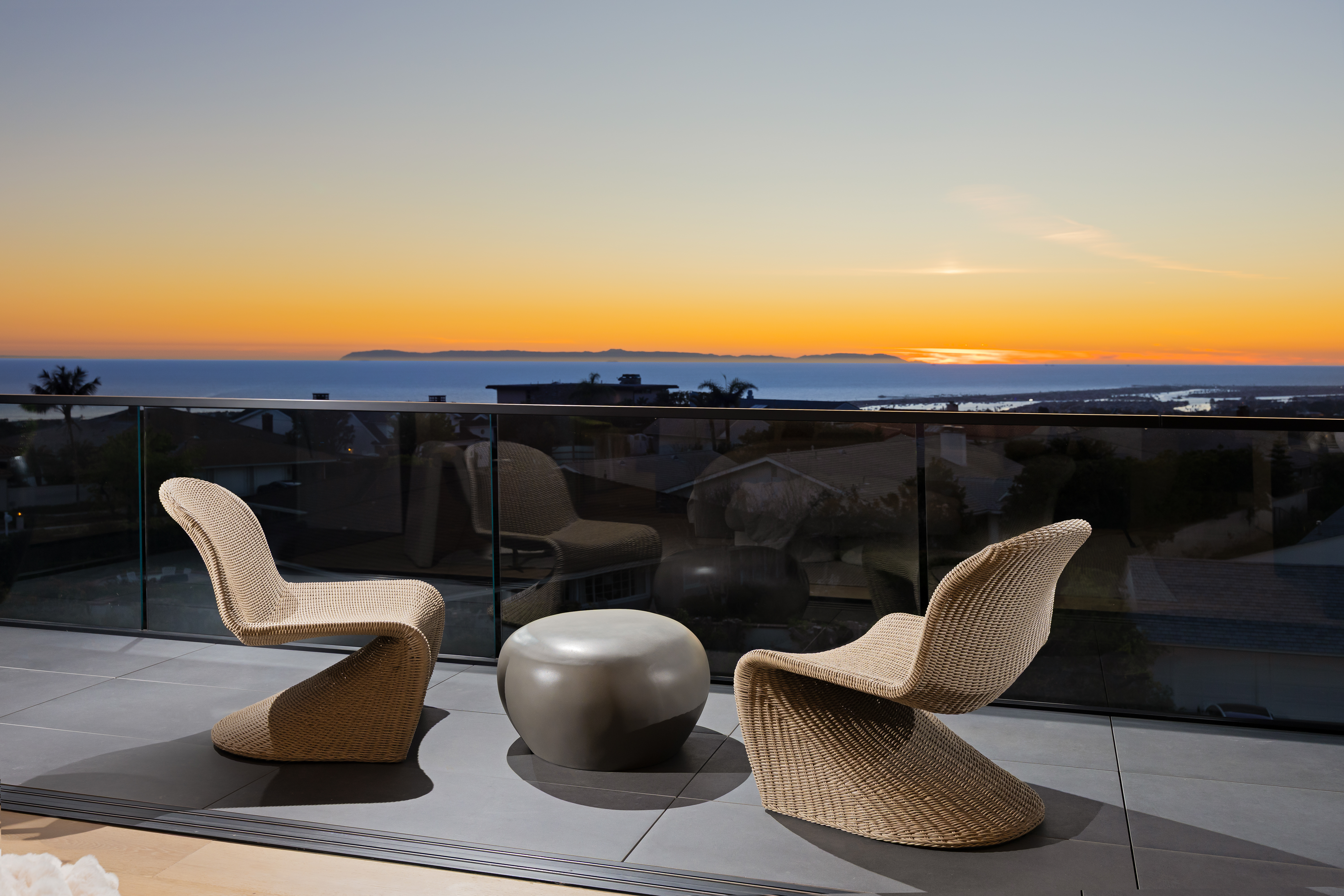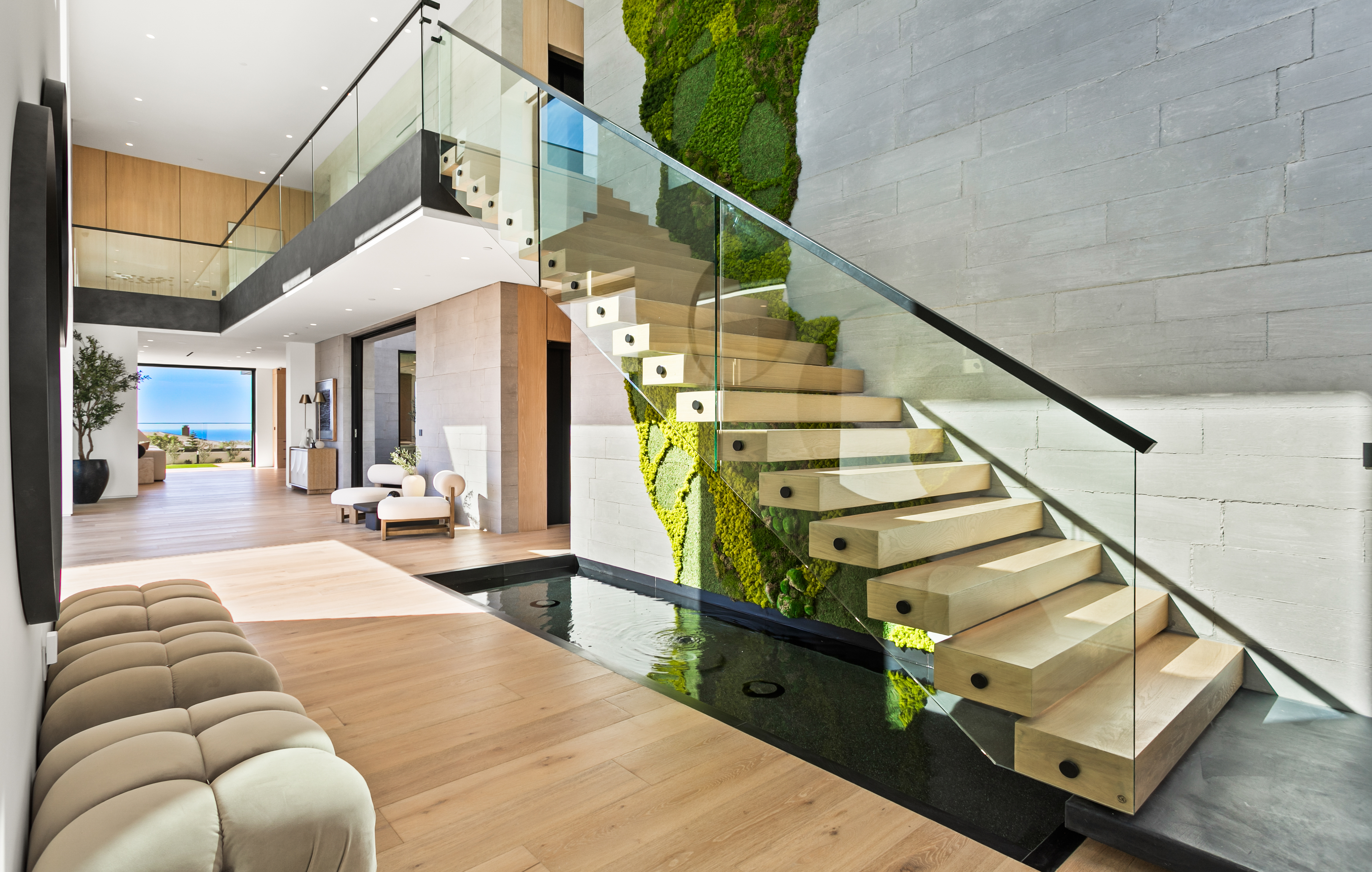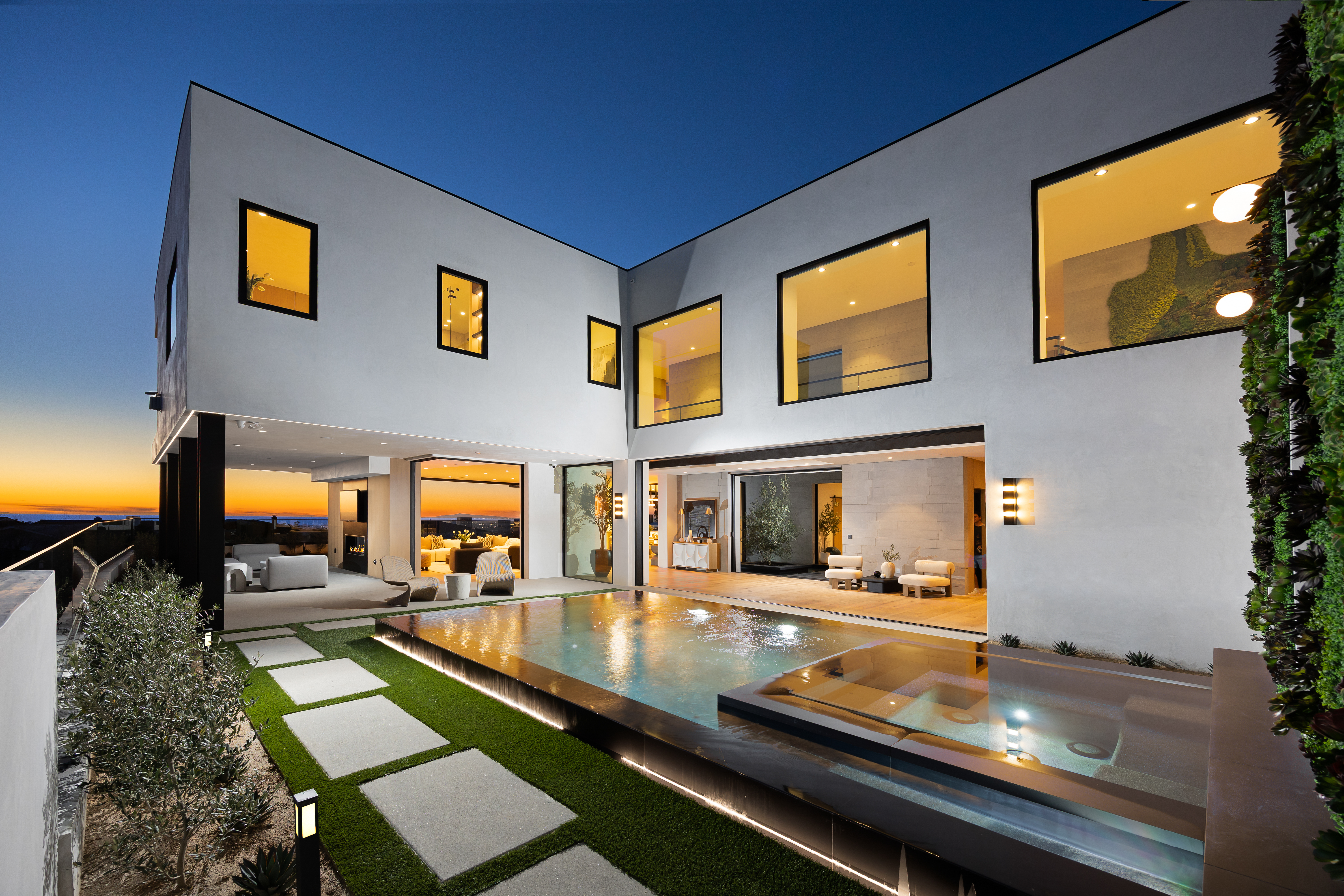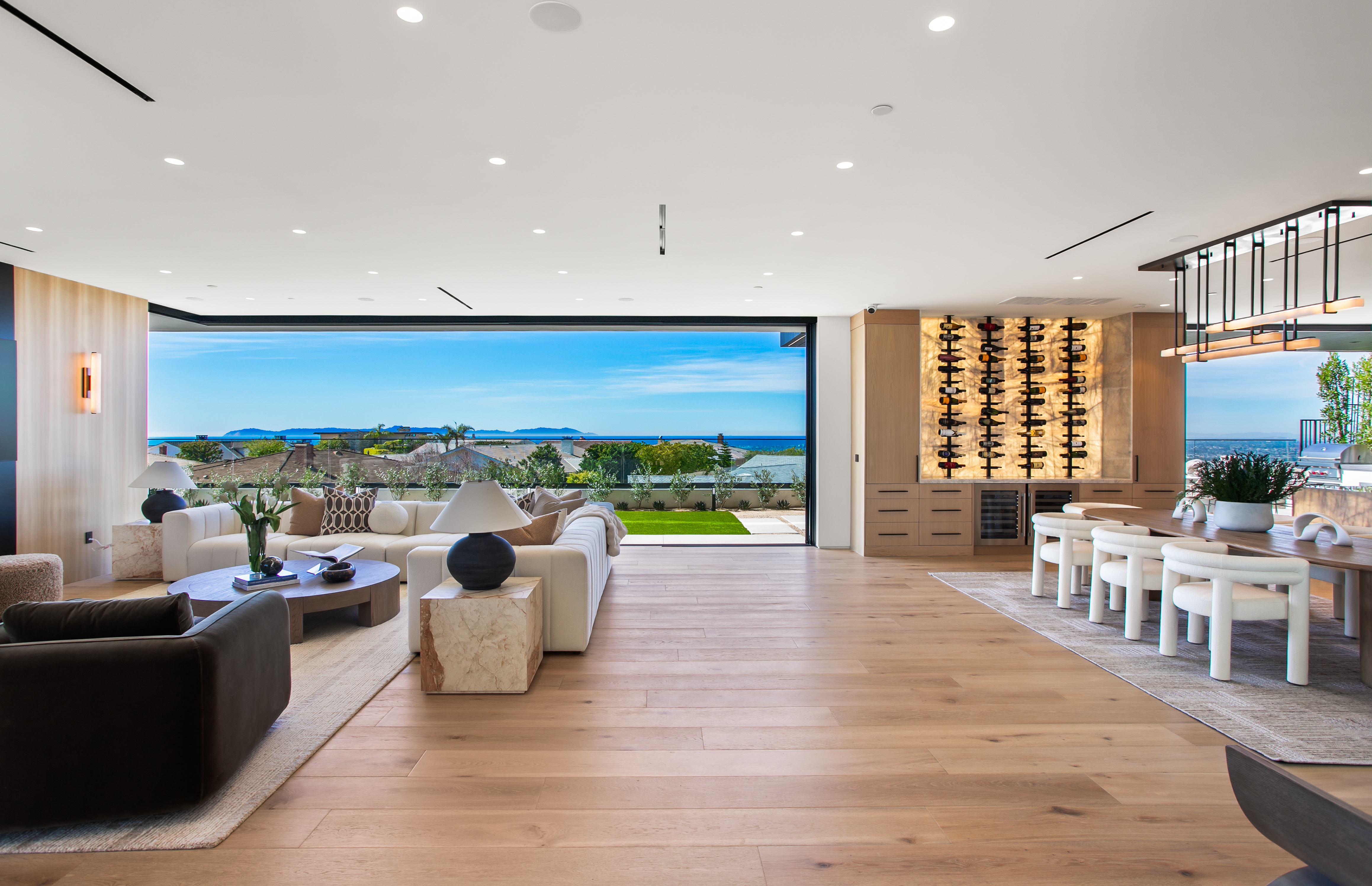 Located within Corona del Mar’s Spyglass Hill enclave, 53 Montecito is a newly constructed estate capturing approximately 270° views of Newport Harbor, the Pacific coastline, Back Bay, city lights, and mountain ranges. Commanding an elevated corner parcel with no direct neighboring structures on three sides, the residence enjoys expanded view corridors where horizon, harbor, and sky converge. Spanning approximately 7,584 square feet on a 15,740-square-foot lot, the six-bedroom, eight-bathroom home was conceived and executed as a primary residence with architectural expression and engineering precision prioritized. Arrival unfolds through a 60-foot gallery with 22-foot ceilings, aligned through walls of glass to the infinity-edge pool and Pacific horizon beyond. Floating steel-and-glass stairs, a living moss installation, and water features anchor the space. Architectural concrete panels, white oak detailing, and uninterrupted ceiling planes form a refined presentation. The great room opens to the outdoors through a 35-foot pocketing glass wall and zero-post corner systems. Entertaining spaces flow to reflecting pools, fire elements, and outdoor living areas framed in cedar and concrete, oriented toward sunset views. At the center of the home, the kitchen is anchored by a backlit Cristallo quartzite waterfall island. Pitt cooking systems, Wolf and Sub-Zero appliances, cabinetry, a Cristallo quartzite wine wall, and a secondary prep kitchen combine presence with performance. Whole-home water filtration and reverse osmosis systems serve key fixtures and refrigeration. Two primary suites offer flexibility. The upper-level primary suite opens to a terrace capturing harbor and ocean views. Taj Mahal stone, slab shower construction, a walk-in closet, oak paneling, and integrated lighting define the space. A lower-level primary suite provides accommodations for guests or multigenerational living. Amenities include a 10-seat theater with ballistic-grade reinforcement, fitness and wellness spaces, elevator access to all levels, infinity-edge pool with spa, and water features. Technology includes Josh.AI automation, Lutron lighting control, security and camera systems, structured wiring, and six zoned HVAC systems. 53 Montecito represents an opportunity to acquire a contemporary estate—an elevated coastal residence crafted for those who value design, privacy, and panoramic views.