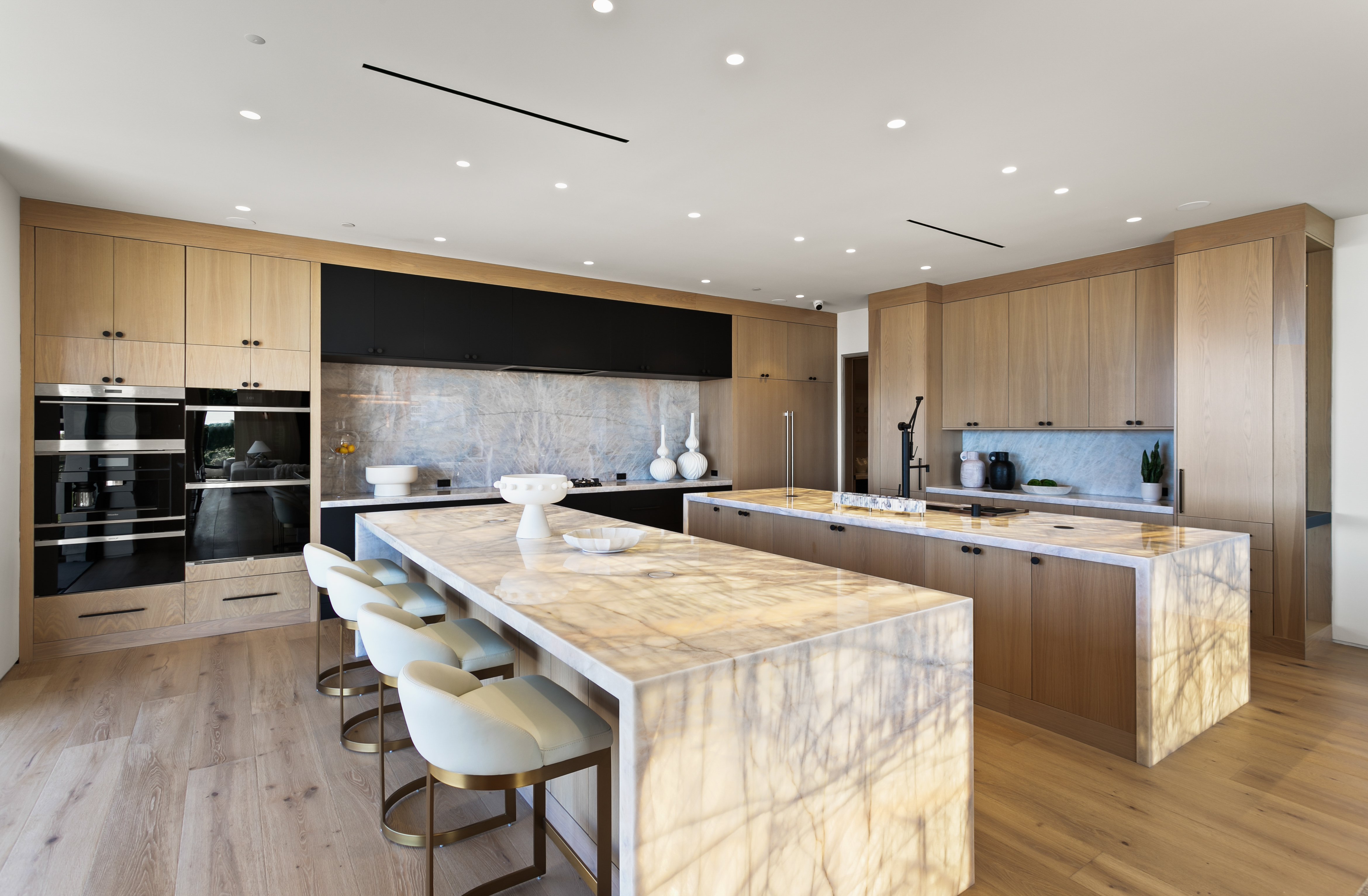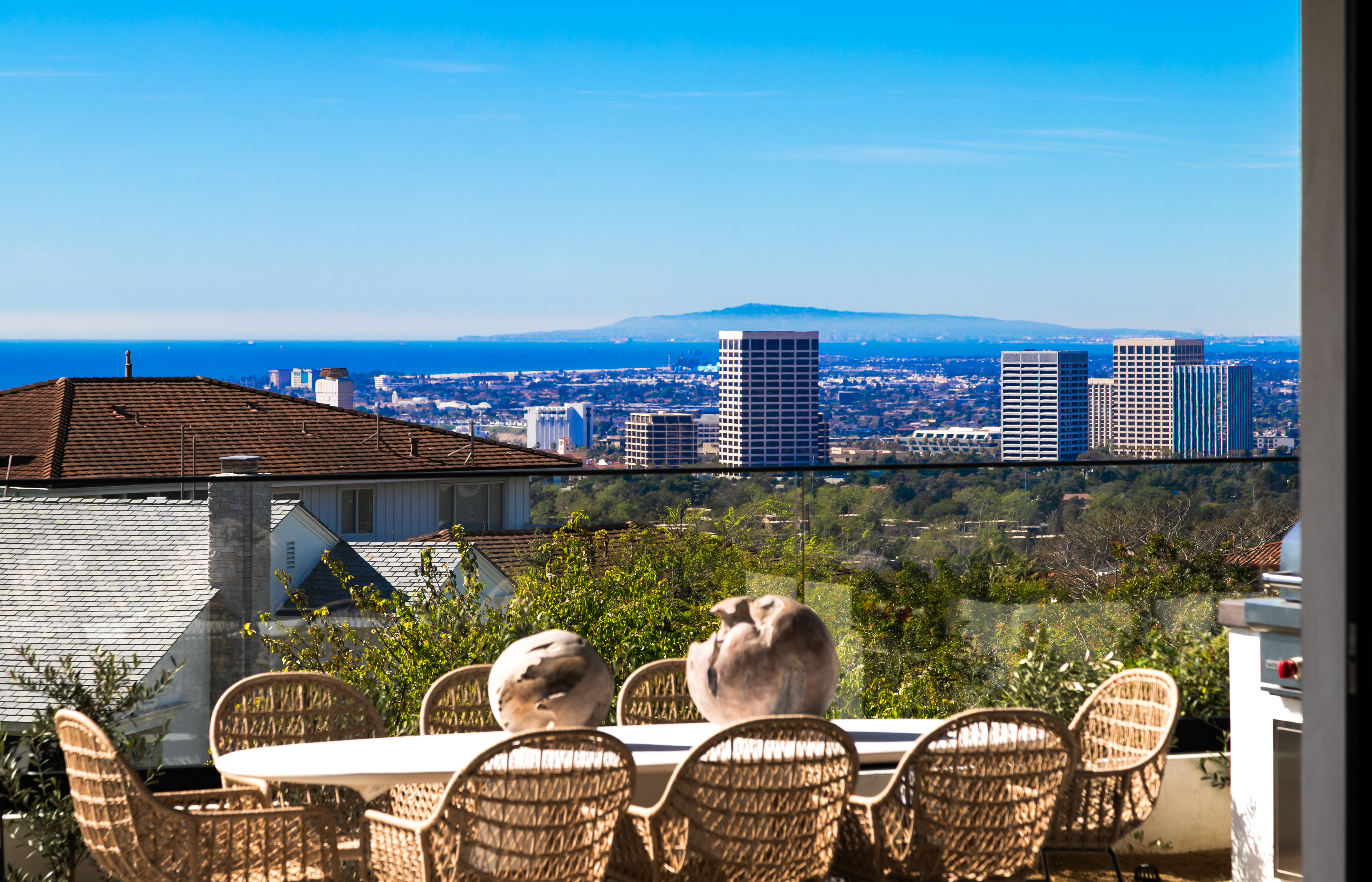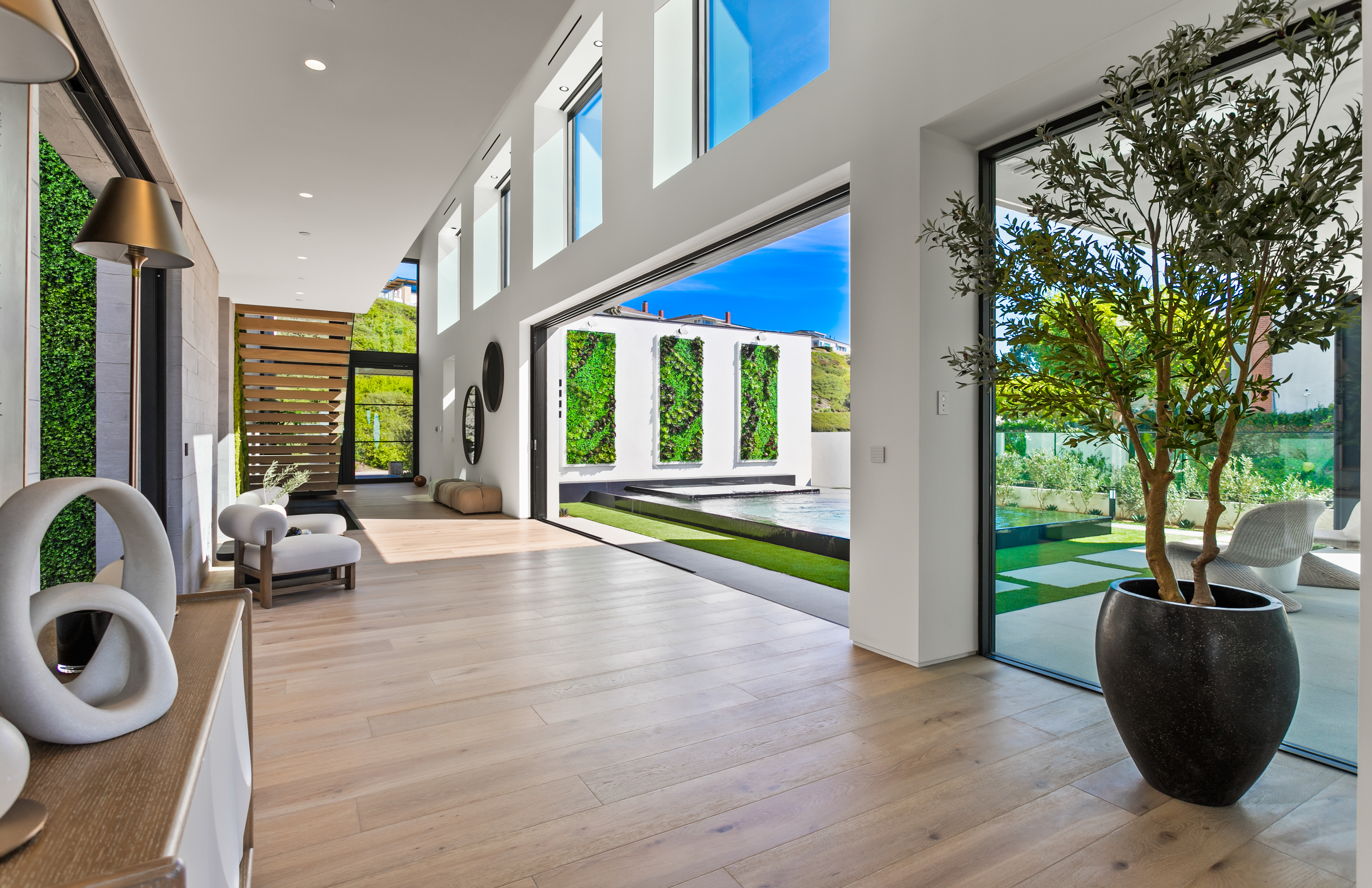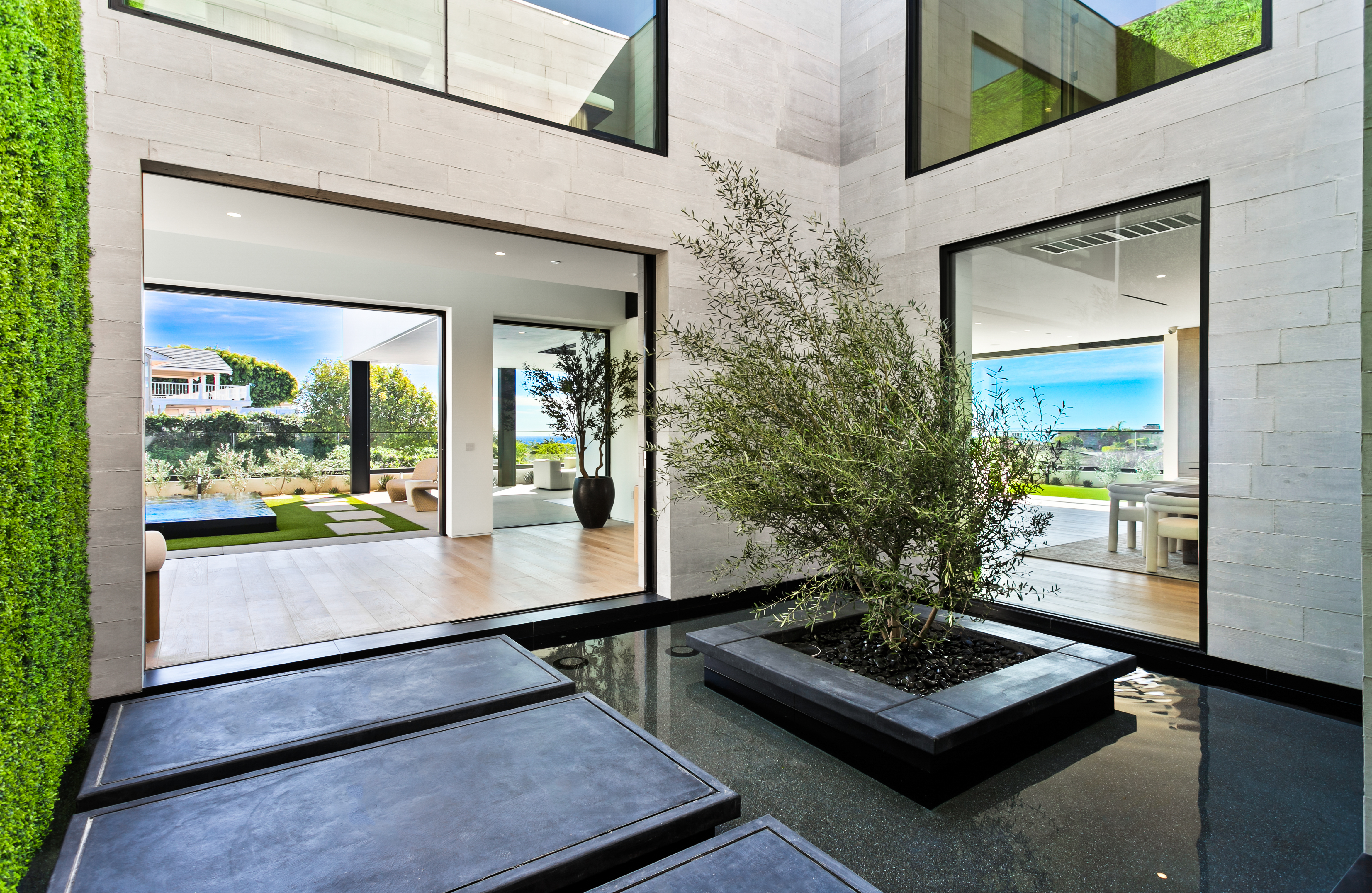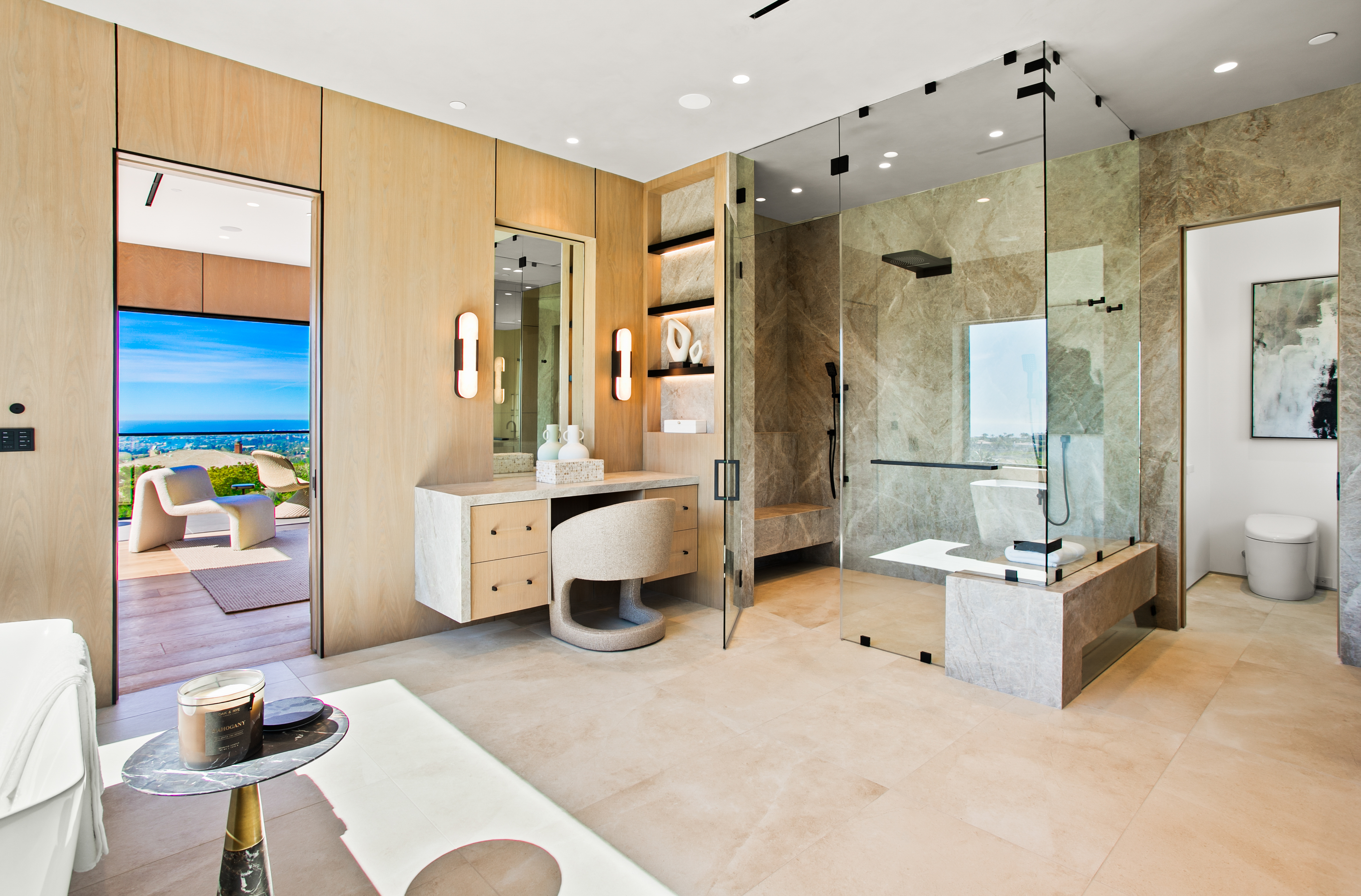 Located within Corona del Mar’s Spyglass Hill enclave, 53 Montecito is a newly constructed estate capturing approximately 270° views of Newport Harbor, the Pacific coastline, Back Bay, city lights, and mountain ranges. Commanding an elevated corner parcel with no direct neighboring structures on three sides, the residence enjoys expanded view corridors where horizon, harbor, and sky converge. Spanning approximately 7,584 square feet on a 15,740-square-foot lot, the six-bedroom, eight-bathroom home was conceived and executed as a primary residence with architectural expression and engineering precision prioritized. Arrival unfolds through a 60-foot gallery with 22-foot ceilings, aligned through walls of glass to the infinity-edge pool and Pacific horizon beyond. Floating steel-and-glass stairs, a living moss installation, and water features anchor the space. Architectural concrete panels, white oak detailing, and uninterrupted ceiling planes form a refined presentation. The great room opens to the outdoors through a 35-foot pocketing glass wall and zero-post corner systems. Entertaining spaces flow to reflecting pools, fire elements, and outdoor living areas framed in cedar and concrete, oriented toward sunset views. At the center of the home, the kitchen is anchored by a backlit Cristallo quartzite waterfall island. Pitt cooking systems, Wolf and Sub-Zero appliances, cabinetry, a Cristallo quartzite wine wall, and a secondary prep kitchen combine presence with performance. Whole-home water filtration and reverse osmosis systems serve key fixtures and refrigeration. Two primary suites offer flexibility. The upper-level primary suite opens to a terrace capturing harbor and ocean views. Taj Mahal stone, slab shower construction, a walk-in closet, oak paneling, and integrated lighting define the space. A lower-level primary suite provides accommodations for guests or multigenerational living. Amenities include a 10-seat theater with ballistic-grade reinforcement, fitness and wellness spaces, elevator access to all levels, infinity-edge pool with spa, and water features. Technology includes Josh.AI automation, Lutron lighting control, security and camera systems, structured wiring, and six zoned HVAC systems. 53 Montecito represents an opportunity to acquire a contemporary estate—an elevated coastal residence crafted for those who value design, privacy, and panoramic views.