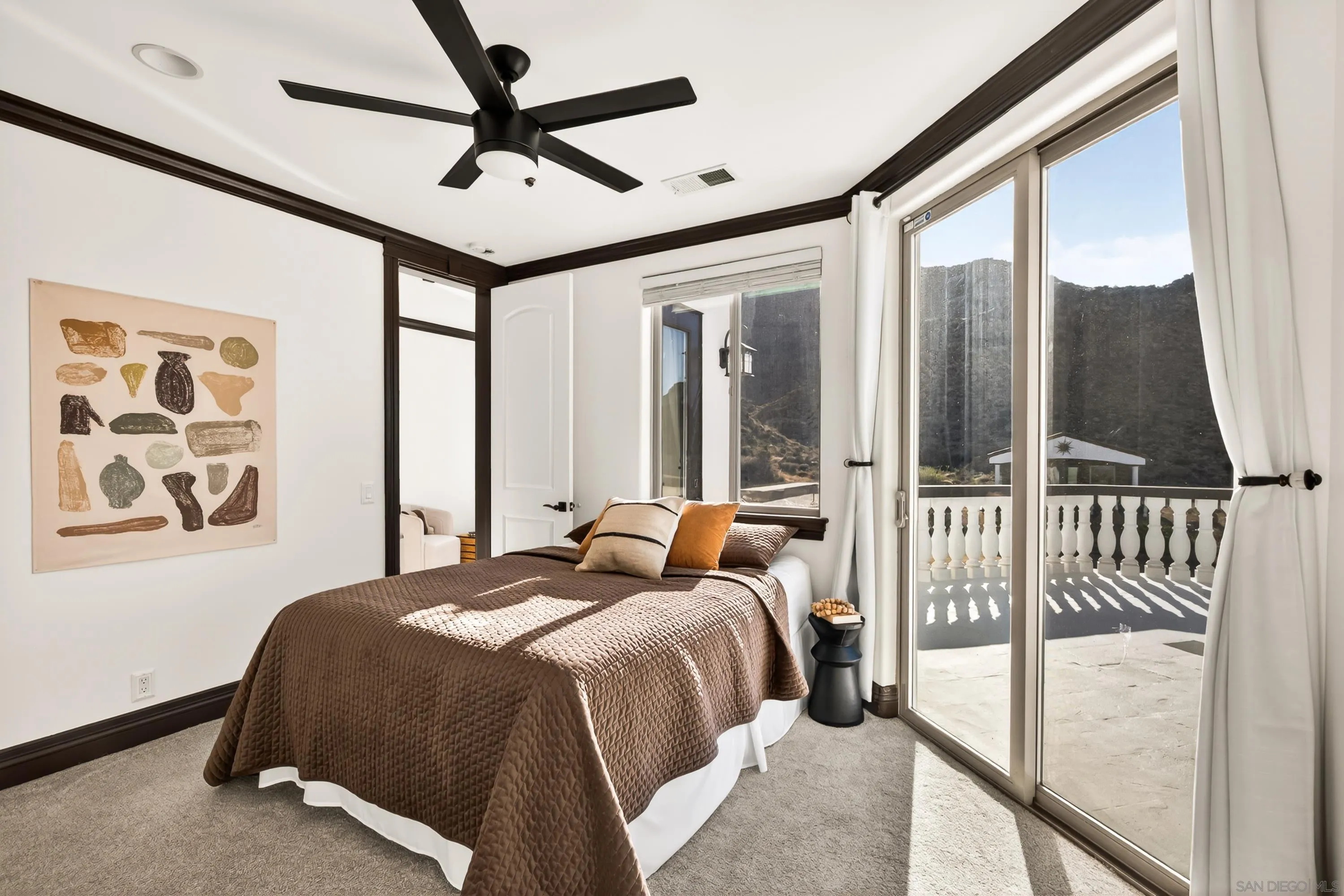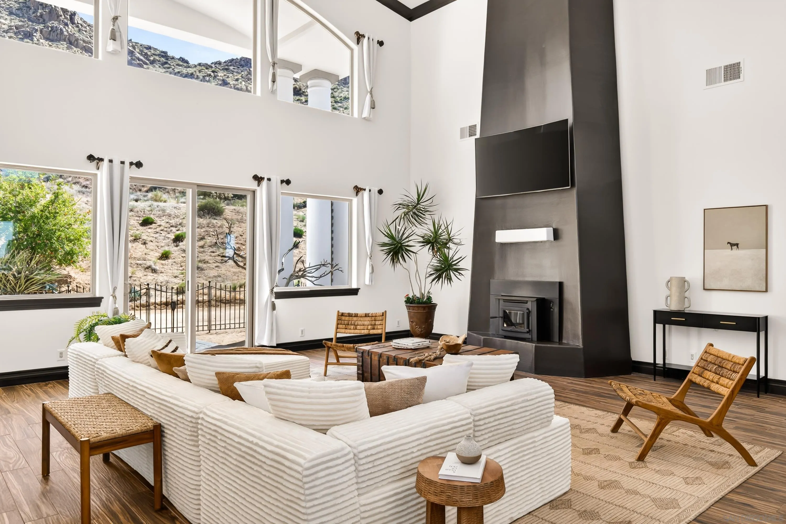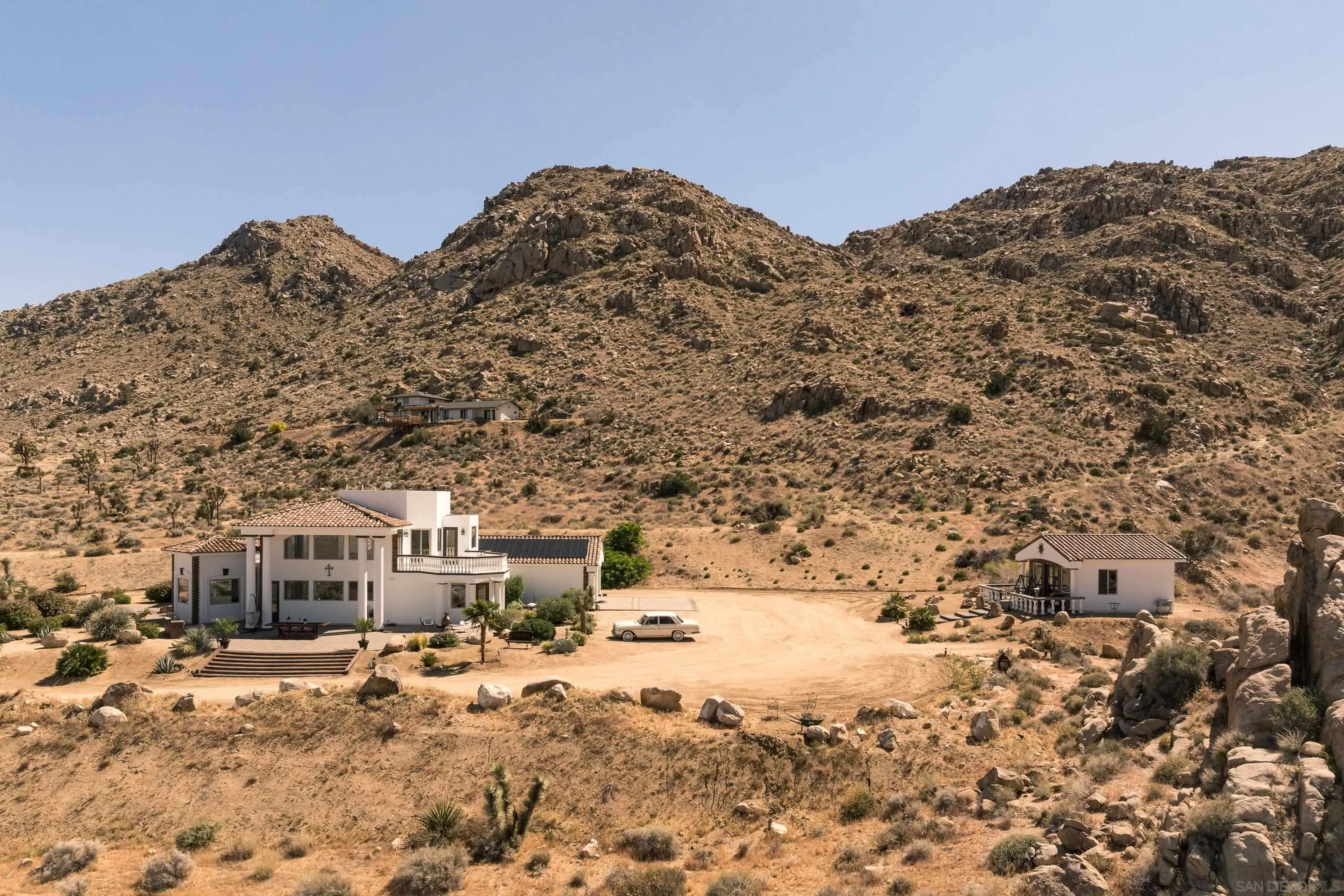 Rare Joshua Tree estate with exceptional income potential on a private 2.84-acre double lot with breathtaking views, BLM land behind the property, and private trail access directly into Joshua Tree National Park. The detached guest home has generated approximately $45,000 annually, while the main home offers estimated income potential of $200,000+ annually, creating a compelling opportunity for investors, second-home buyers, or those seeking a Luxury Desert Sanctuary. The main residence features four bedrooms and four bathrooms, with nearly all bedrooms on the main level for easy living. Upstairs, a separate retreat with view balcony offers flexible space for an office, guest area, or studio. Enter through a custom oversized wooden front door to abundant natural light, dramatic 24-foot ceilings, and distinctive architectural details that make the home feel expansive and unforgettable. The separate ADU adds even more versatility for guests, extended family, private use, or additional rental income. Outside, the property is designed for both relaxation and recreation with a beach volleyball court, in-ground trampoline, and incredible outdoor spaces to take in the surrounding desert landscape. Solar panels added in 2025. Whether you are looking for a luxury vacation rental, private retreat, second home, or investment opportunity, this exceptional property offers rare privacy, flexibility, and upside, including potential for future improvements such as an additional home, a pool, horse corral, or event venue, subject to buyer verification. A truly unforgettable offering!