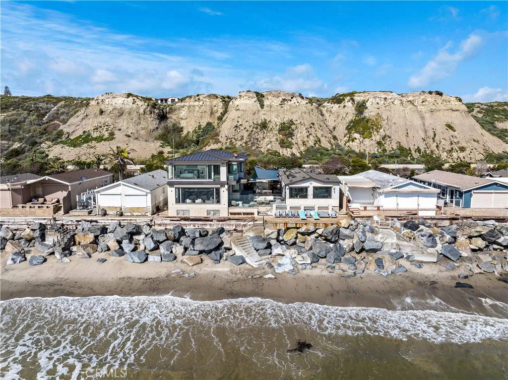 Set on the sand in the exclusive Capistrano Shores community, this rare double homesite offers ultimate California beachfront living, with panoramic whitewater, sunset, coastline, and beach views that stretch from the San Clemente Pier through the Headlands of Dana Point. Contemporary and highly upgraded, the main home provides four bedroom, four bathrooms, and the second home provides three bedrooms, 2 bathrooms. Lush outdoor space is equipped with security doors, tons of seating, a built-in BBQ and bar area, a storage area for all your beach accessories, and a partial glass enclosure for protection from the natural elements. The chic kitchen includes an oversized island, a large breakfast nook, a wet bar, and a full-size wine cooler with ample pantry storage space open to the well-appointed living room with a fireplace and security shutters to form a spectacular great room. Ocean views beyond comparison are throughout the open concept floor plan created by high ceilings, massive seamless windows, and stackable glass doors that lead to a spacious private courtyard. A laundry room, a bonus room, a three-quarter bath, a bedroom, and a powder room, both offering outdoor access, complete the bright and airy main level. The second level offers a large skylight, revealing a primary suite with panoramic ocean views, a windowed spa-like bathroom, a walk-in closet, and a deck with coastline views. Two additional bedrooms, a bathroom, a playroom equipped with a media stage, and built-in toy bins complete the second level. Additional highlights include porcelain tile flooring and wai