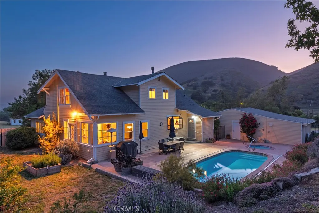 Welcome to 4651 Tepusquet Roada timeless, storybook farmhouse set on a beautifully maintained ranch in the heart of the Santa Maria Valley. Originally constructed in 1914 and thoughtfully relocated to this peaceful setting over four decades ago, this inviting three-bedroom, two-and-a-half-bath home offers approximately 2,800 square feet of updated living space, blending warmth, character, and functionality. The homes charm begins at the front entry, where a bright and cozy mudroom/sunroom invites you to enjoy morning coffee, a good book, or sunshine year-round. Inside, hardwood floors run throughout the main level, while large windows flood the home with natural light and showcase serene views of the surrounding acreage. The refreshed kitchen offers ample space for cooking and gathering, with adjacent dining and family rooms that are ideal for entertaining or relaxing with loved ones. A wood-burning fireplace warms the den, and a dedicated office off the family room provides the perfect space for remote work, creative pursuits, or a quiet retreat. Upstairs, the spacious primary suite has vaulted ceilings, generous closets, and an en suite bathroom. Two additional bedrooms share a full bath and offer comfort and style for family or guests. Step outside onto the expansive deckperfect for starlit dinners, morning sunrises, or quiet reflection overlooking the rolling grounds. Just beyond, a solar-heated swimming pool and hot tub offer a luxurious escape, powered by the propertys owned solar system. The large barn adds value and versatility, with room for agricultural storage, e