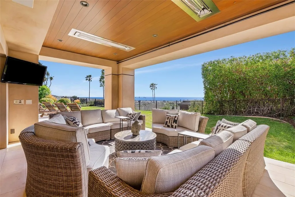 Welcome to 32661 Caribbean Drive, a distinctive, custom-built contemporary residence that exemplifies elegant coastal living in the prestigious Monarch Bay Terrace in Dana Point. Thoughtfully designed with integrity and sophistication, this single-level home sets on a sprawling 18,709 sqft lot on a serene, single-loaded street. Lush, professional landscaping surrounds the house, highlighted by a private swimming pool, spa, and tranquil waterfalls that create multiple outdoor living areas. Step through grand, solid mahogany double entry doors into an elegant foyer with soaring ceilings. From this moment, you are greeted by sweeping, ocean views and stunning vistas of Catalina and San Clemente Islands. The amazing open-concept design seamlessly connects the main living spaces, enhanced by multiple sets of 16-foot-wide solid mahogany disappearing sliding doors. These doors open to a covered patio and the lush backyard, allowing amazing daylight to pour into the living and dining rooms, and the exceptional chefs kitchen featuring a 12-foot imported natural stone island, top-of-the-line appliances, double pantry, skylight, and extensive custom cabinetry. Imported limestone flooring flows throughout the main living areas, adding timeless beauty and warmth. A large set of French doors leads to a private interior courtyard, an entertainers dream, with a resort-style pool, waterfalls, a built-in BBQ, and mature landscaping. Adjacent family/theater room includes custom built-ins and dual French doors opening to front courtyard. The luxurious primary suite is a private retreat, featur