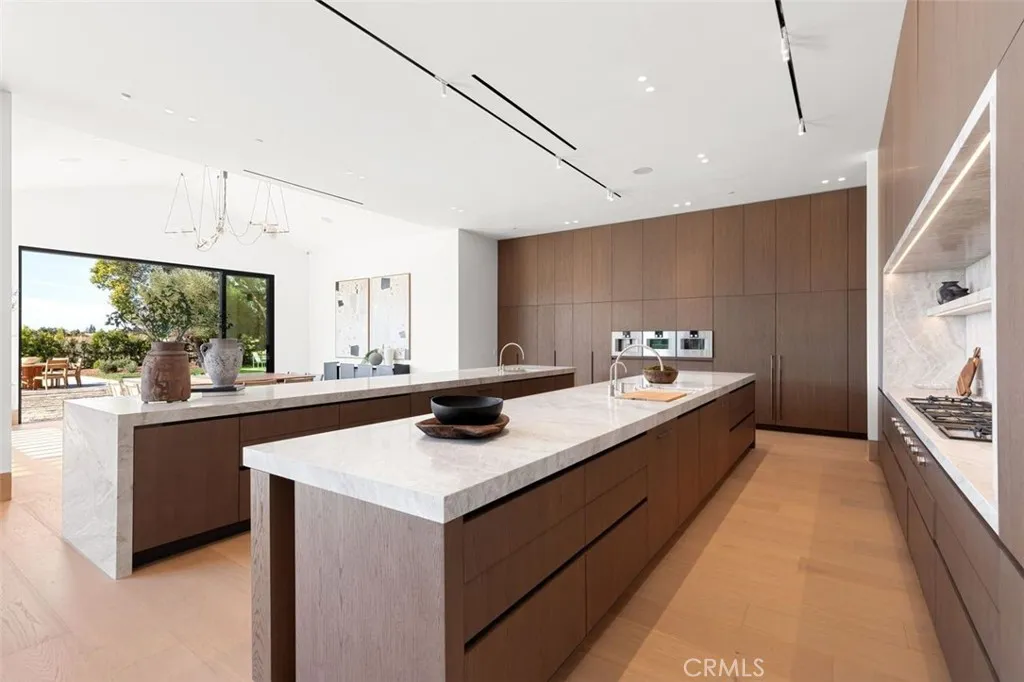 Completed in 2025, this stunning custom estate is sited in the prime Ashley Ridge section of Hidden Hills and features panoramic pastoral & sunset views! Sited on a beautiful, almost all flat 1.2-acre lot, this home offers a rare blend of modern elegance & timeless design. Spanning approximately 14,850' of luxury living space, highlights of the sunny, open floor plan include soaring ceilings & sliding walls of glass that open to the private & spacious grounds, plus a beautiful chef's kitchen with two islands & counter seating, a separate full prep kitchen, big breakfast room, spacious family room with an artistic fireplace, entertainer's lounge with wet bar, formal dining room, custom office, media room, and a truly amazing, glass encased gym with steam, sauna, indoor spa and cold plunge! There are five bedrooms in the main house, including the gorgeous primary suite with all stone bath, two superb, oversize walk-in closets and a walk-out balcony showcasing the endless sunset views. There is also a separate two bedroom and two bath guest house complete with a full kitchen, plus there is approval for a future barn if desired. The superbly private grounds offer loads of off-street parking, a sparkling pool with fountains and large adjoining spa, a full barbecue center, lush grassy areas, mature trees, and wide-open pastoral and sunset views. Located conveniently close to the highly rated public & private schools, excellent local restaurants, and the nearby beaches of Malibu, this beautifully built home has much to offer. **The home is also available for lease at $95,000 per m