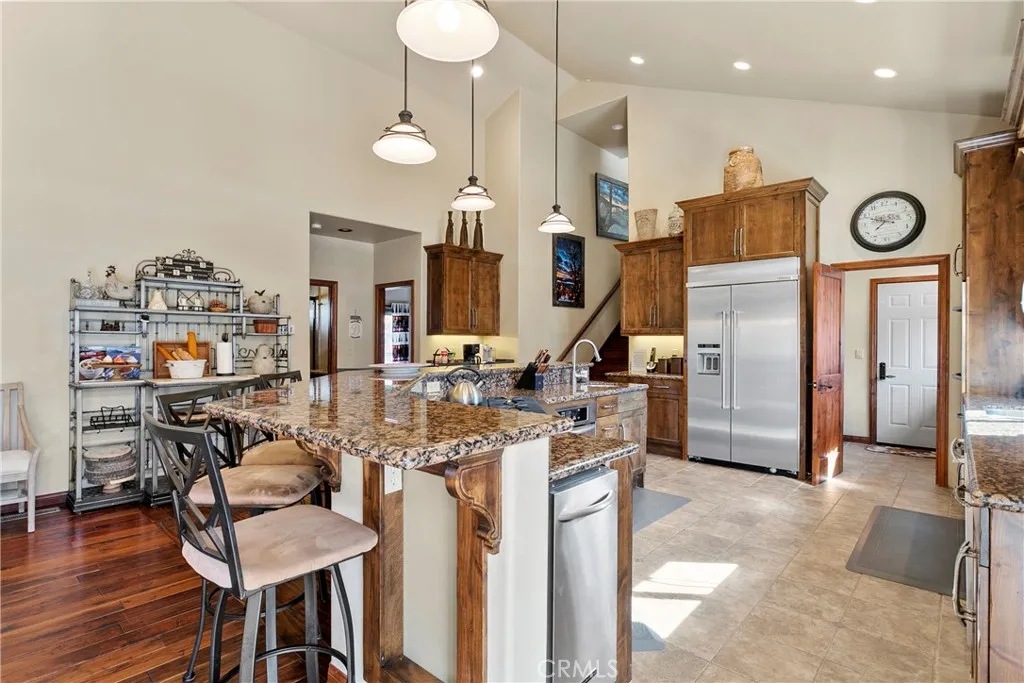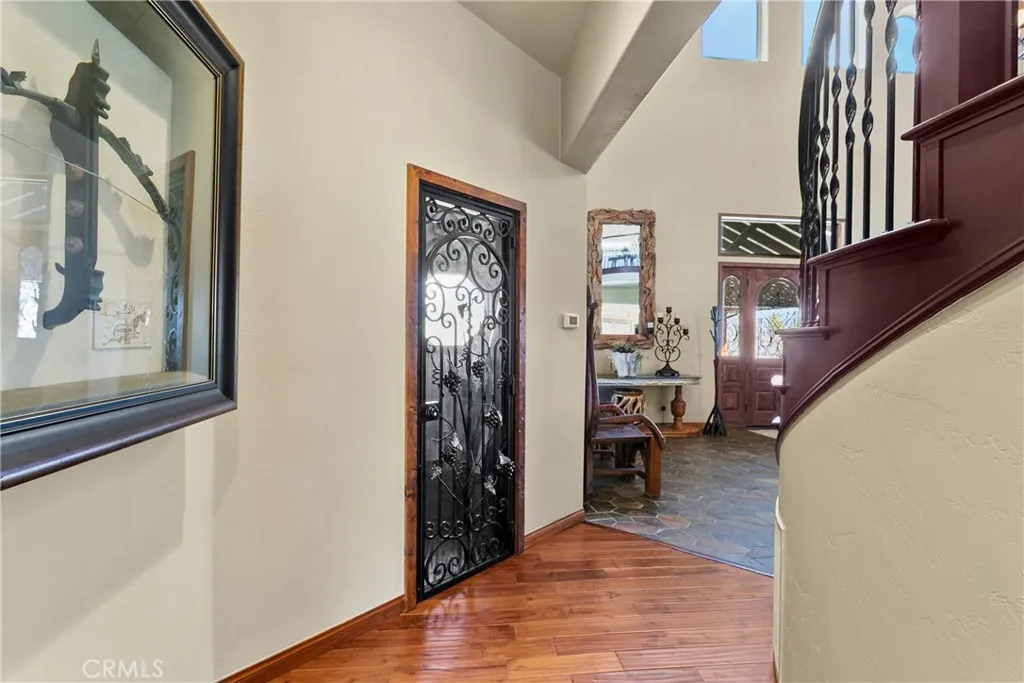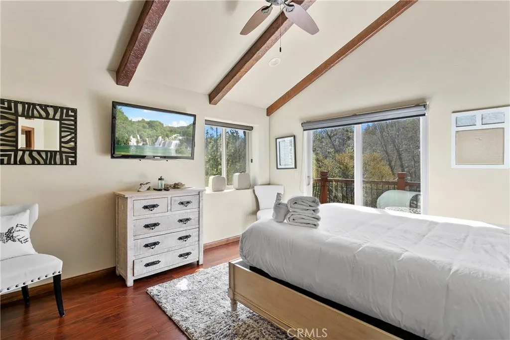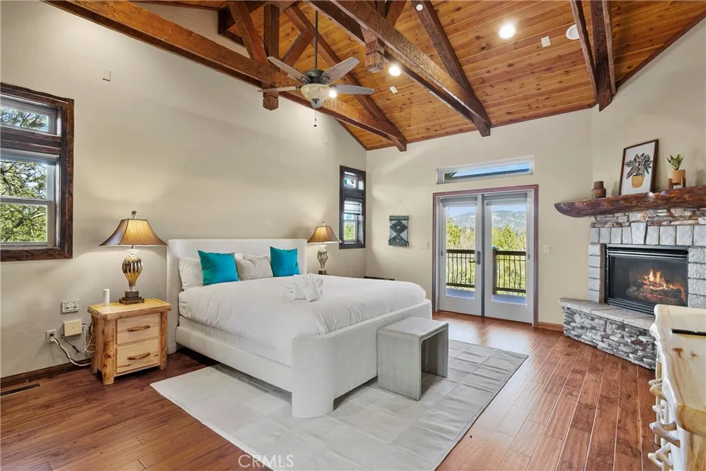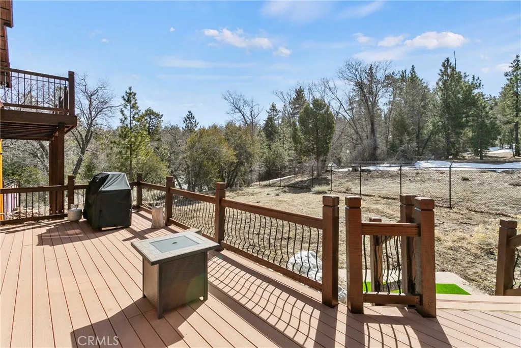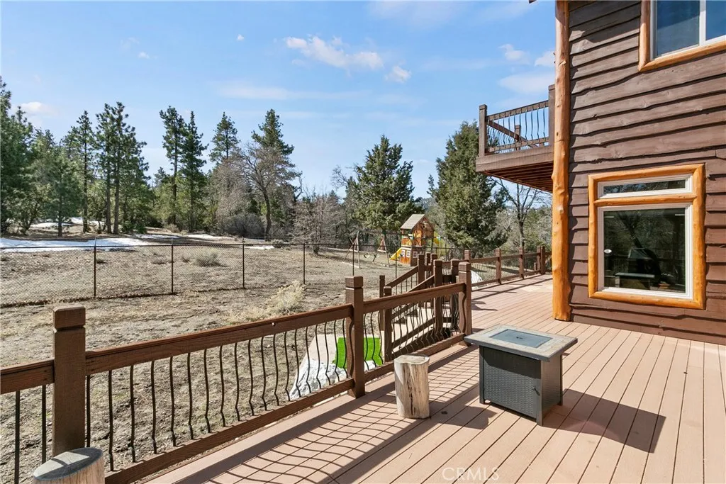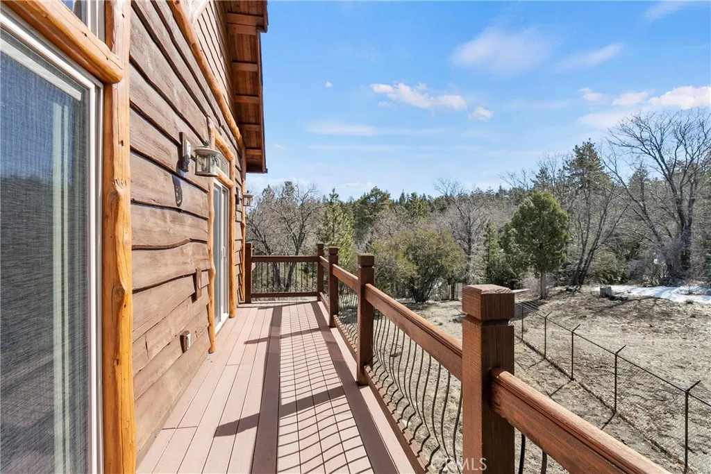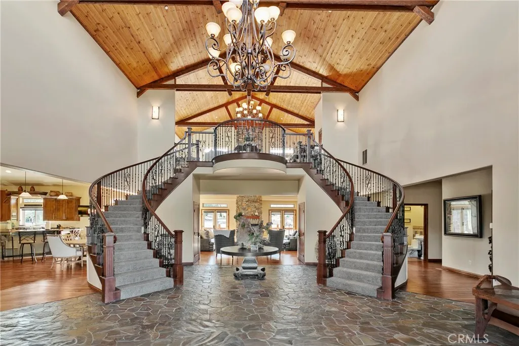 A luxurious 5-bedroom, 6-bath custom mountain estate located in the gated Fox Farm area. Built in 2007, the home spans nearly 5,000 sq ft on a private 1.87-acre lot. Grand entry with soaring wood-beamed cathedral ceilings and slate floor. Open floorplan with multiple living areas, including a family room, formal living, loft/game room with wet bar. Gourmet kitchen: warm wood cabinetry, stainless appliances, granite countertops, breakfast bar, and walk-in pantry. Wine room: temperature-controlled, adjacent to kitchen. Fireplaces (3 total): located in living room, family room, and the master suite, all adorned with stacked-stone finishes. Composite decks at both front and back, accessible from all bedrooms, offering serene forest and mountain views. Large covered front porch and a matching rear deck for entertaining. Four-car attached garage + porte cochre & driveway with gated private drive. Bonus office/nursery off the primary suite, complete with custom dog-run. Temperature-controlled wine room & walk-in pantry for storage convenience. HVAC with central air, whole house humidifier, forced-air heating. Luxury finishes: beamed ceilings, slate/tile/wood flooring, double-pane windows, wet bar. Security system owned. Captivating views of surrounding mountains and forest from multiple vantage points Located in Big Bears central Fox Farm area, just minutes from ski slopes, the lake, hiking, and local amenities. Gated entry with private road leading up to property. Offered fully furnished. ZONED SAN BERNARDINO COUNTY - ALMOST 2 ACRES - CAN BUILD ADU - CONTACT COUNTY FOR DETAILS.