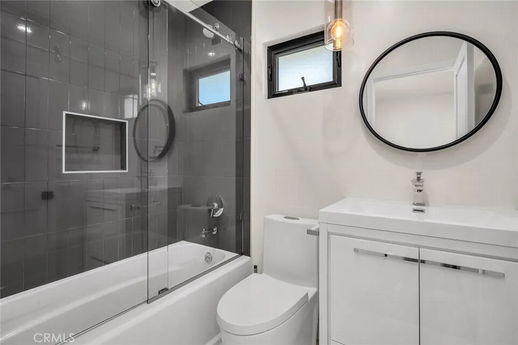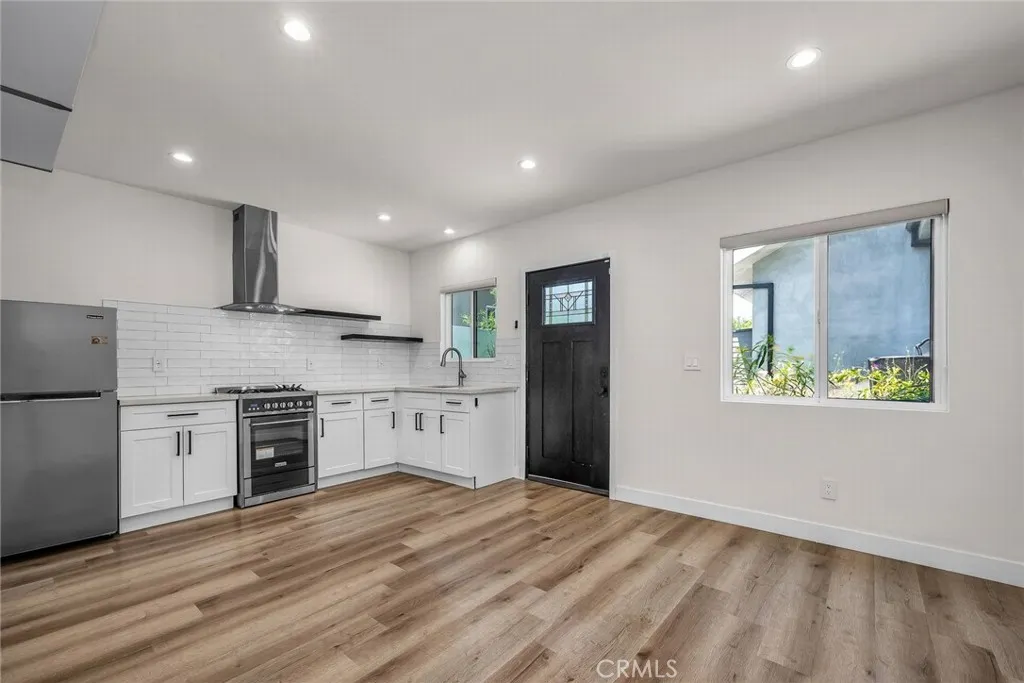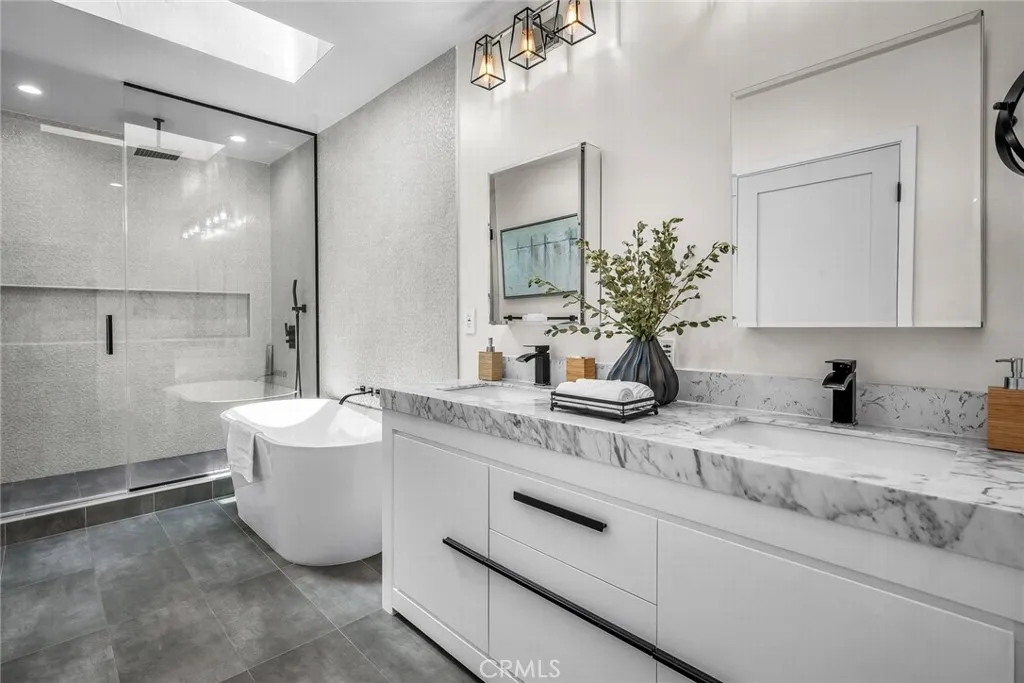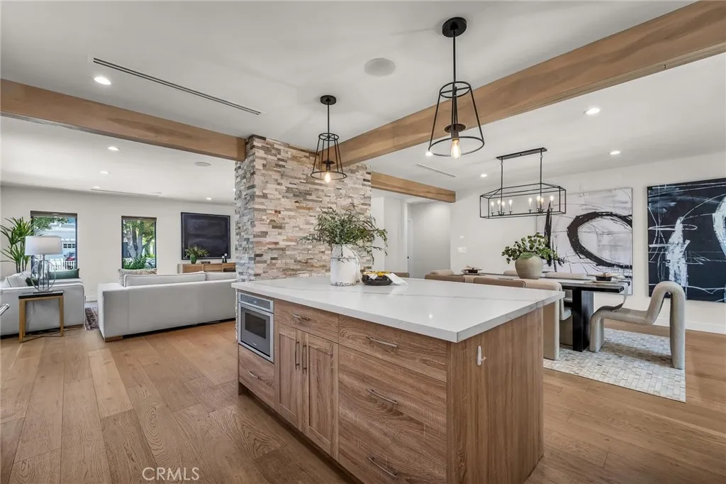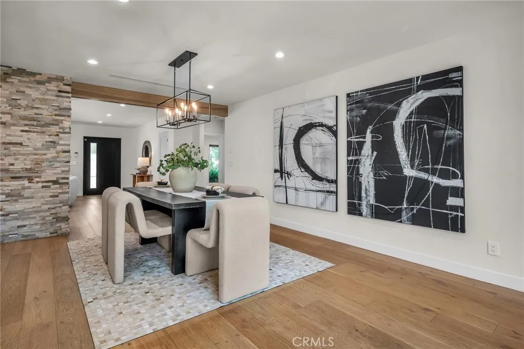 Welcome to this stylish and thoughtfully designed modern French farmhouse in the heart of Sherman Oaks. From the moment you arrive, the bold front entryfeaturing a contemporary chandelier and stone accent wallsets the tone for whats inside. Step into a bright, open two-story layout filled with natural light, wire-brushed Sahara oak floors, and custom designer touches throughout. The living and dining areas flow together seamlessly, highlighted by a striking stone wine wall and built-in ceiling speakers, perfect for entertaining. The chefs kitchen is equipped with custom cabinetry, quartz countertops, and a premium Thermador appliance package. The adjacent family room features a large fireplace with elegant stonework and custom built-ins on both sides. Glass sliders open to a private backyard retreat with a built-in BBQ, sparkling pool and spa, and a fully equipped 2-bedroom, 1-bath guest house with its own kitchen, laundry, and separate address (5108 Greenbush Ave). Ideal for extended family, a guest suite, or rental income. Upstairs, the junior suite includes a full bathroom and Juliet balcony overlooking the pool. The spacious primary suite offers its own Juliet balcony and a spa-like bath with soaking tub, oversized rain shower, and skylight. Two additional junior suites are located on the main level, each with their own en-suite bathrooms. Smart features include built-in ceiling speakers (including patio), Ring doorbell, Ecobee smart thermostat, pre-wired WiFi/TV in every room, and a full alarm system. A gated front entry and elegant powder room add convenience and priv