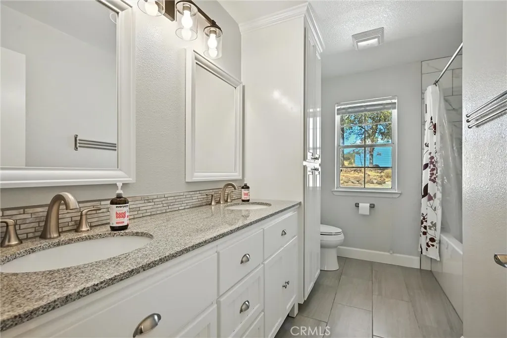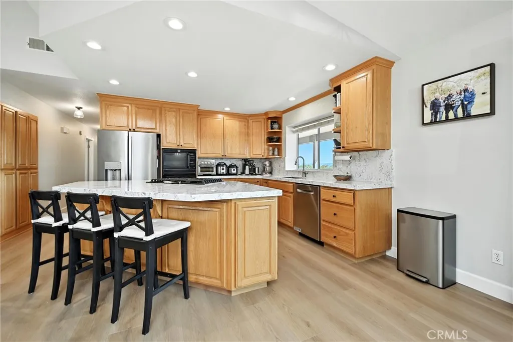 Expansive Rancho Retreat with Sweeping Views & Modern Upgrades! Set on over 5+ acres in the desirable HVL Ranchoswith no HOA dues!this beautifully remodeled home showcases unobstructed views of the valley, Mt. St. Helena, and the Hidden Valley Lake golf course pond. With modern upgrades, thoughtful design, and versatile spaces, its a home that blends elegance with everyday comfort. The open great room flows into a step-down living area anchored by a wood-burning fireplace with custom stone surround. The chefs kitchen features abundant wood cabinetry, quartz countertops, built-in oven and microwave, five-burner cooktop, and breathtaking views framed by the kitchen window. Luxury vinyl plank flooring extends throughout the home, complemented by brand-new carpet on the staircase. Just down the hall are two bedrooms and two remodeled baths. The hall bath offers dual sinks, granite slab counters, upgraded cabinetry with linen storage, and a large tub/shower combo. The primary suite is a spa-like retreat with radiant flooring, soaking tub beneath a panoramic window, oversized custom tile shower with specialty coated glass, privacy water closet, quartz dual-sink vanity, updated lighting, and a massive walk-in closet. Also upstairs, the versatile utility room doubles as an office and laundry area with storage closets, utility sink, and breezeway access to the oversized 2-car garage with workshop. Downstairs are two additional rooms: a third bedroom with en suite bath and private deck access, plus a bonus room that is an entertainer's dream complete with custom bar, sink, cabinetry,