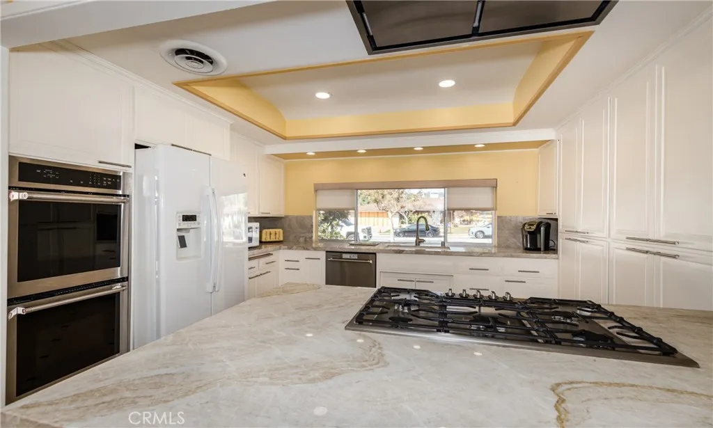 Nestled on a quiet cul-de-sac in a highly sought-after, established Covina neighborhood, this spacious 5-bedroom, 3-bath home with a formal living room blends timeless charm with thoughtful updates. Inside, youll find lovely updated wood flooring with wood trim, fresh interior and exterior paint, stylish new fixtures, and new window treatments in several rooms, two fireplaces for cozy evenings, making it truly move-in ready. The heart of the home is the bright, beautifully updated kitchen, with white cupboards, granite countertops with backsplash, featuring stainless steel appliances including two ovens, a modern stove, a built-in exhaust vent, and plenty of counter space for cooking and entertaining. The kitchen opens to a welcoming family dining area with access to the lovely patio and backyard. A cozy den off the dining area and wet bar with sink and mini-fridge is perfect for family time or casual gatherings. A convenient indoor laundry room and powder room off the kitchen add function and ease to daily living. The bedrooms are filled with natural light, including a primary suite for your private retreat. With five total bedrooms, youll have plenty of space for family, guests, or a home office. Additional highlights include a 2-car garage with epoxy floor along with private driveway, a smart thermostat for year-round efficiency, new roof in 2024 and a peaceful cul-de-sac setting in a mature neighborhood that truly feels like home. Close to schools, shopping, dining, and freeway access. A well-built home with great bones, just waiting for the right buyer to add their per