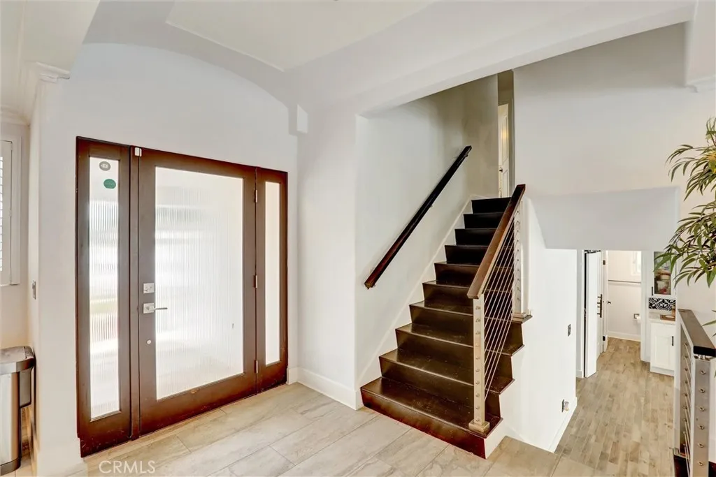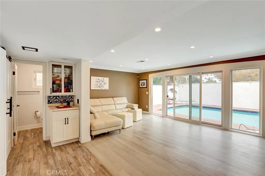 PRICE REDUCTION - STUNNING, ENTERTAINER'S DREAM HOME!! This home is absolutely move-in ready home. This home brings in a ton of natural light, it is a refreshingly fully renovated and family friendly home in well-located and maintained Cerritos. This 5-bedroom 3-bath home is facing east. The floor plan is an open, easy flowing home. Living room, dining room, kitchen dining area, and family room are each elegantly, uniquely and tastefully decorated. This home is immaculate! Spacious living room with cozy fireplace, and formal dining room that opens to an inviting outdoor open patio, BBQ grill, fire pit, outdoor fryer, built-in outdoor kitchen and large pool - 4' to 8' deep. Step down into a separate family room, where two bedrooms, laundry room and bathroom with shower are located (ideal for guests or share this home with family). The open kitchen includes upgrades - from porcelain countertops, floors, new kitchen appliances, gas top range, range hood and dishwasher; custom cabinetry, countertops in fully renovated kitchen and bathrooms, updated vanities, appealing fresh paint throughout, wood floors, tile floors, and modern manufactured quality vinyl wood-like floors. This home includes new windows, copper plumbing, streamlined, efficient recessed lighting throughout the house. Direct access to the large 2 car garage. Custom wood shutters, new HVAC, spa tub in master bathroom. 2 bedrooms downstairs and 3 bedrooms upstairs. Walking distance to Liberty Park, Los Cerritos Mall, and located in the award-winning ABC school district. This home is a MUST SEE!!