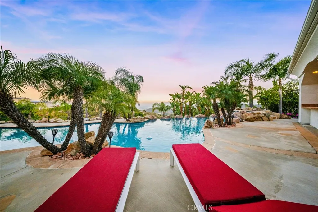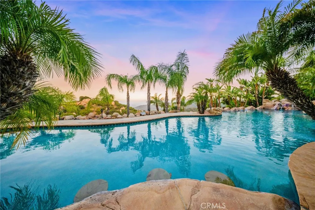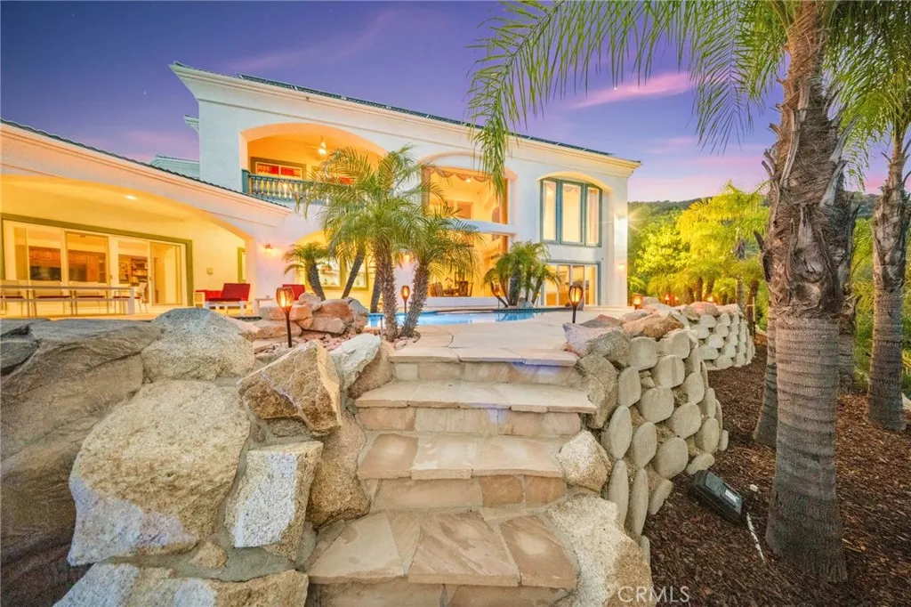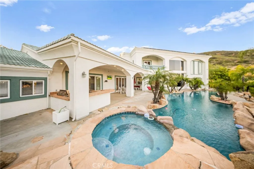 Exquisite Custom Estate with Panoramic Views in Prestigious La Cresta. Discover one of the most extraordinary homes currently available in Murrieta, offering over 6,400 sq ft of refined luxury on more than 5 acres, nestled in the highly coveted La Cresta community. Boasting 4 spacious bedrooms and 4.5 bathrooms, this exceptional property delivers the perfect blend of elegance, comfort, and functionality. Enter through a private, gated driveway to a grand double-door entrance, where you're welcomed by soaring ceilings and a dramatic foyer with rich finishes. The open-concept layout is designed to highlight the sweeping 180-degree views of the Murrieta and Temecula Valleys, visible from nearly every room in the home. Walls of windows and glass doors seamlessly connect the indoor living space to the stunning backyard oasis. Step outside to experience true resort-style living with a sparkling pool and spa, built-in custom BBQ island, and a private guest cabana complete with its own bathroom and shower, ideal for hosting or extended stays. Entertain, relax, and soak in all this property offers. The gourmet chefs kitchen is a culinary masterpiece, complete with high-end stainless steel appliances, granite countertops, custom cabinetry, a large center island with seating, and walk-in pantry. Entertain with ease in the formal living and dining rooms, breakfast nook, and expansive family room, all showcasing incredible views. A fully-equipped custom bar, complete with sink and mini fridge, anchors the impressive game room featuring a billiards table, shuffleboard, and a temperature-