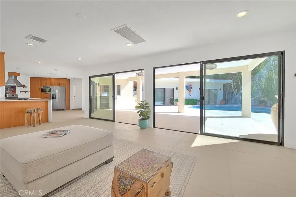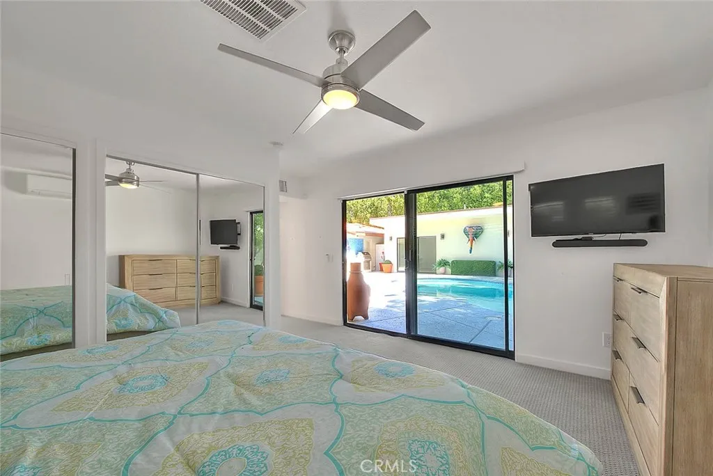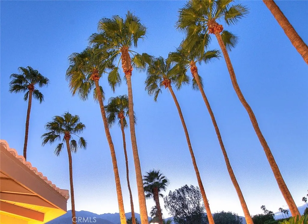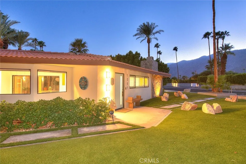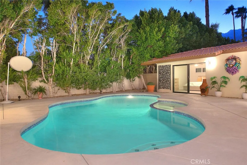 Welcome to your own private Palm Springs compound in the highly sought-after Movie Colony East neighborhood. Situated on fee land, you own the land and benefit from owned solar the perfect combination for long-term value and peace of mind. Surrounded by 17 soaring palm trees, this fully upgraded 4-bedroom, 3.5-bath residence, including a spacious 2-bedroom casita, captures the essence of desert luxury and resort living. The owners spared no expense: complete artificial grass landscaping with professional uplighting, new concrete driveway and pool decking, epoxy-finished garage with custom cabinetry, and full interior and exterior repainting. Inside, enjoy power blinds, plantation shutters, elegant accent tile, a vessel soaking tub, and new carpeting in the primary suite. A whole-house water purifier, Phyn leak-detection system, and a garage air-conditioning unit add comfort and efficiency. All of this wraps around your resort-style pool and spa, surrounded by lush palms and overlooked by a generously sized covered patio perfect for dining al fresco, the Palm Springs way. Whether you are hosting friends, relaxing poolside, or unwinding in the private casita, this property offers the ultimate blend of comfort, design, and desert charm. With every detail meticulously executed, this stunning home is move-in ready and embodies the timeless elegance of true Palm Springs living.