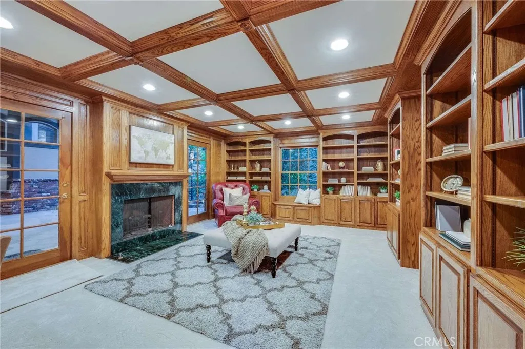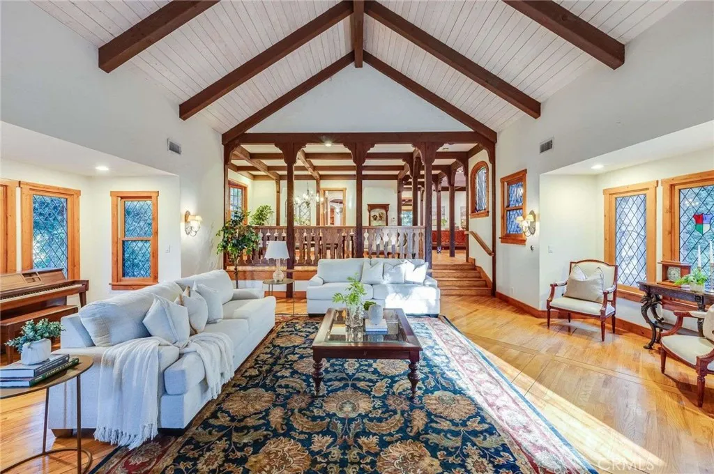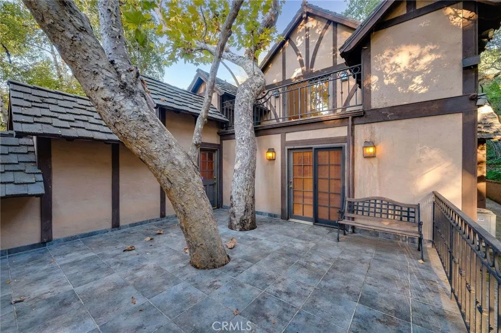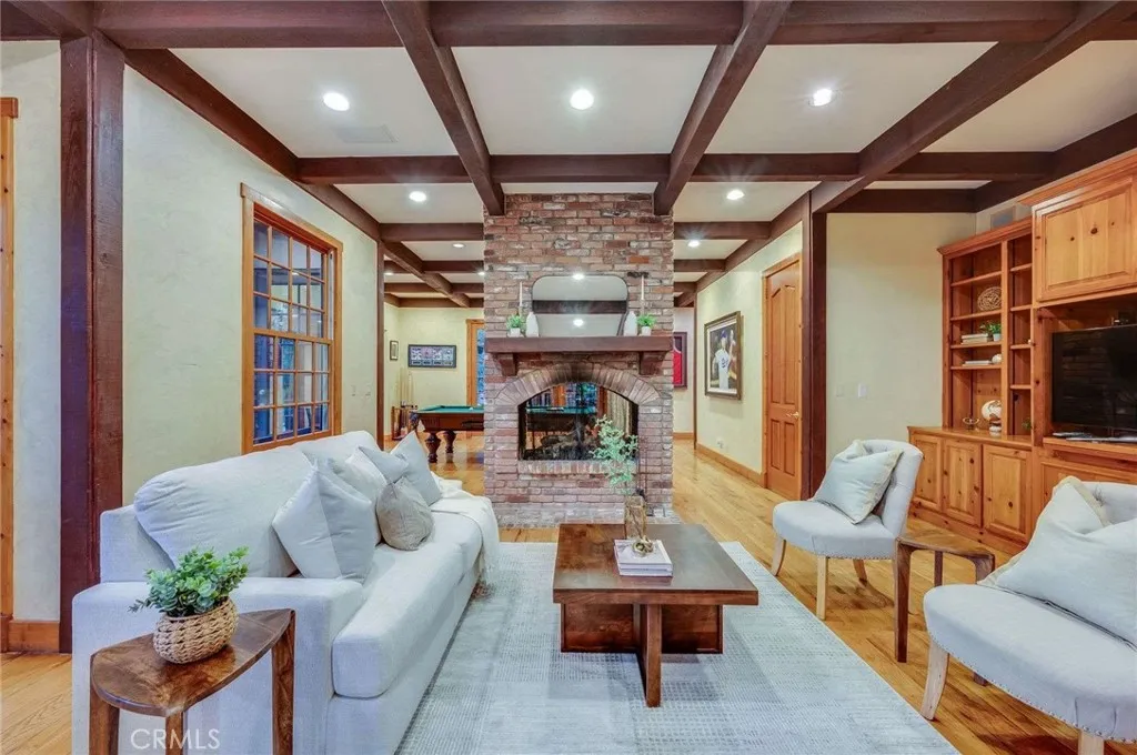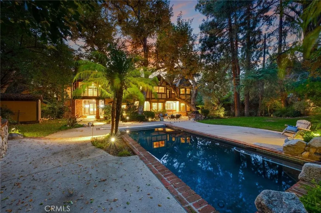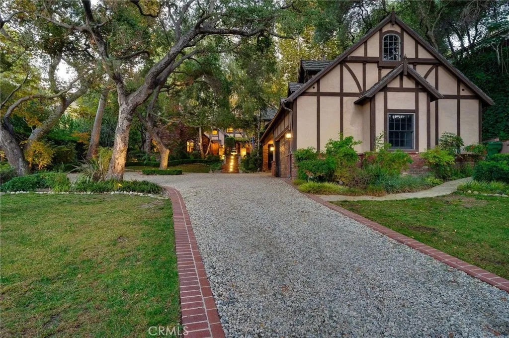 Nestled behind private gates on approximately two acres of beautifully manicured, park-like grounds, this stunning English Tudor estate offers 7,516 sq ft of timeless craftsmanship and refined elegance. From its classic timber-beamed and brick exterior, to its intricate interior woodwork, open vaulted ceilings with exposed wood beams, and stained and beveled glass windows, every detail reflects the character and grace of a bygone eraperfectly blended with modern luxury. A grand formal entry welcomes you into a two-story foyer that opens to an expansive floor plan featuring a step-down living room with a dramatic floor-to-ceiling stone fireplace, a large formal dining room, and multiple gathering spaces ideal for entertaining. The gourmet kitchen is complemented by granite countertops with custom cabinets, island with prep sink, a butlers pantry with wet bar, walk-in pantry, and premium appliances including Sub-Zero, Thermador, and KitchenAid. Unique spaces such as a charming potting room, large craft room, upstairs bonus/play room, separate office/library, and a game room with pool table add character and versatility. There is truly plenty of space for everyone! The home offers five spacious bedrooms, including an elegant primary suite with a cozy sitting area, fireplace, and access to an expansive balcony shared by most of the upstairs bedrooms. The luxurious en suite bathroom features a jetted soaking tub, separate tiled shower, double sinks with marble countertops, custom cabinetry, and a private vanity areacreating a serene retreat within the home. Outdoors, enjoy resor