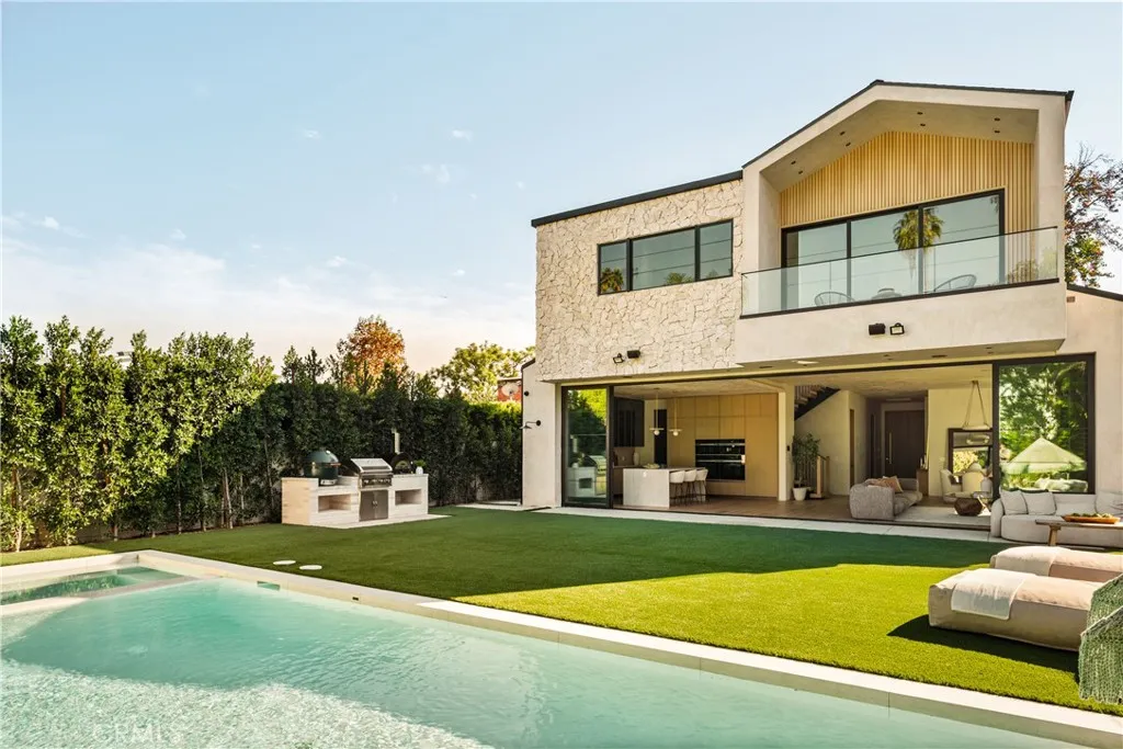 Experience elevated living and exceptional craftsmanship in this brand-new contemporary estate by MLR Development, perfectly located in the heart of Sherman Oaks. Designed with modern California living in mind, this 5-bedroom, 6-bathroom residence blends effortless luxury, architectural precision, and seamless indoor-outdoor flow. A grand entry welcomes you into an open-concept floor plan filled with natural light, soaring ceilings, and seamless indoor-outdoor flow. Designed for both relaxation and hosting, the first floor includes a private ensuite bedroomperfect as a guest suite or sophisticated home officealong with a spacious theatre room for the ultimate cinematic experience. The gourmet chefs kitchen impresses with state-of-the-art Miele appliances, stone surfaces, imported custom wood cabinets, an oversized island with seating, and wall to wall 10ft collapsing glass doors opening to the backyard for true resort-style living. Step outside through these expansive glass doors to your private backyard sanctuary. Designed for large-scale entertaining and everyday relaxation, the outdoor oasis features a sparkling pool and spa, built-in barbecue, Green Egg smoker & pizza oven, generous lounge and dining spaces, and lush landscaping for total privacy. Upstairs, four ensuite bedrooms provide privacy and comfort, including a stunning primary retreat bathed in natural light. The primary suite showcases a sleek fireplace, custom walk-in closet, and a spa-inspired bathroom complete with dual vanities, a soaking tub, and an oversized steam shower. A rare opportunity to call this