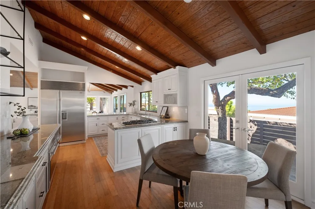 Theres a certain kind of light that hits the Peninsula in the late afternoon; soft, golden, and just slow enough to make you look twice. At 30105 Avenida Esplendida, that light pours through vaulted wood ceilings and across open living spaces, filling the home with a quiet warmth you only get when coastal air moves through elevated hillside homes. From nearly every main gathering space, the living room, kitchen, dining areas, and even two of the bedrooms, your eyes are naturally drawn outward toward the ocean. Here, views arent a backdrop; theyre part of the rhythm of daily life. Morning coffee, dinner with friends, working from home are all framed by the calm of the water and the curve of the coastline. Inside, the layout balances openness and intimacy. The kitchen opens to the living and breakfast areas, encouraging conversation and easy flow, while the dining and family rooms offer defined spaces for hosting or winding down. The newly remodeled primary bath and refreshed finishes throughout give the home a clean, move-in-ready feel, without sacrificing character. But the true heart of this property lies just beyond the walls. Step outside and youre transported. A Tuscany-inspired courtyard wraps gently around the home with a pool and spa, a built-in Lynx and Viking outdoor kitchen, a wood-burning fireplace, and multiple patios designed for long meals and late summer evenings. Its a home that invites celebration, quiet reflection, and everything in between. Its rare to find a property that holds both presence and ease where architectural warmth, usable outdoor space, and