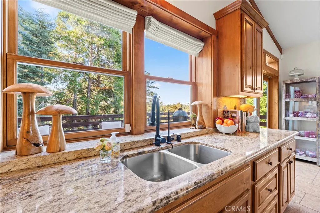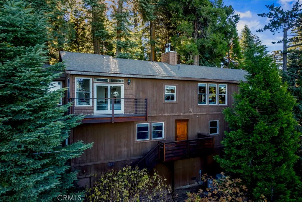 Super Private Full Time Residence located in Coveted Skyforest boasting White Dogwoods and Panoramic Lake Arrowhead Lake Views, Snowcapped Mt. Baldy Views, City Light Views of Hesperia, Unforgettable Sunsets and Fourth of July Fireworks! This Uncompromised 2-Story 1,900 sqft Hidden Treasure encompasses Quality and Designer Aesthetic Appeal with Pride of Ownership located on a Paved and Privately Maintained Access Road and is nestled amongst Towering Pines. Main Level Features: Vaulted Wood Beamed Ceilings with Open Floorplan of Living Room with Wood Burning Stone Fireplace and Gas Log Lighter, to Dining Area with Rope Cut Edge Travertine Flooring to Kitchen with Granite Counters, Granite Center Isle with Barstool Seating, Stainless Appliances inclusive of LG, Bosch and Adora 5-Burner Gas Stove with Convection Oven, LeveLuk SD Platinum Water Purification System, Central Hall leads to Powder Room, Separate Laundry Room, to Primary Bedroom with Stone Fireplace and Ensuite Bath with Step In Shower, Soaking Tub, Dual Sinks and Formal Closet. Lower-Level Features: TV Family Game Room, 2 Additional Bedrooms and Full Bath, along with Direct Access to the Over-sized 2-Car Side by Side Garage with work area. Other Features Include: Extensive Use of Alder Wood Cabinetry, Doors and Baseboards, Recessed Lighting, ADT Security System, Ring Door Camera, Ecobee 2-Zone Heating and Air Conditioning, Additional Water Filtration System, Dual Pane Windows throughout, mixed Manual and Remote Custom Linen Roman Blinds by the Shade Store, No Mess Remote Electric Fireplace Insert in Primary Bedroom