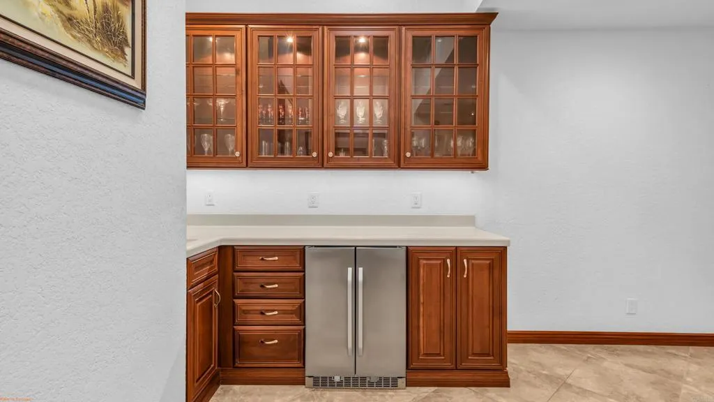 Stunning lakefront, golf-course property in the premier location of Chaparral Country Club! This beautifully renovated 3-Primary Suites, 3-bath condo offers panoramic views of the lake, tee, and green on the 9th hole. Thoughtfully redesigned from top to bottom within the last six years, no detail or expense was spared! Every finish is timeless, high-end, and impeccably curated. Enjoy 8-foot raised ceilings, ceramic tile flooring, a paver driveway and walkway, and an expansive tiled patio perfect for taking in the surrounding beauty. The gourmet kitchen features a dramatic 10-foot picture window, Corian countertops, a large island with custom roll-out storage, KitchenAid appliances, a state-of-the-art Samsung refrigerator, and a custom glass pocket door leading to the patio. The converted atrium offers additional living and entertainment space with a wine fridge, ice maker, glass-door cabinetry, and interior lighting. All bathrooms are luxuriously redesigned with spacious walk-in showers and premium fixtures. Additional upgrades include energy-efficient Pella windows with high-end shutters, remote-controlled roller shades on the living room sliders, a tankless water heater, NEW HVAC and a fully tiled 3-car garage PLUS a dedicated golf cart garage. Chaparral Country Club amenities include an 18-hole Ted Robinson Sr.designed golf course, 21 pools and spas, tennis and pickle-ball courts, a fitness center, and a clubhouse with dining and lounge options. This is a rare opportunity to own a fully renovated, lakefront golf-course home in one of the most coveted locations in the com