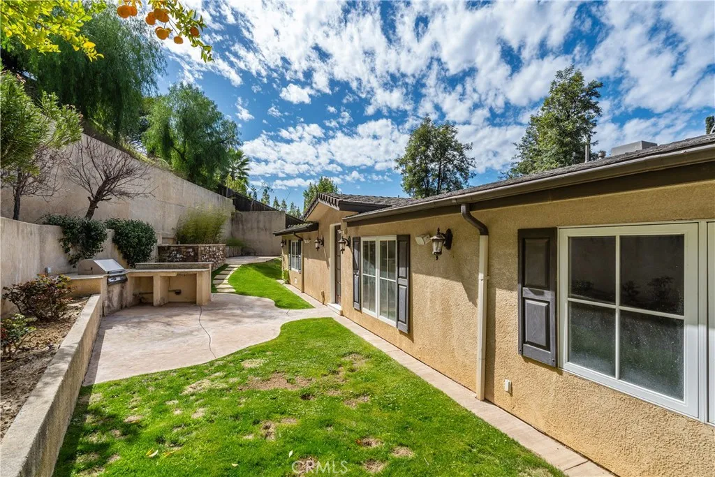 This remarkable 4-bedroom, 5.5-bathroom residence offers an exceptional combination of style, comfort, and practicality, with the added option to convert a room into a fifth bedroom. Situated in a serene neighborhood of Woodland Hills, this thoughtfully designed home features expansive living areas, premium finishes, and a seamless flow between indoor and outdoor spaces. Upon entering, youll immediately notice the open-concept floor plan, highlighted by bamboo flooring, soaring ceilings, and recessed lighting, creating a refined and inviting atmosphere. The gourmet kitchen is a true standout, offering custom wood cabinetry, granite countertops, a spacious center island, two full-sized sinks, top-of-the-line stainless steel appliances (including a Viking range), a built-in wine fridge, and two refrigeratorsideal for both everyday living and entertaining. Designed with versatility in mind, the home also includes a family/media room equipped with a full sound and speaker system, as well as a dedicated playroom or home office to accommodate your unique needs. The primary suite serves as a peaceful retreat, featuring vaulted ceilings, pendant lighting, a cozy sitting area with a fireplace, and a luxurious en-suite bathroom with a dual vanity, soaking tub, a steam-equipped glass-enclosed rainfall shower, and high-end finishes. Step outside to your private backyard oasis, complete with a built-in spa Jacuzzi, featuring a full spa experience with a heater and bubble jets. The backyard also boasts a BBQ area, beautifully landscaped surroundings, and mature fruit treescreating the pe