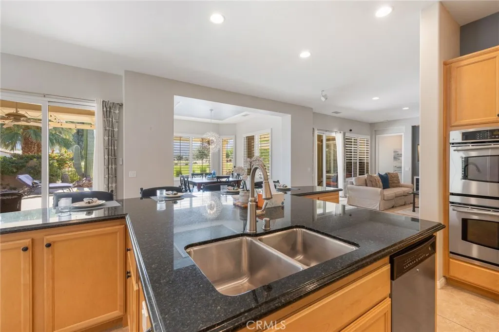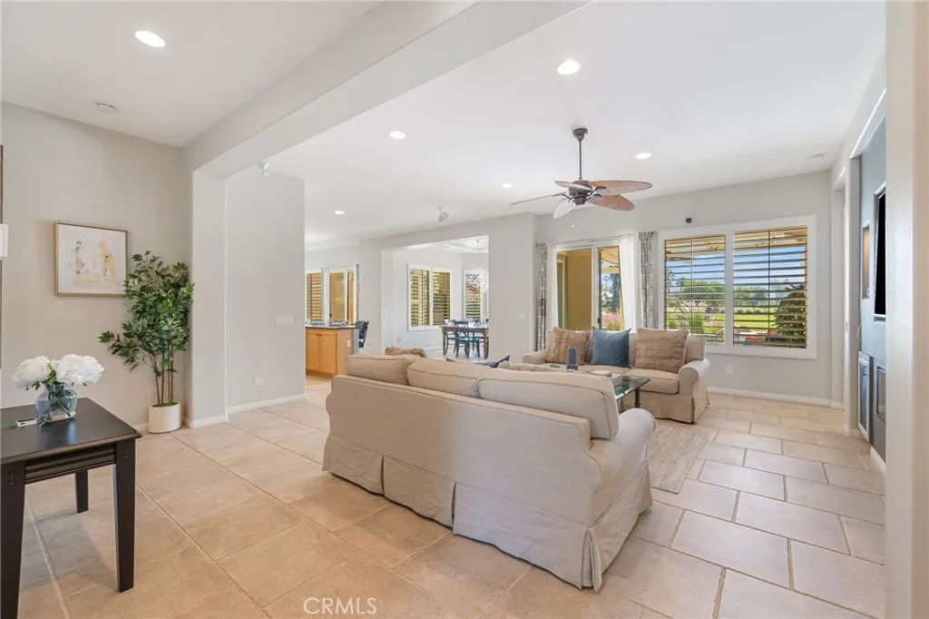 Discover one of the finest views in Trilogy La Quintas 55+ resort community. This exceptional Tamarisk modelwith over 2,700 sq. ft., 3 bedrooms, 4 baths, and a private casitaoverlooks two fairways and a serene lake, offering a truly breathtaking backdrop. Inside, the gourmet kitchen shines with stainless steel appliances, slab granite countertops, a large center island, trash compactor, custom stone backsplash, pantry, ceiling fans, and a cozy breakfast nook. The formal dining room captures beautiful views of the mountains and pool, perfect for elegant gatherings. The spacious great room is designed for comfort, featuring an entertainment niche, surround sound, ceramic tile flooring, and custom window treatments. A separate den can easily function as an additional sleeping space, and the powder room serves as a three-quarter bath for added convenience. The primary suite offers upgraded recently remodeled dual vanities, a large beautiful shower, and a walk-in closet. All bedrooms are upgraded with new carpet, custom drapes, insulating drop-down shades, ceiling fans, and updated fixtures. The casita is perfect for caretaker, guests or extended stays. Outdoors, enjoy beautiful dual paved patios with patio roof shade structures, framing a sparkling saltwater pool with waterfalls and rockwork, and spa ideal for relaxation or entertaining. The three-car garage comes fully outfitted with built-in cabinets, a workbench, and an evaporative cooler. A rare combination of luxury, comfort, all with one of Trilogys most remarkable views.