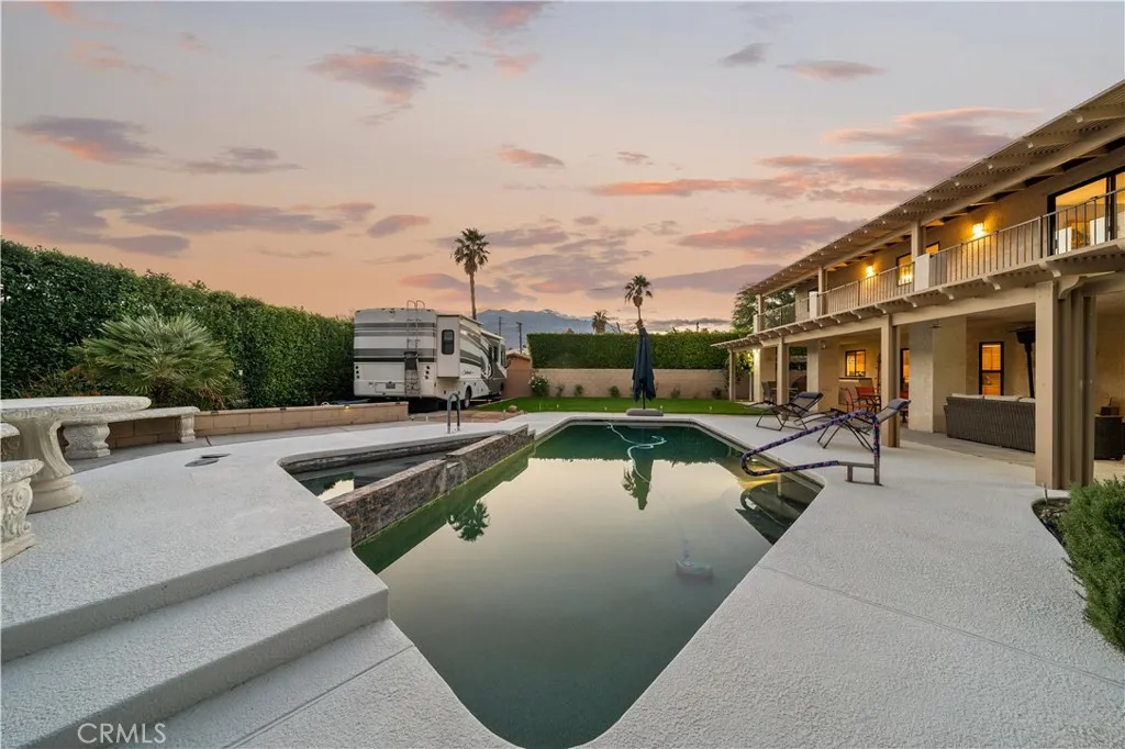 Welcome to this spacious two-story home offering approximately 2,641 square feet of comfortable living space, complete with a three-car garage and RV parking with dedicated power and concrete pad. This three-bedroom, two and one-half bath residence also includes a versatile bonus hobby room or office, ideal for work or creative projects. The open layout features a living room with cathedral ceilings, fireplace, along with a separate family room with fireplace and patio access. The kitchen includes solid hardwood cabinetry with pull-outs and reverse osmosis drinking water. The primary suite offers a walk-in closet, ceiling fan, dual sinks, soaking tub, separate shower, and private balcony showcasing beautiful mountain views. Additional comforts include ceiling fans in all bedrooms, ample storage throughout, and a well-appointed laundry room with utility sink and pet door. The backyard is an entertainer's dream with heated pool and spa, Alumawood patio covers on both levels, Kool Deck surfacing, gas BBQ hookup, privacy hedges, lawn, rose garden, and a large storage shed. Energy efficiency shines with 6 KW owned solar panels, evaporative coolers on both levels and recent upgrades including newer HVAC systems, tile roof underlayment, pool pebble-tec finish, updated pool equipment, water heater, and refurbished evaporative coolers. A prime opportunity to enjoy comfort, space, and outdoor living in a well-maintained home.