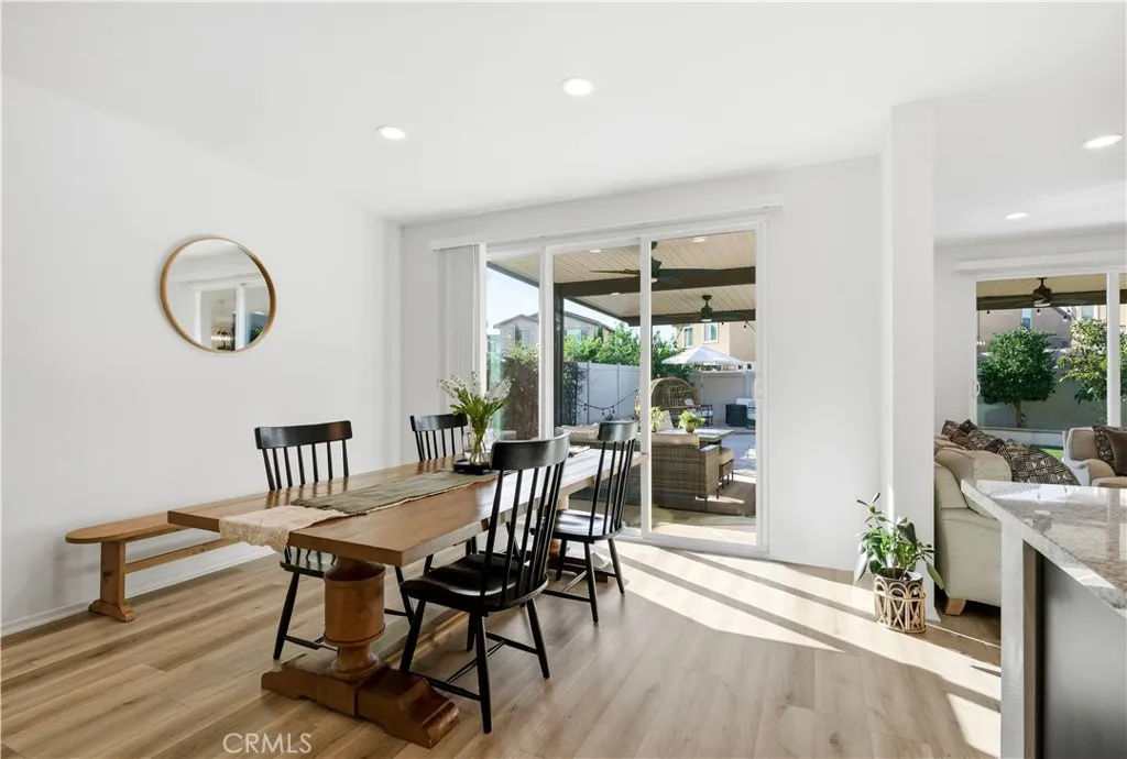 This move-in-ready home features an open floor plan, modern upgrades, and a low-maintenance outdoor living space. The kitchen includes espresso cabinetry, granite countertops, stainless-steel appliances, an oversized island with bar seating, and upgraded pendant lighting. The layout connects the kitchen, dining area, and living room, and includes an additional sliding glass door that increases natural light and access to the backyard. Interior upgrades include laminate flooring installed at purchase, updated light fixtures, a living room ceiling fan, and multiple TV mounts. The property is also equipped with 11 solar panels for improved energy efficiency. The second level offers spacious secondary bedrooms with large windows and ample closet space. The shared bathroom includes a dual-sink vanity with quartz counters and a separate shower and toilet room. The primary suite includes an ensuite bathroom with dual sinks, quartz countertops, and modern fixtures. An upstairs laundry room with a utility sink and storage cabinetry provides additional convenience. The backyard includes an aluminum patio cover with recessed lighting and ceiling fans, artificial turf, extended concrete work, a retaining wall, landscaping with trees, and a separate seating area with a firepit. The garage features a 240-volt electric vehicle charging outlet and overhead storage racks. Located within a well-maintained residential community with access to nearby parks, walking paths, shopping centers, schools, and commuter routes. This property provides a combination of functional upgrades and a flexible