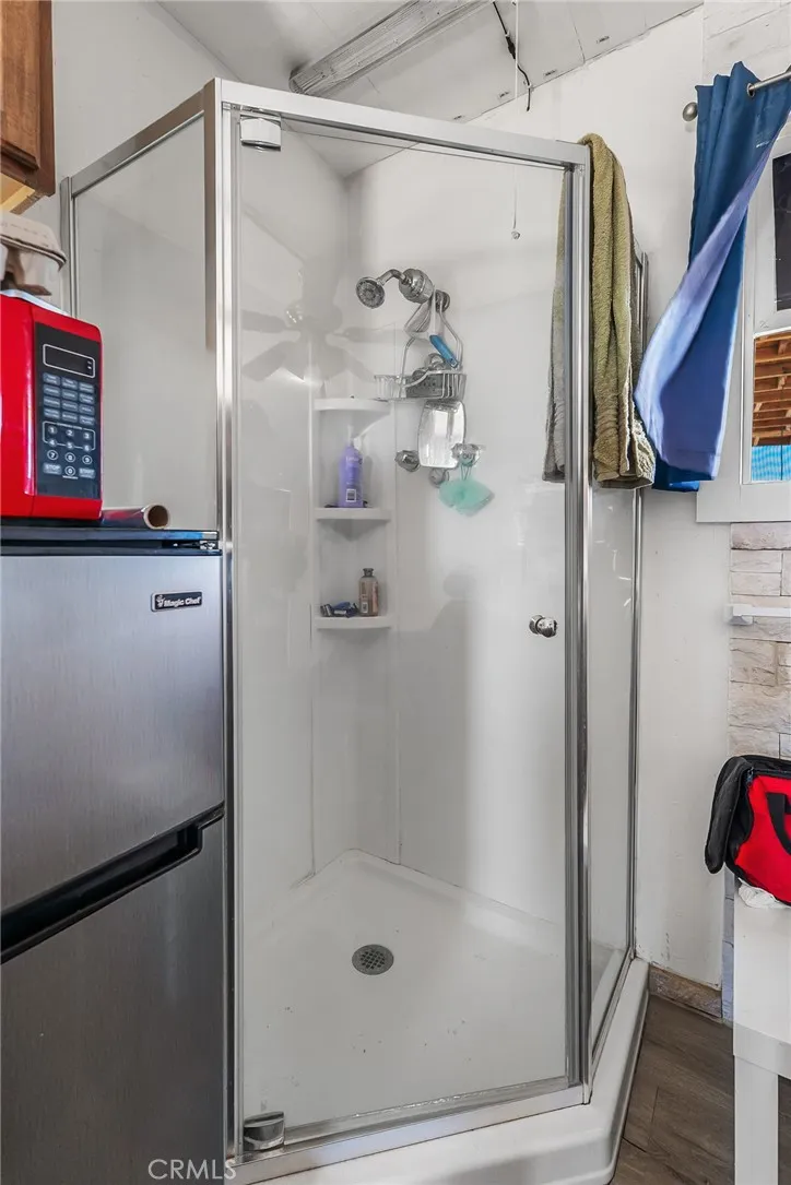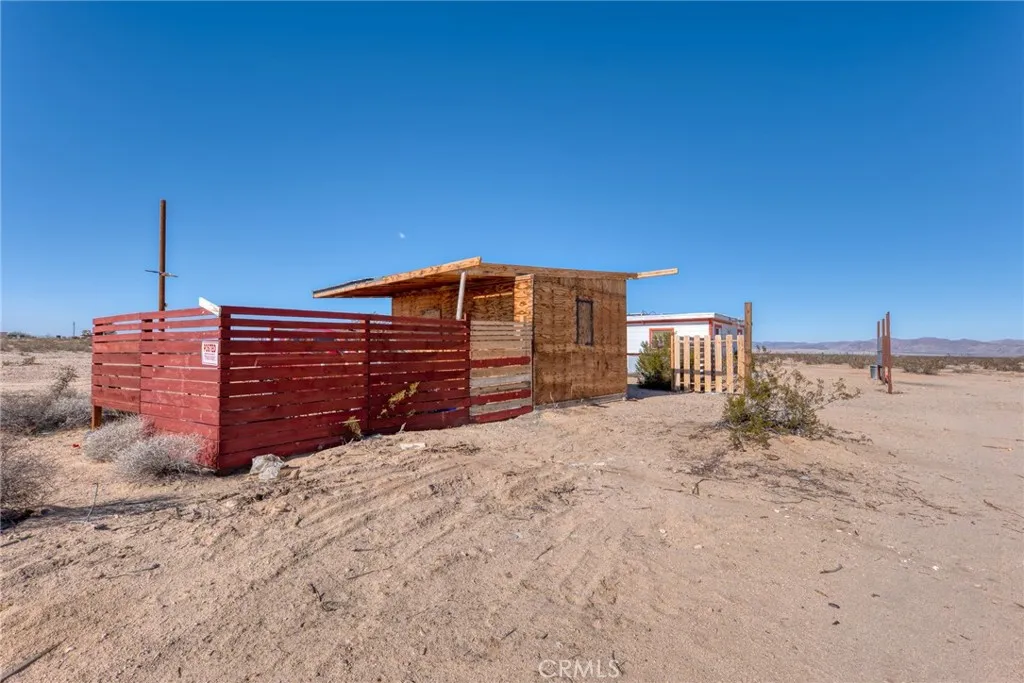 Escape to your own slice of the desert with this fun, funky, and fully unique recreational cabin in the peaceful outskirts of 29 Palms. Set on just over 3.75 acres and bordered by 75 acres of government land, this 400 sqft 1 bed/1 bath retreat delivers sweeping 360 degree views, incredible privacy, and that wide open High Desert feeling, while still being just a short drive to restaurants, shops, and the entrance to Joshua Tree National Park. Inside, the cabin offers a light-filled, open concept living and kitchen area with LVT flooring throughout. The compact kitchen includes a sink, small stove/oven, and mini fridge, along with a corner shower and a separate bathroom sink integrated into the living space, quirky in the best way. The bedroom features a brick accent wall, ceiling fan, mirrored closet doors, great lighting, and a private toilet area. Outdoor living shines with a wood carport/pergola for shaded lounging, a detached storage shed, corrugated metal fencing accents, and even an outdoor shower for rinsing off after a day of exploring the desert. Power is supplied by a 3,000 watt electric generator supported by solar panels, and water is provided by a 1,200 gallon U-Haul tank with a brand-new pump. The property is being sold AS-IS. Whether you're looking for a creative project, a weekend hideaway, or a base camp for desert adventures, this character-filled cabin puts you right in the heart of the Mojave, where starry nights, quiet mornings, and endless horizons await.