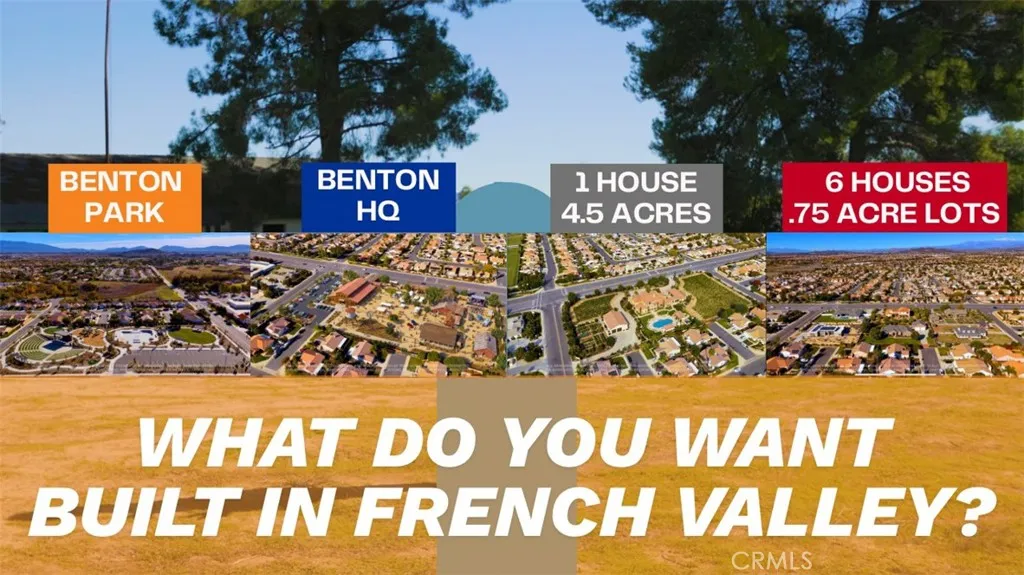 The Sunset Ranch on Benton provides ample opportunities. Currently zoned for a single-family home on 4.36 Acres, this property may present an opportunity for rezoning through the county of Riverside. Whether you are potentially subdividing into several smaller lots, hoping for a live and work environment, looking at the Sunset Ranch for the next city or county development project, or for the possibility of commercial revenue, The Sunset Ranch on Benton is centrally located on Benton Rd, the closest thing to a Main Street in French Valley. Benton Rd runs through French Valley, becoming Clinton Keith at the 79S, eventually hitting both the 215 and 15 Freeways.The property is also close to housing, shopping, and commercial development, and is mostly flat and usable. It sits in the heart of French Valley, on the Main Street, in an unincorporated community of Winchester, California. This area sits in the highly desirable Temecula Valley Unified School District.Here are some possibilities to consider if rezoning is achieved through the county. Renderings have been provided in the pictures. Option 1: Benton Park would follow the layout of several 5-acre parks throughout the country, with an amphitheater, playground, walking trails, and a skate park. This would be a great place for French Valley residents to gather with friends and family, or for community events. Id love to see the County of Riverside, or the City of Temecula, make this possible. Option 2: I call it Benton Headquarters, a shopping center like Vail Headquarters in Southern Temecula, which features several smaller l