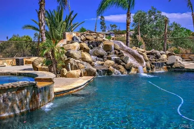 Perfectly situated for relaxed, luxurious Wine Country living, this custom estate includes both a stunning main residence and a spacious 2-bedroom guest house & massive RV garage. Set on nearly 5 acres with sweeping views. The primary home offers over 4,671 sq. ft. with a free-flowing floor plan, spacious bedrooms with vaulted and open-beam ceilings, rich wood flooring, and exceptional stone tile work throughout. The chefs kitchen impresses with stainless steel appliances, granite counters, double ovens, and a large walk-in pantryseamlessly opening to the warm, inviting family room highlighted by a dramatic floor-to-ceiling fireplace. The elegant primary suite is a retreat of its own, featuring a fireplace, wood-beamed ceilings, an expansive layout, and two private balconies overlooking Temecula Wine Country. The luxurious primary bath is beautifully appointed with dual sinks, a spa tub, walk-in closet, and refined finishes. An office with built-ins provides the perfect space to work from home. Step outside to your own private resort: a custom saltwater pool and spa with waterfall, slide, and diving board, plus an impressive outdoor kitchen complete with stainless steel appliances, refrigerator, granite counters, plasma TV, swim-up bar, fire pit, and custom tiki cover. The grounds are tastefully landscaped with extensive decking ideal for entertaining. A true equestrian estate, the property offers paddocks, covered turnouts, and a riding arena. The impressive workshop is paired with a HUGE RV garage, providing exceptional space for large coaches, car collections, or contrac