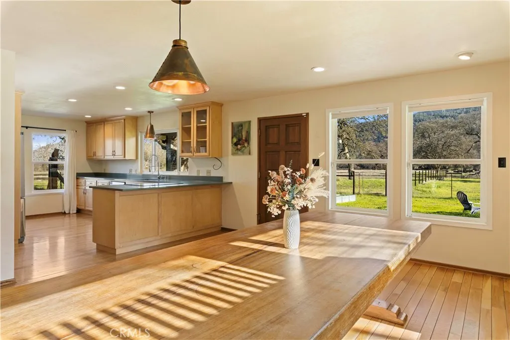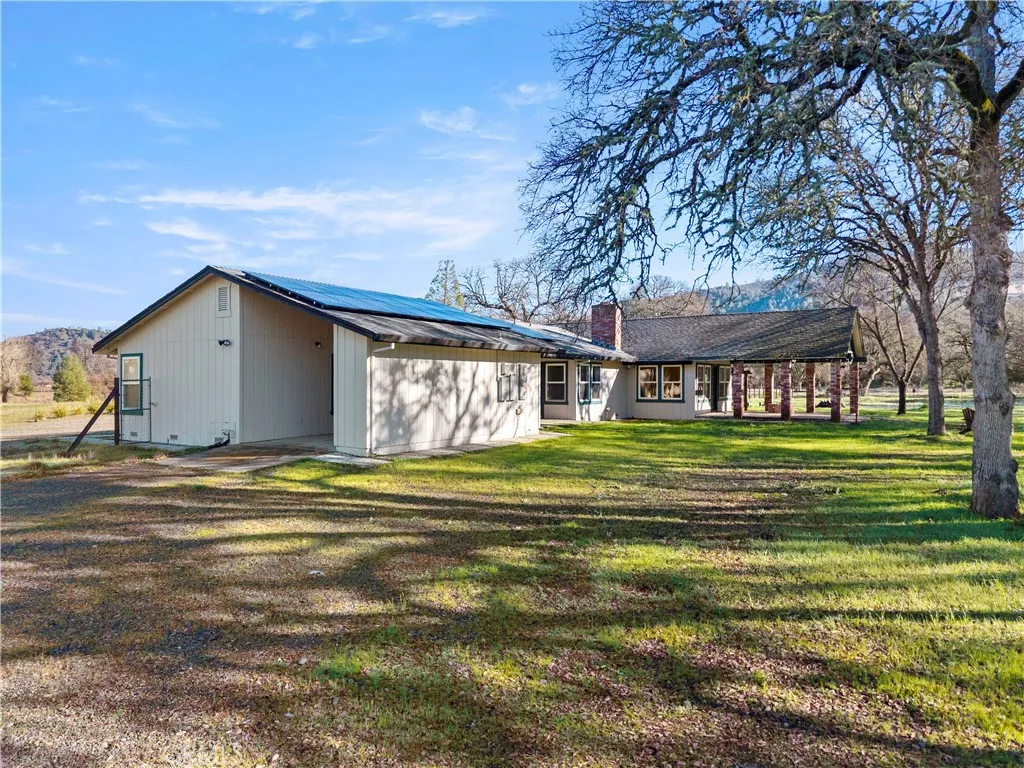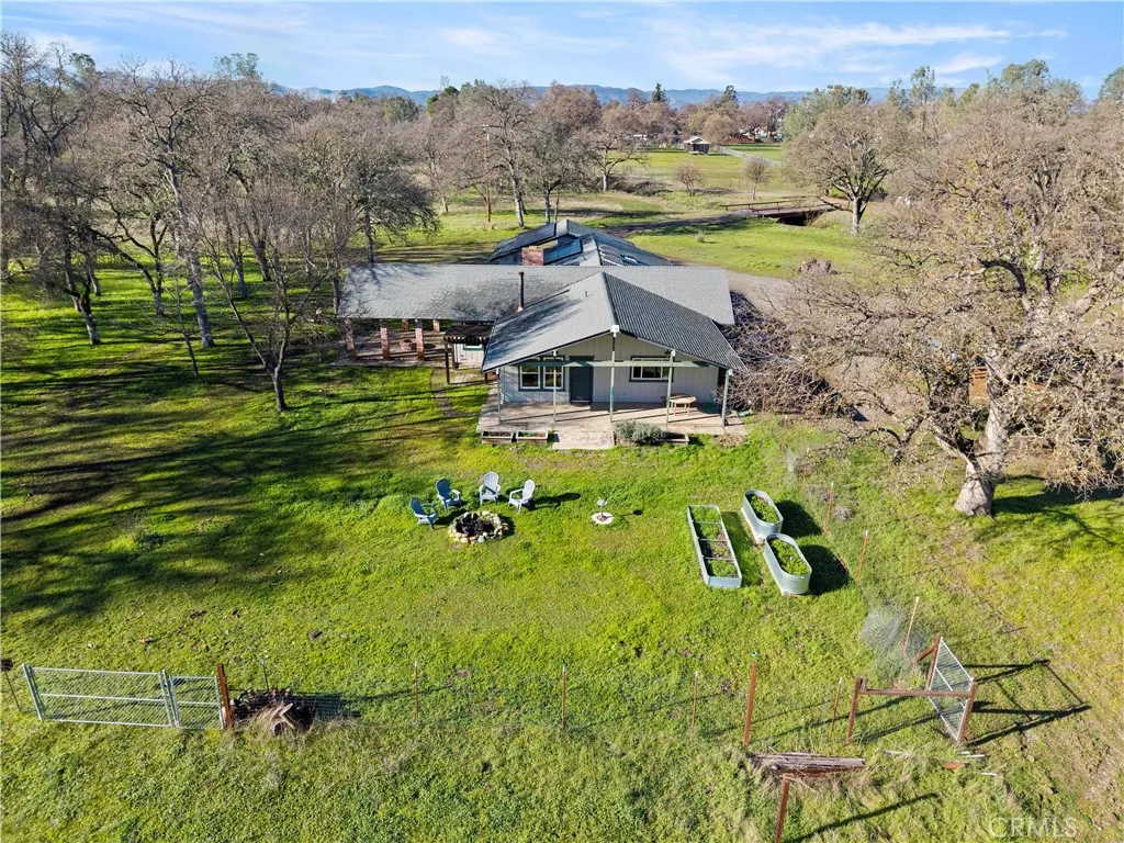 This heritage property is located near the heart of Kelseyville on 20 acres, just minutes from downtown, shops, schools, restaurants, and local wineries. The property offers 2,775 square feet of living space. The main home includes two bedrooms and two full bathrooms, while the guest suite features one bedroom and one bathroom with a separate entrance and direct access to the carport. The main home retains original hardwood floors and an open layout, with large picture windows overlooking mature oak trees and views of Mount Konocti. The kitchen has been recently updated with quartz countertops and stainless steel appliances. A large breakfast nook, which can also serve as the dining area, provides abundant natural light, peaceful views, and a wood-burning stove. The living room is spacious and open, featuring a wood-burning fireplace, custom built-in bookcases, and access to the covered back patio. The property offers a balance of convenience and privacy. A seasonal creek runs through the land, and a sturdy bridge provides access from the private road to the residence. All 20 acres are level and usable, with an irrigation well, cross-fenced pens, a chicken coop, and multiple storage sheds. The land is suitable for gardening, small-scale agriculture, or 4-H projects. A recently installed, fully owned photovoltaic system adds long-term utility and efficiency.