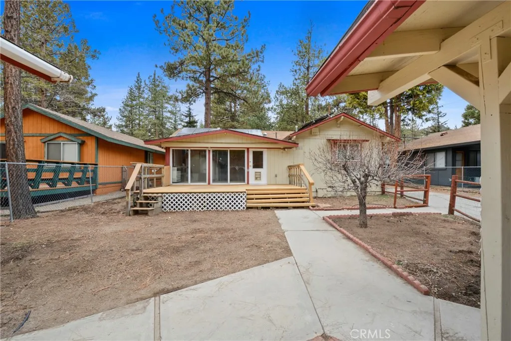 Welcome to this charming single-level mountain retreat in Big Bear City, set on an expansive lot surrounded by mature trees and outdoor living spaces. This well-maintained 2-bedroom, 1-bath single-family home offers comfort, character, and flexibilityideal as a full-time residence, weekend getaway, or investment opportunity. Both bedrooms feature ensuite bathrooms, providing privacy and convenience. The living room is warm and inviting with tongue-and-groove pine, skylights, a ceiling fan, and a recently installed fireplace insert for cozy mountain evenings. A swamp cooler helps keep things comfortable in warmer months, and the included wood rack adds both function and rustic charm. The kitchen blends vintage appeal with modern updates, featuring classic cabinetry, a breakfast bar, built-in cooktop, oven/broiler, new stainless-steel dishwasher, and a newer stainless-steel refrigerator. Indoor-outdoor living shines here. An 8-foot sliding glass door opens to a beautiful redwood porch, perfect for relaxing or entertaining. The primary suite includes access to an enclosed patio with a wall heater, which also houses washer/dryer hookups with a gas connection. The rear patio features durable Trex decking, and the property is enhanced by apple, apricot, and pear trees, along with a stately blue spruce. Additional exterior highlights include a 2-car garage with two doors, gas and water already run to the garage, offering a potential ADU conversion (Buyer to verify with local authorities.), and a wood/garden shed with a concrete floor. With its generous lot size, thoughtful updates