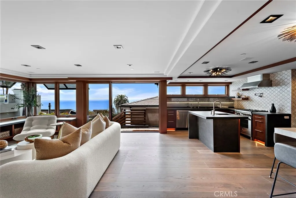 A Seacliff architectural masterpiece nearly oceanfront with deeded beach access, formerly owned by Charlie Chaplin. Four years in the making, this newly reconstructed historic Laguna Beach Craftsman cottage pays respectful homage to its original design while being thoughtfully reimagined with modern engineering, elevated materials, and coastal elegance. Set on an elevated parcel within the Seacliff community adjacent to its oceanfront neighbor, the home enjoys rare commanding panoramic ocean views spanning from Palos Verdes Peninsula, across Catalina Island, and down to Three Arch Bay. Only an estimated three percent of ocean close Laguna Beach homes offer both up coast and down coast views from well within the interior. Beyond a gated entry, a beautifully designed outdoor living space blends seamlessly with the interior, ideal for alfresco dining, morning coffee, or sunset cocktails overlooking the Pacific. With rare direct deeded access to Table Rock Beach just 30 feet from the front door via gated stairs, the ocean is truly at your feet, with sunsets and ocean views from nearly every room. Garages are located at street level with main and upper living spaces above, each offering ocean views. While select original studs were preserved to retain grandfathered benefits, the home is otherwise newly constructed and modernized, including a new foundation, steel beams, and updated systems. The main level features a spacious living room, dining area, and open concept chefs kitchen with Bertazzoni appliances, Blanco sinks, and imported Dekton countertops, along with a walk in pan