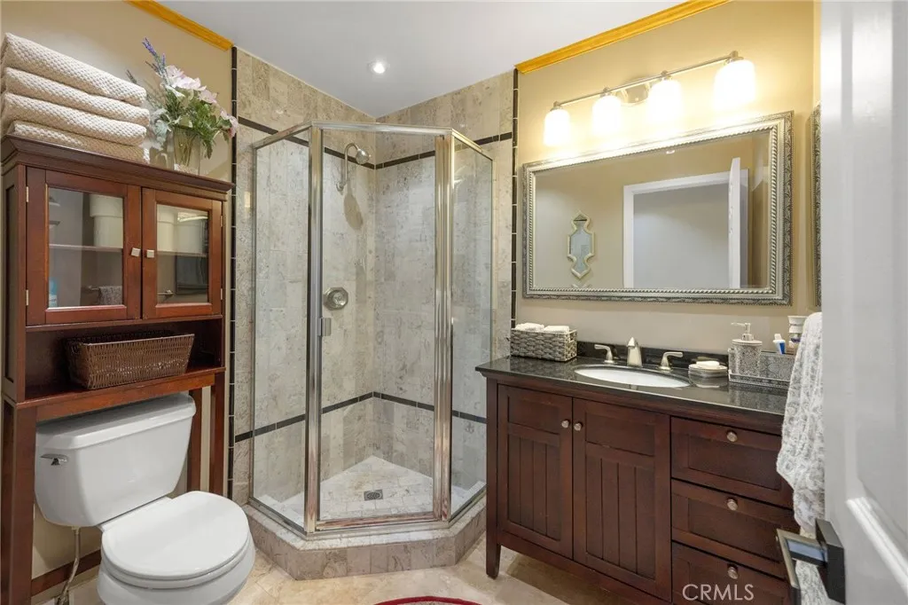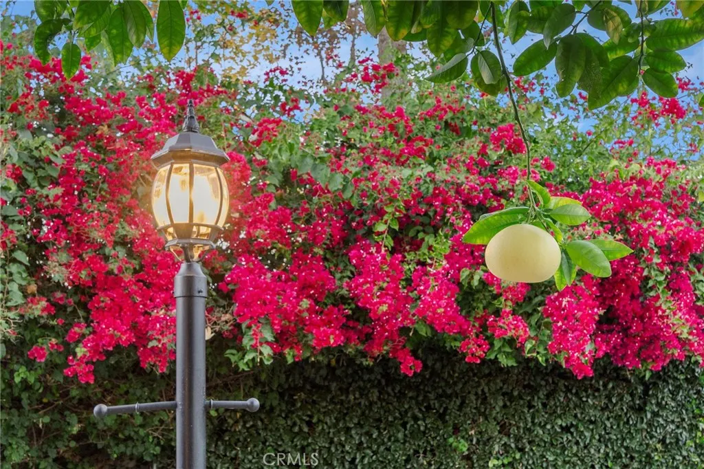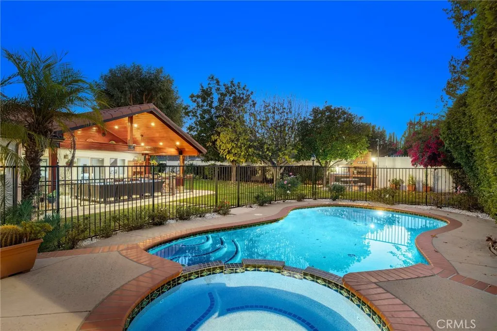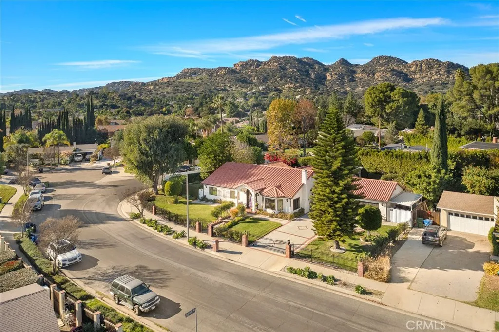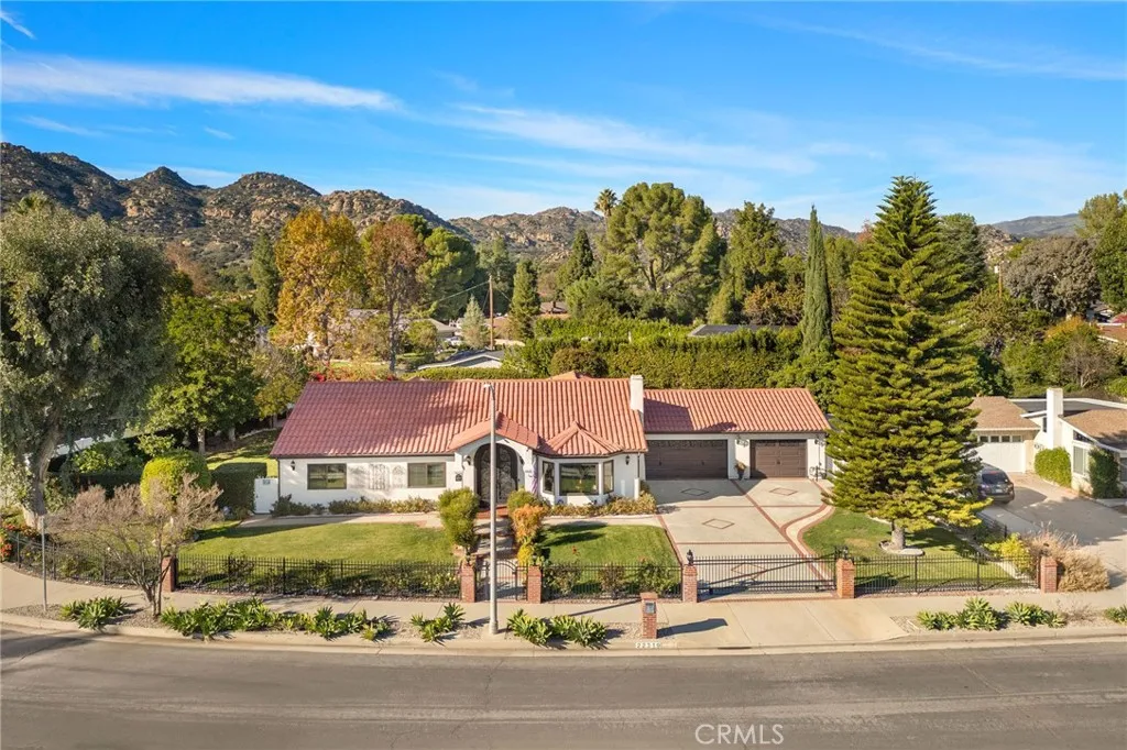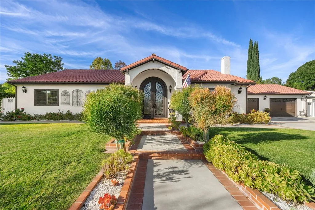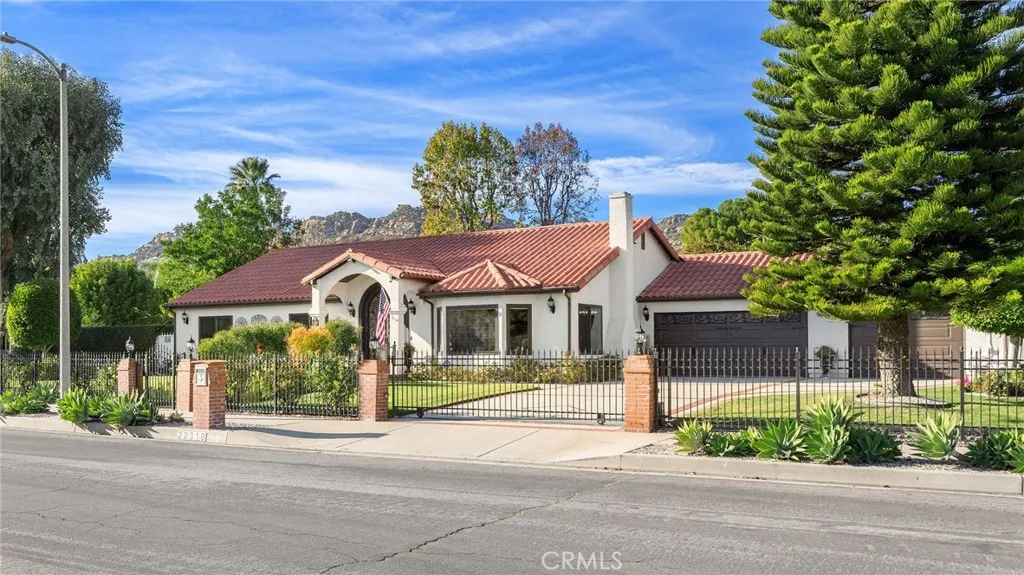 Gated, corner lot single-story home with a three-car garage located in one of Chatsworths most desirable neighborhoods, where homes rarely come on the market. Offering nearly 3,000 sq ft of living space on an expansive lot of over 16,000 sq ft, this well-maintained residence provides space, comfort, and inviting indoor-outdoor living. Upon entry, dramatic smoked-glass and wrought-iron double doors welcome you into a warm and thoughtfully updated interior featuring a combination of polished travertine flooring with designer insets and high-quality oak hardwood floors. The home has been recently refreshed with new interior paint and updated hardware in 2025, while longtime owners have consistently maintained and upgraded the property over the years. The floor plan includes formal living and dining rooms with fireplace, a spacious family room with backyard access and views, and a functional kitchen with oak cabinetry, slide-out storage drawers, and a breakfast bar. The home offers four bedrooms and is currently configured as a three-bedroom, with easy potential to convert back. The oversized covered lanai is a standout feature, offering space for both a full seating area and dining area, and is finished with stained wood ceilings, recessed lighting, and ceiling fans. The backyard includes a pool and spa (resurfaced 2023), new pool equipment (2023), outdoor kitchen, separate gazebo/sunning area, large grassy lawn, mature trees and lush greenery creating a private feel, and a fenced dog run with a recently updated canine cabin. Additional features include electric gates, Milgard