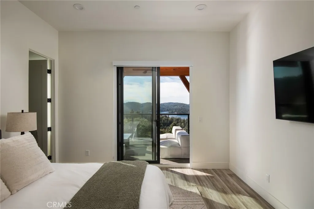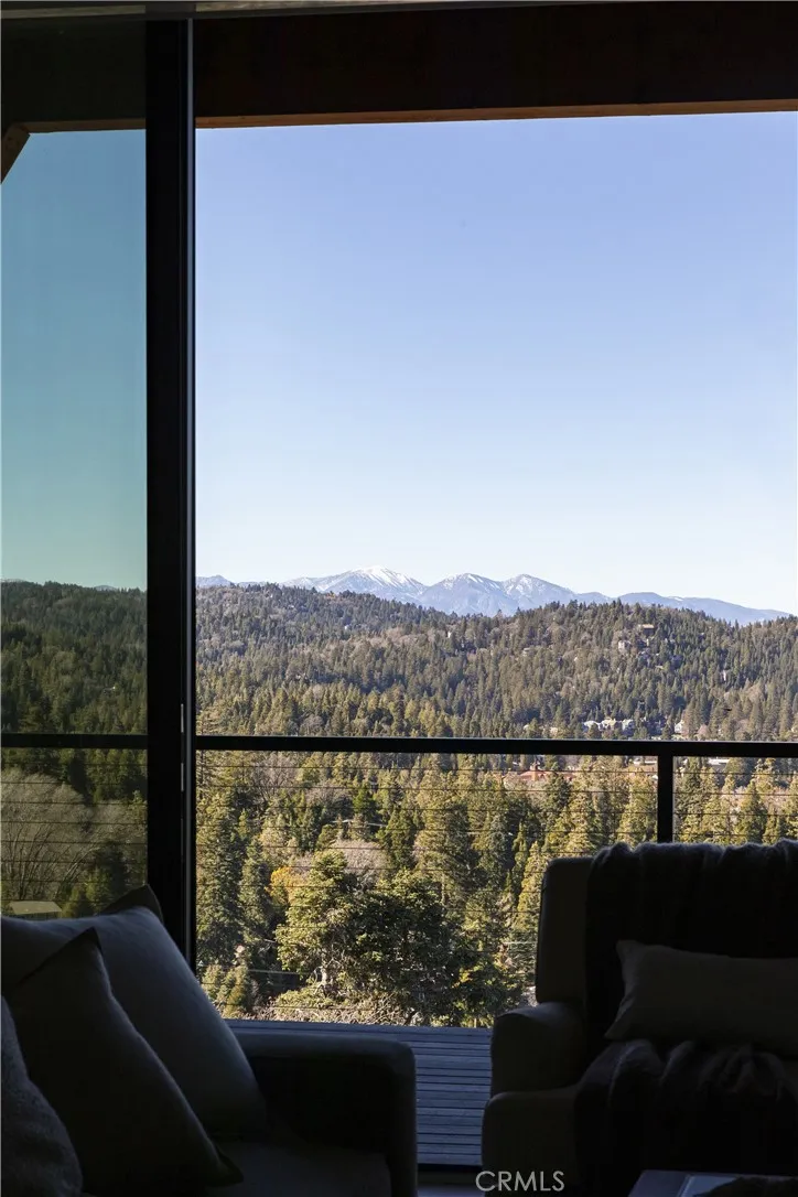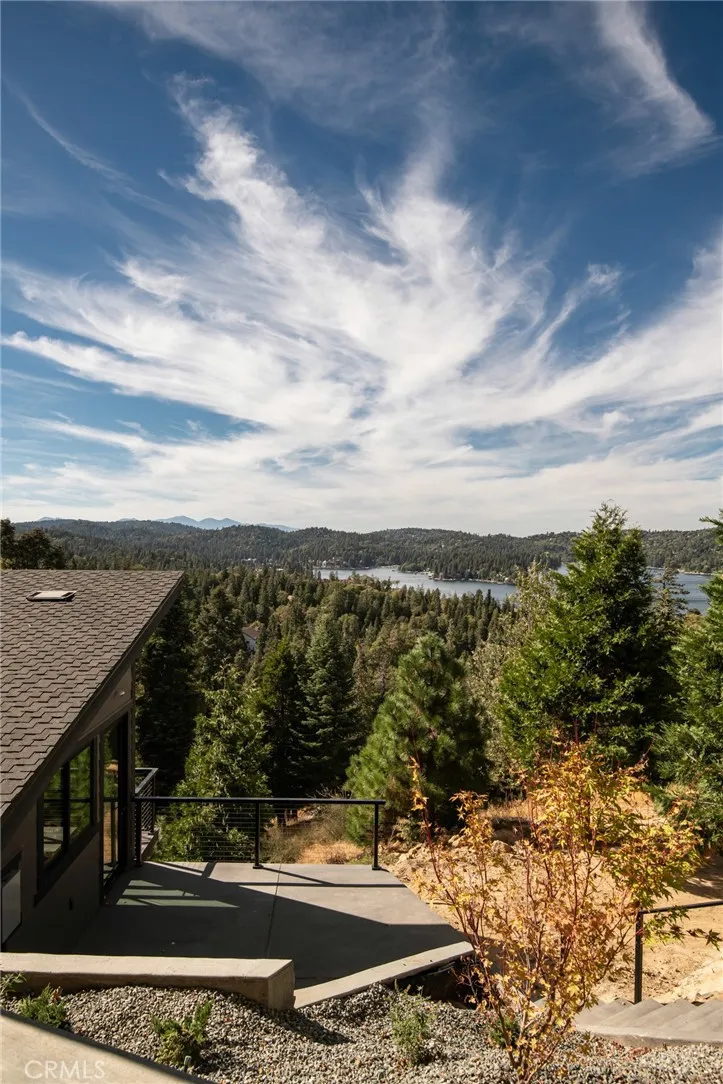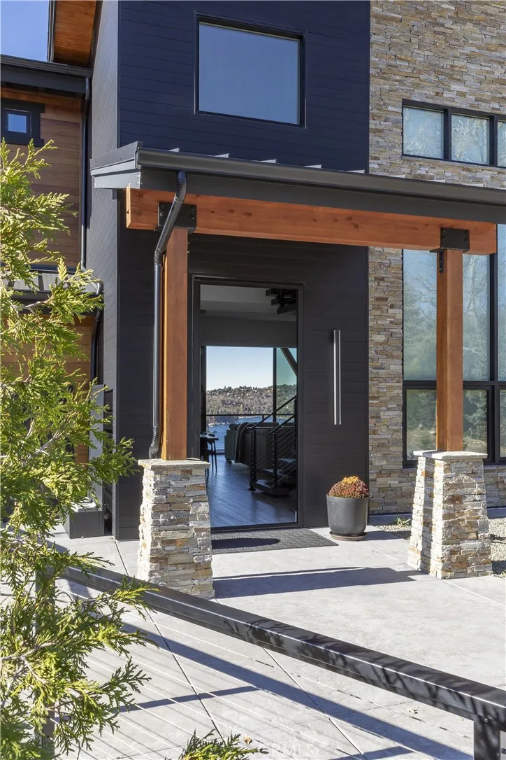 Welcome to your Aspen inspired mountain contemporary residence in Mill Pond, a prestigious gated community in Lake Arrowhead. Imagine waking up each day in this recently built residence, perched at the top of a quiet, private cul-de-sac offering privacy, level entry, and a rare two car garage. Offering panoramic 360 degree views, this one of a kind setting captures sweeping lake vistas, snow capped mountains, mature trees, and dramatic ridgelines rarely found in Lake Arrowhead. The architecture blends refined mountain modern design with natural materials including stone, wood, stucco, and Hardie board siding, creating a timeless yet contemporary presence. The property includes a detached casita ADU with its own kitchenette, bedroom, and bathroom. The ADU has an active short term rental permit and has been a successful income producing rental, ideal for guests or additional income. The main level is designed as an open concept entertainment space connecting the kitchen, dining, and living areas. Expansive sliding glass doors open to large decks with panoramic lake views, creating effortless indoor outdoor living. A sleek fireplace anchors the living room. A two person elevator provides easy access between levels or can function as a dumbwaiter. The upper level features the primary suite with fireplace, private deck, spa inspired bath with soaking tub and view window, plus laundry and office space. The lower level offers a second living area with fireplace, a third expansive deck, two ensuite bedrooms, and a spacious game room. Mill Pond offers a refined mountain lifestyle wi