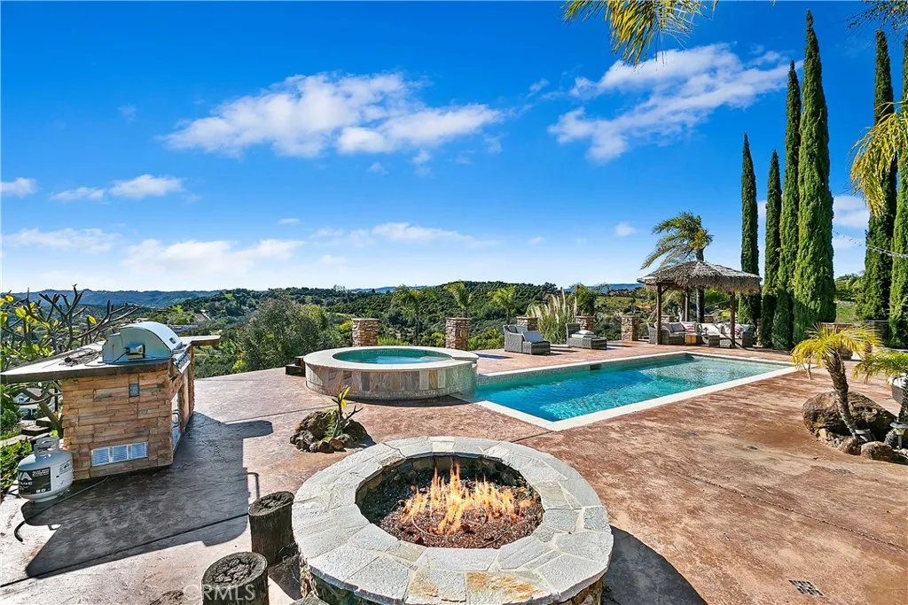 Luxury at its finest with this stunning De Luz Estate pool home. This gorgeous property also includes a 1200+ Sq. Ft. guest house with 2 bedrooms 2 bathrooms and a 2 car garage and pool of it own, all just minutes from Old Town Temecula, schools, shopping, dinning, freeway and entertainment. You will be in awe at the spectacular 360 degree views from every room throughout this stunning 4,861 sq. ft. estate home, positioned on a over 5+ acres of impressive land. As you drive up the private driveway, enjoying the breathtaking views, you'll come upon an orchard that consists of mango and grapefruit trees, you'll then pass by a lovely guest home, excellent potential rental opportunity or for guests, friends or family to live in. When entering the main home through the double front doors, you'll immediately appreciate it's grand scale, with the beautiful scrolling iron banister, coffered ceilings, exquisite woodwork, hardwood flooring, and open floor plan with every bedroom consisting of their own bathrooms. Enjoy a cozy evening by the fire, reading a book, or chatting with friends in the lounge/den with beautifully crafted full wall, wood, built-in wine racks and cabinets, granite counters, and wainscot throughout. This room is a must see! Looking to entertain, then you'll enjoy the huge family room, formal dining room and beautiful kitchen with eating area with never ending views. Need room for guests, no problem, down the hallway you'll find a bedroom with walk-in closet and a full bathroom. There is also a separate powder room conveniently located off of the family room and