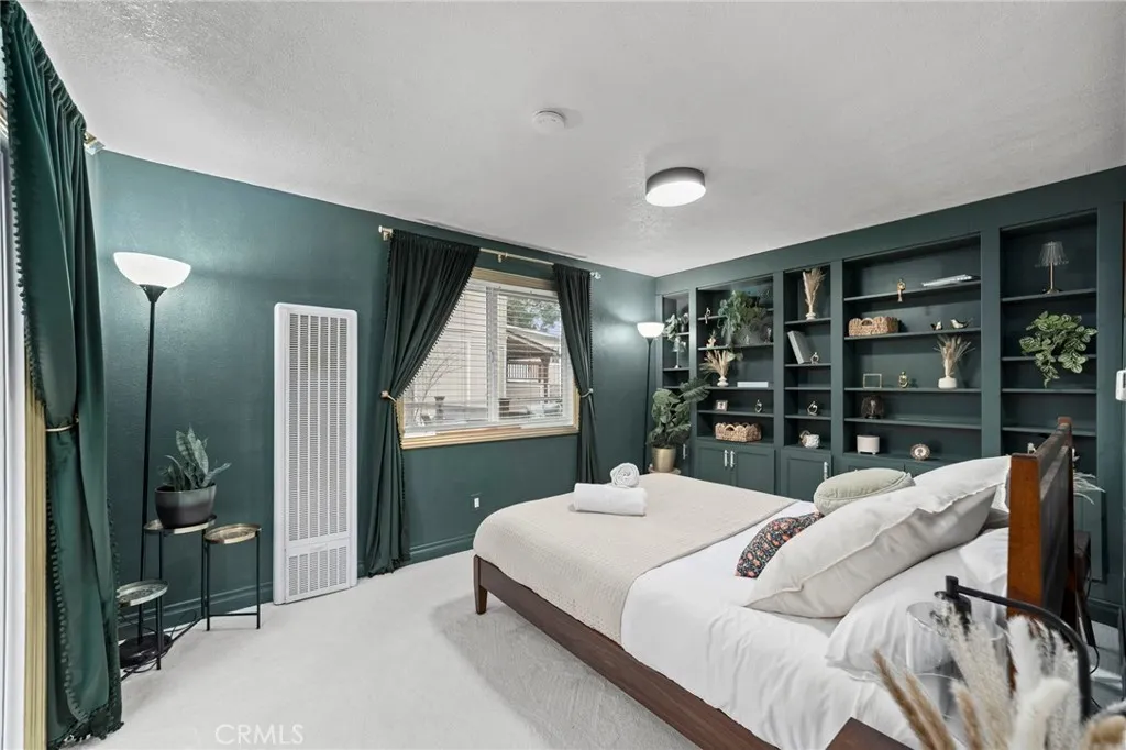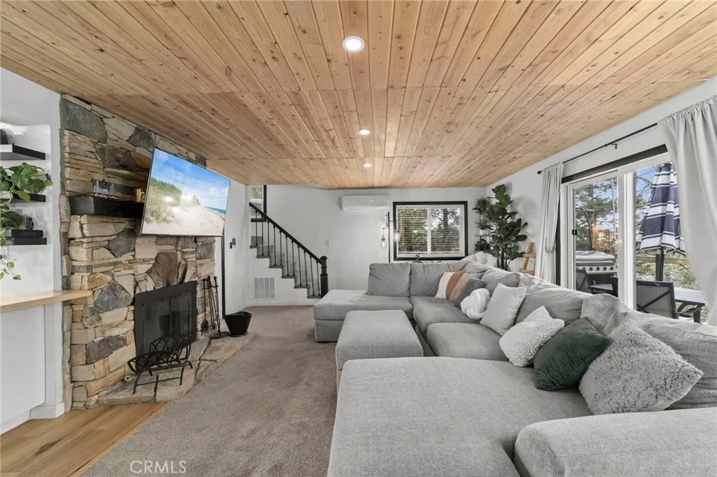 Tucked among the trees, this beautifully updated Lake Arrowhead cabin perfectly blends modern upgrades with timeless mountain charm. An oversized front deck welcomes you inan ideal space for relaxing, entertaining, or simply soaking in the peaceful forest surroundings. Inside, the bright and airy entryway features a wall of pantry and storage cabinets, along with a cozy breakfast nook offering space for a coffee bar. A newly installed window fills the home with abundant natural light. The renovated kitchen boasts quartz countertops, a peninsula with a custom butcher-block top, a stainless steel sink, and newer flooring. It opens seamlessly to the living room, where a stone fireplace, tongue-and-groove ceiling, recessed dimmable lighting, and a mini-split system create a warm and inviting gathering space. Sliding glass doors lead to the rear deck, complete with newer railings and serene treetop views. The first-floor bedroom feels like a private retreat, featuring built-in bookshelves, a sliding glass door with direct access to the rear deck, newer ceiling fixture, and updated blinds. A beautifully updated first-floor bathroom offers a walk-in shower. Upstairs, the primary bedroom provides a cozy escape, highlighted by a unique open-concept soaking tub set atop real hardwood floorsperfectly complementing the mountain setting. An additional bedroom, half bath, and ample storage complete the second level. Outside, newly renovated exterior steps lead to the backyard and build-up area, which includes laundry and generous space for additional storage. Situated on a quiet cul-de-s