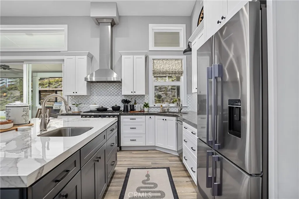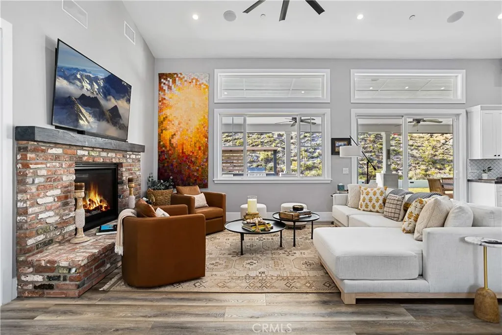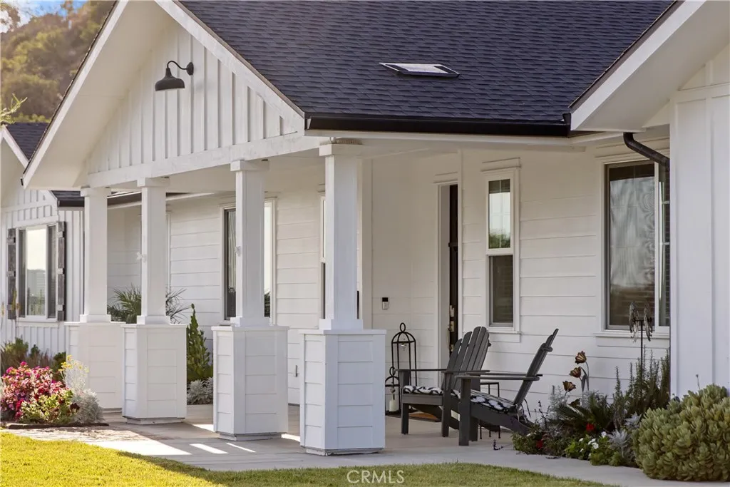 Refined modern farmhouse estate built in 2019 and situated on 4.5 private acres in the prestigious De Luz area of Temecula. This exceptional property offers privacy, sophistication, and panoramic valley and hillside views with resort-style outdoor living. The backyard is a true showpiece, featuring a custom pool and spa positioned to capture expansive valley views, a covered patio ideal for entertaining, an outdoor kitchen, and professionally designed hardscape and landscaping. Automated irrigation, landscape lighting, and a fenced pool area enhance convenience and privacy. Inside, the open-concept great room showcases vaulted ceilings, abundant natural light, Milgard Tuscany windows, luxury vinyl plank flooring, tall baseboards, and a custom fireplace. A whole-house audio system extends throughout the interior, patio, porch, and garage for seamless indoor-outdoor living. The custom kitchen features an oversized island, quartz countertops, tile backsplash, soft-close cabinetry, stainless steel appliances, and a Caf Professional electric oven. The adjacent dining area is plumbed for a wet bar or coffee station. The home offers 4 bedrooms and 3 upgraded bathrooms, including a private office with French doors. The primary suite includes 9-foot ceilings, a custom walk-in closet, and a spa-inspired bath with dual vanities and an oversized dual walk-in shower with rain heads. Additional highlights include owned solar, tankless and new water heaters, whole-house fan, Lifesource whole-home water system, whole-home alarm system, EV charging-ready outlet, owned Starlink system, and e
