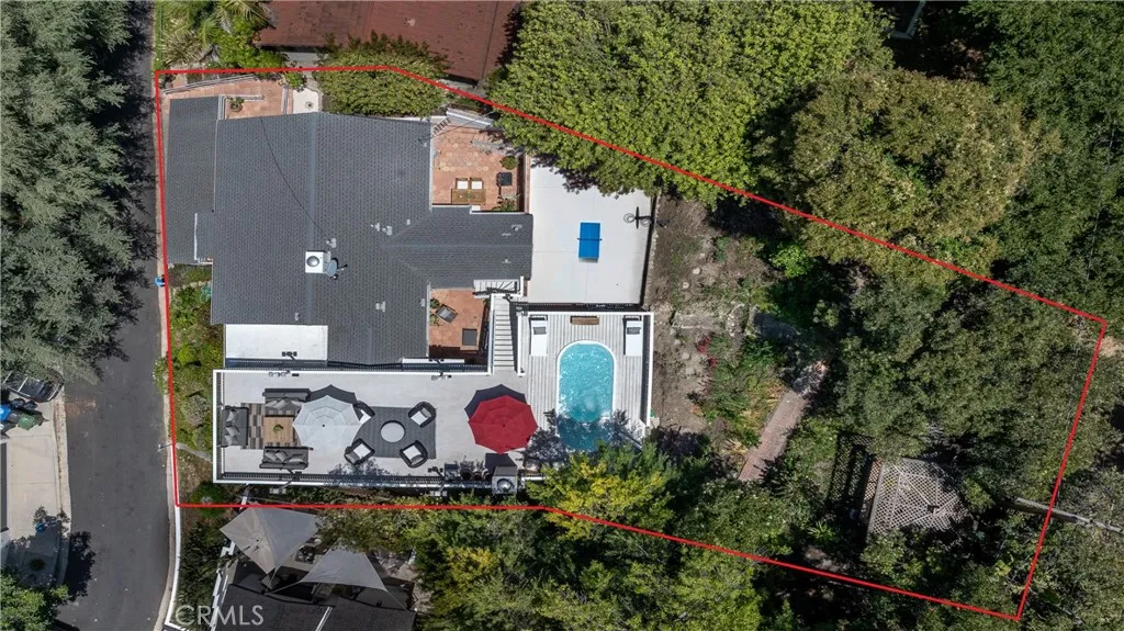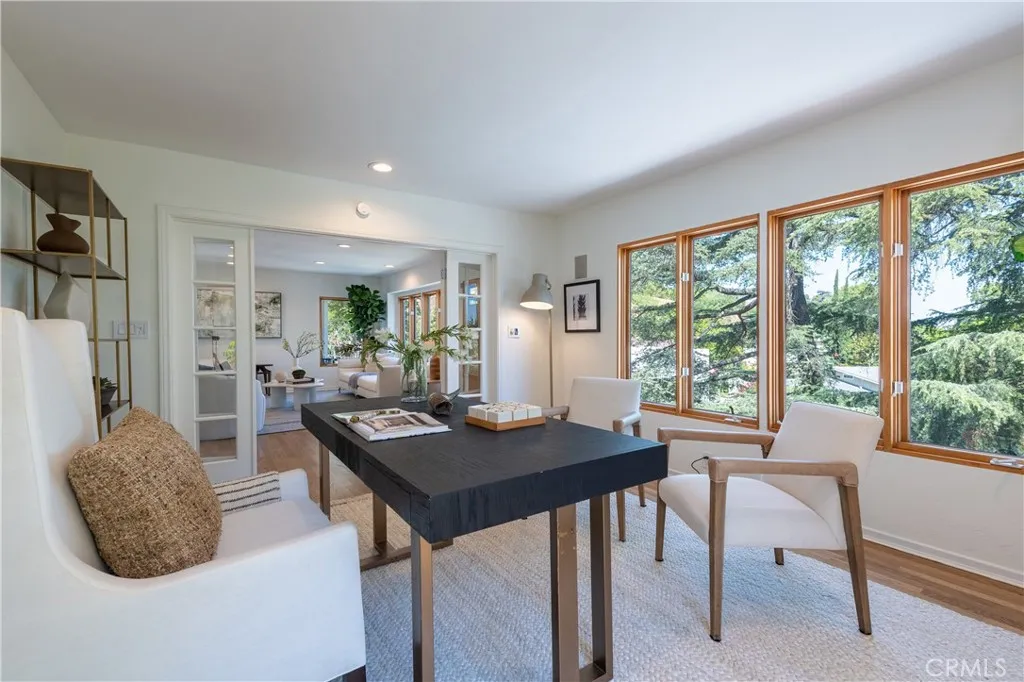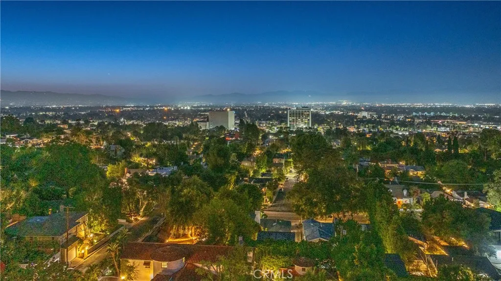 Set on a quiet, sought-after street south of the Boulevard in Sherman Oaks, this elevated hillside residence offers exceptional privacy, treetop views, and a serene retreat-like setting. Designed for entertaining, the property features multiple outdoor spaces, including patios, a sports court, a gazebo, and an expansive approximately 900-square-foot deck with pool, spa, lounge areas, and sweeping mountain and valley views. The home flows seamlessly indoors to multiple inviting living spaces, including a family room with exposed wood beams and a fireplace, a living room with another fireplace ideal for intimate gatherings, and enjoying the tree-top views. The updated kitchen features porcelain tile flooring, refreshed countertops, and premium stainless-steel appliances by Wolf, Dacor, and Bosch, with a breakfast nook and bar seating opening to outdoor dining terraces. The primary suite offers a private sanctuary with a sitting area, balcony, and renovated spa-style bath. Two additional bedrooms provide flexibility, including one with patio access and one currently used as an office. Located within the Sherman Oaks Charter Elementary School District and near scenic hiking trails, this home delivers a peaceful hillside escape with convenient access to the Westside and Ventura Boulevard.