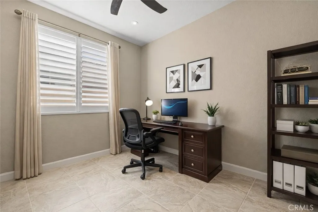 **BACK ON MARKET, NO FAULT TO SELLER** Welcome to resort-style living in the highly sought-after Solera Diamond Valley 55+ community by Del Webb. This well maintained home offers a perfect blend of comfort, style, and an active lifestyle, featuring two bedrooms, two bathrooms, a dining room, and a versatile office or den ideal for work, hobbies, or guests. From the moment you arrive, the homes inviting curb appeal sets the tone with drought-tolerant landscaping, an added front walkway, and elegant stone accents that add depth and character. Step inside to soaring 10-foot ceilings, plantation shutters throughout, recessed LED lighting, and thoughtful details that create a designer-inspired feel. Ceiling fans in the living room, primary suite, and covered patio enhance comfort, while ample hallway storage adds everyday convenience. The floorplan is thoughtfully designed to offer both formal and open living spaces. The kitchen is a standout, featuring a large center island, granite countertops, black stainless steel appliances, glass-front accent cabinetry, upgraded lighting, under-cabinet lighting with dimmer, and a spacious pantry. The primary suite is a true retreat with charming bay windows, an oversized walk-in closet, and a well-appointed ensuite bath with dual sinks and a step-in shower. A separate laundry room with additional storage adds to the homes functional design. Step outside to a backyard built for relaxation. Living in Solera Diamond Valley means enjoying exceptional amenities, including a stunning community center with a fitness center and walking track, indo