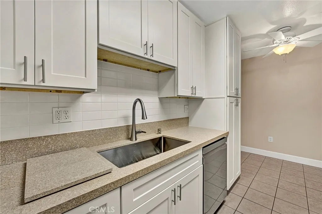 Welcome to MacArthur Village, a 24-hour gate-guarded community in the heart of highly desirable South Coast Metro area. This newly remodeled upper-level, corner one-bedroom, one-bath condo offers an open, airy feel with vaulted ceilings, abundant natural light, and a clean, modern palette. The updated kitchen features quartzite countertops, a white tile backsplash behind the oven and sink, new white Shaker cabinets, and a custom matching storage cabinet for exceptional functionality. Brand new stainless-steel appliances include a stove/oven, oven hood, refrigerator, and dishwasher, complemented by a Farmhouse-style stainless sink, new faucet, disposal, updated plumbing, and a pull-out four-shelf custom spice rack for added convenience. A ceiling fan accents the dining ell. The bathroom renovation includes new cabinetry with quartzite countertops, a new sink and faucet, beveled mirror, medicine cabinet, updated tub/shower fixtures, new towel racks, and safety grab bars in shower. The spacious bedroom boasts a large walk-in closet with shelving, while a floor-to-ceiling hallway closet provides ample linen and storage space. Additional upgrades include newer installed Renewal by Anderson sliding door, windows, and screens, along with waterproof luxury vinyl flooring and modern 6-inch wood baseboards throughout. Enjoy sunrises and sunsets from the private living-room balcony, perfect for relaxing or entertaining. Residents enjoy resort-style amenities: beautifully landscaped grounds, meandering walking paths, swimming pool and spa, fitness center, two tennis courts, basketball