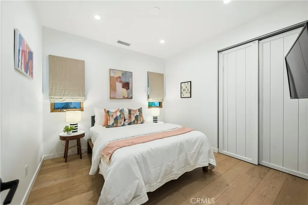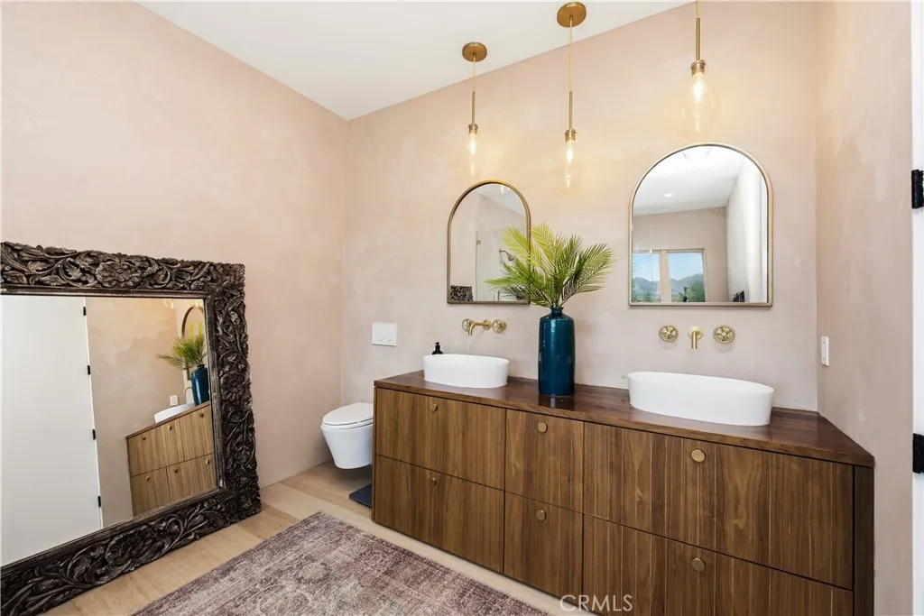 Set on a private and secluded flag lot, this extraordinary single story Westlake Village retreat was completely reimagined in 2021, blending architectural sophistication with warm, livable spaces and unforgettable views. A true hidden gem, the home has been transformed with custom Weather Shield windows throughout and expansive sliding doors spanning the entire main living area - creating a seamless fusion of indoor and outdoor living. Inside, white oak flooring (engineered) flows through an open-concept layout where the kitchen, dining area, and great room are all oriented to capture sweeping mountain, sunrise, and sunset vistas. The Italian-designed kitchen is a masterwork of style and function, featuring a walk-in pantry equipped with its own HVAC, custom cabinetry, and top-tier appliances including a Gaggenau induction stove with an additional gas burner, Miele oven and refrigerator, Fisher & Paykel dishwasher, and Thermador wine refrigerator. A thoughtfully engineered climate system includes multiple mini-split units throughout the home, ensuring individualized comfort in every space. Whole-home Sonos audio, Cat 6 wiring, and a robust security network with 20 cameras for additional peace of mind. A separate laundry room adds everyday practicality. A sprawling balcony connects the primary suite, media room, secondary bedroom, and main living spaces, creating a continuous indooroutdoor experience. The primary suite offers a sanctuary with a walk-in closet, sitting area, and a spa-caliber bath featuring a marble shower/tub floor and microcement walls - a striking retreat.