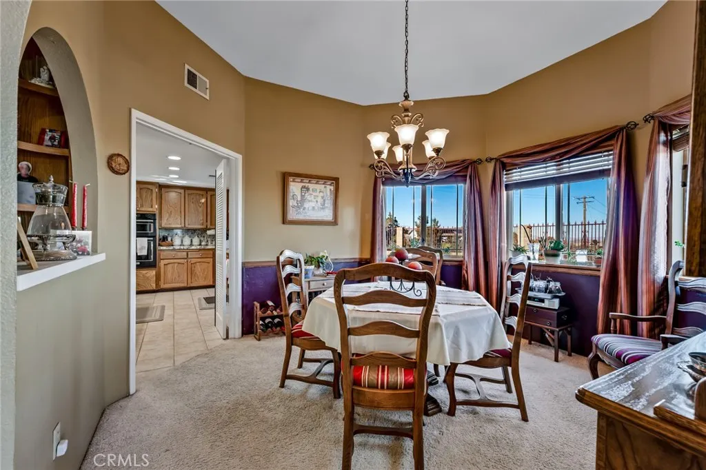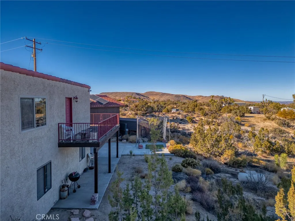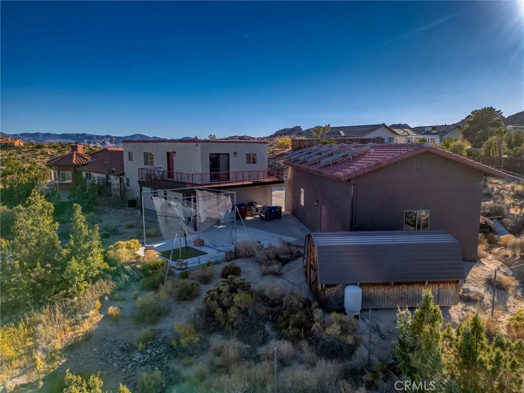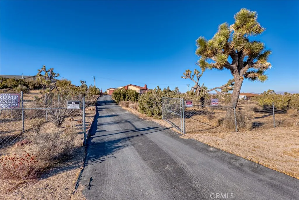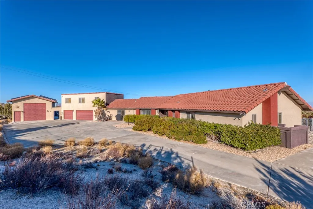 Welcome to this exceptional 6 bedroom, 4 bath estate located in the highly desirable Rancho Mesa area of Yucca Valley. Set on over 2.4 fully fenced acres with a striking wrought-iron entry gate, this property offers a rare combination of space, flexibility, and functionality. The main residence features 3 bedrooms and 3 bathrooms, designed with a spacious, open layout. The living room showcases soaring ceilings, a cozy fireplace for cool desert evenings, and an inviting flow ideal for everyday living or entertaining. A shared family room connects the main home to a separate 3-bedroom, 1-bath guest house, offering excellent versatility for extended family, guests, or multi-generational living. The guest quarters include a private living room and a wraparound balcony with sweeping desert and mountain views, creating a true retreat. One of the standout features of this property is the garage setup, which is exceptionally rare. In addition to the attached 3-car garage on the main house with ample storage, the property includes a large detached RV garage, perfect for car collectors, workshops, recreational vehicles, creative studios, or serious hobbyists. This detached garage also hosts a paid-off solar system, adding both value and energy efficiency. For added peace of mind, the home is equipped with a Generac whole-house backup power system, ensuring uninterrupted comfort during power outages. With incredible views, expansive usable land, and a layout that offers endless possibilities, this Rancho Mesa estate delivers both beauty and practicality. This is a property that truly