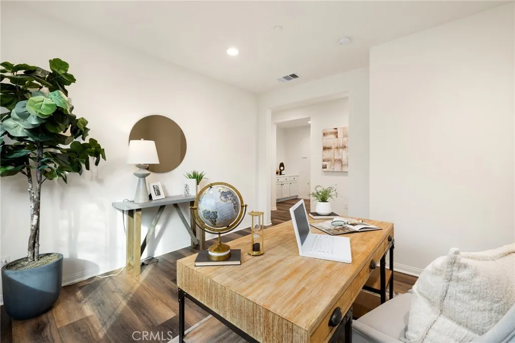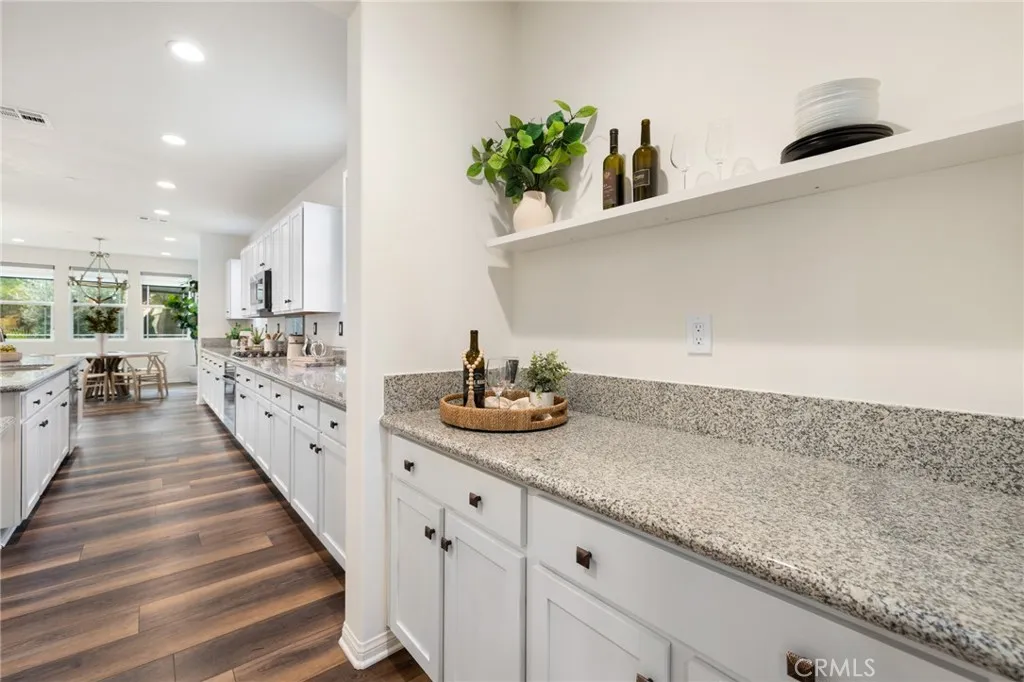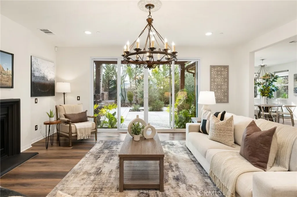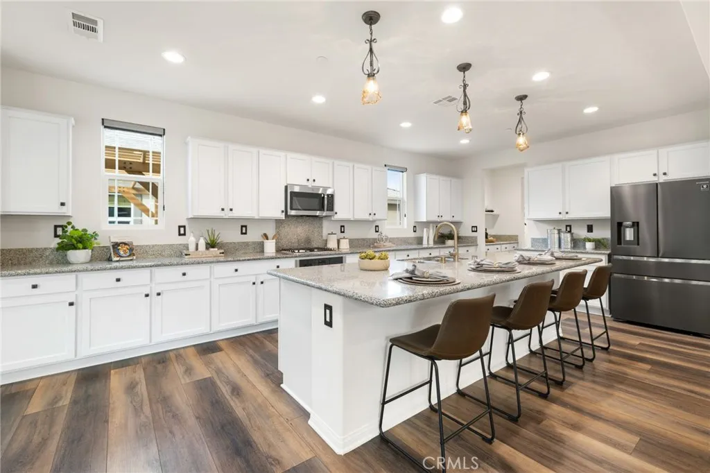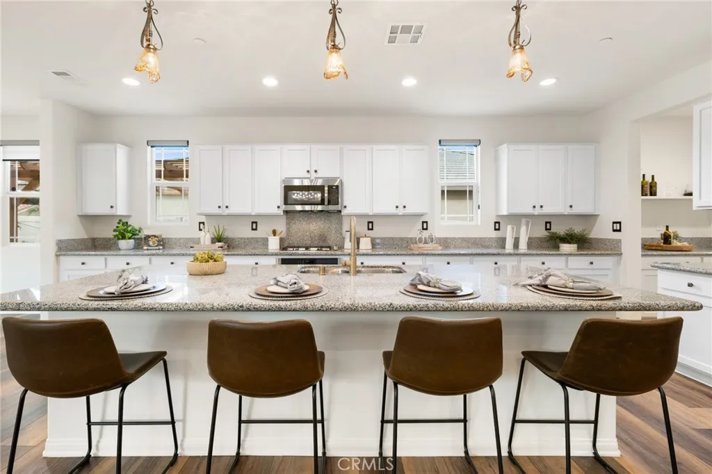 Built in 2021 and showcasing $150,000 in upgrades, this 4-bedroom, 3.5-bath home with a downstairs office (optional 5th) offers nearly 3,900 sqft in the desirable Audie Murphy Ranch community. on a 7,457 sqft lot with mountain views, solar, and a 3-car garage with EV charger, this home offers exceptional space and thoughtful design. Fresh white paint, LVP flooring throughout the first floor and abundant natural light create a warm atmosphere from the moment you enter. A grand entryway with a statement chandelier opens directly into a spacious formal dining area that connects to both the walk-in pantry and gourmet kitchen, creating a smooth and functional flow. The kitchen boasts granite counters, white cabinetry, upgraded hardware, stainless steel appliances, a large eat-up island with pendant lighting, and seamlessly flows into the rare morning-room addition, which provides extra dining space and additional backyard access. The kitchen transitions seamlessly into the great room, centered around a gas fireplace, custom chandelier, and double slider that brings the indoor and outdoor spaces together. A flex room sits just off the main living area, ideal for an office or optional 5th bedroom, as well as a guest bath, laundry room, mudroom with built-in storage, and garage access to complete the main floor. The second level opens with two secondary bedrooms positioned near a full bath appointed with dual sinks and shower-tub combo. Just beyond this area, another spacious secondary bedroom includes a walk-in closet and its own ensuite bath with a walk-in shower. The expansive l