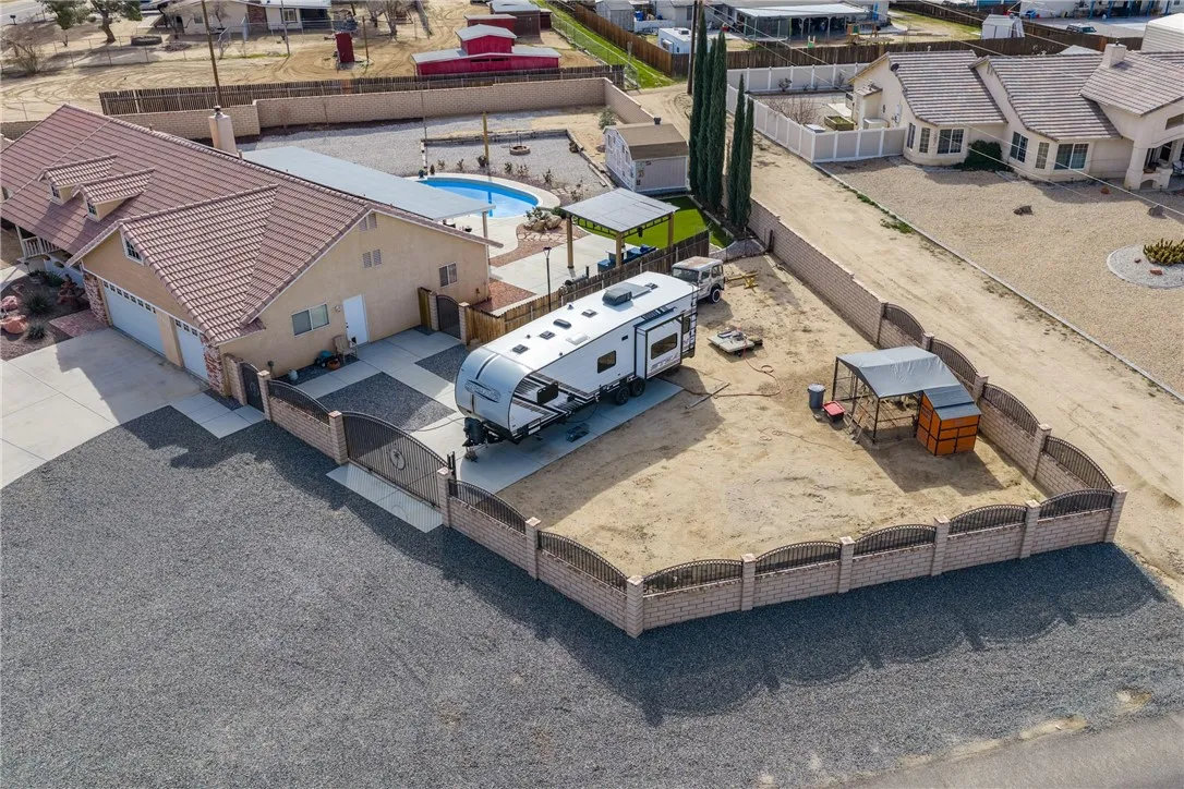 Welcome to 14728 Nokomis, Apple Valley, a spacious 2,603 sq ft, 4-bedroom, 2-bath home on a corner lot in the highly desirable Desert Knolls neighborhood. This home features upgraded flooring throughout and a split floor plan designed for comfort and privacy. The home offers a separate living room and formal dining area, along with a kitchen that opens to a cozy breakfast nook, perfect for everyday meals and entertaining. Enjoy your own private swimming pool, ideal for warm High Desert summers, complete with a new pool pump (2024) and new pool filter (2025). Additional sought-after features include solar panels, a concrete RV pad, and RV hookups on both sides of the house. The primary bedroom features a sliding glass door to the backyard, creating a seamless indoor-outdoor connection. All bedrooms include walk-in closets, providing generous storage throughout the home. Stay warm with a wood-burning stove with blower, and step outside to a backyard designed for enjoyment with a gazebo, fire pit, block wall fencing, shed, chicken coop, and flag pole. Drive-through wrought iron gates on both sides of the house add convenience and security. The home also includes a 3-car garage, perfect for vehicles, hobbies, or extra storage. Additional highlights include electrical ready for a spa hookup, extra electrical in the garage (previously used for woodworking equipment), and walkable attic storage above the garage, offering excellent storage and workspace options. Conveniently located near Desert Knolls Elementary School, parks, shopping, dining, and everything Apple Valley has to of