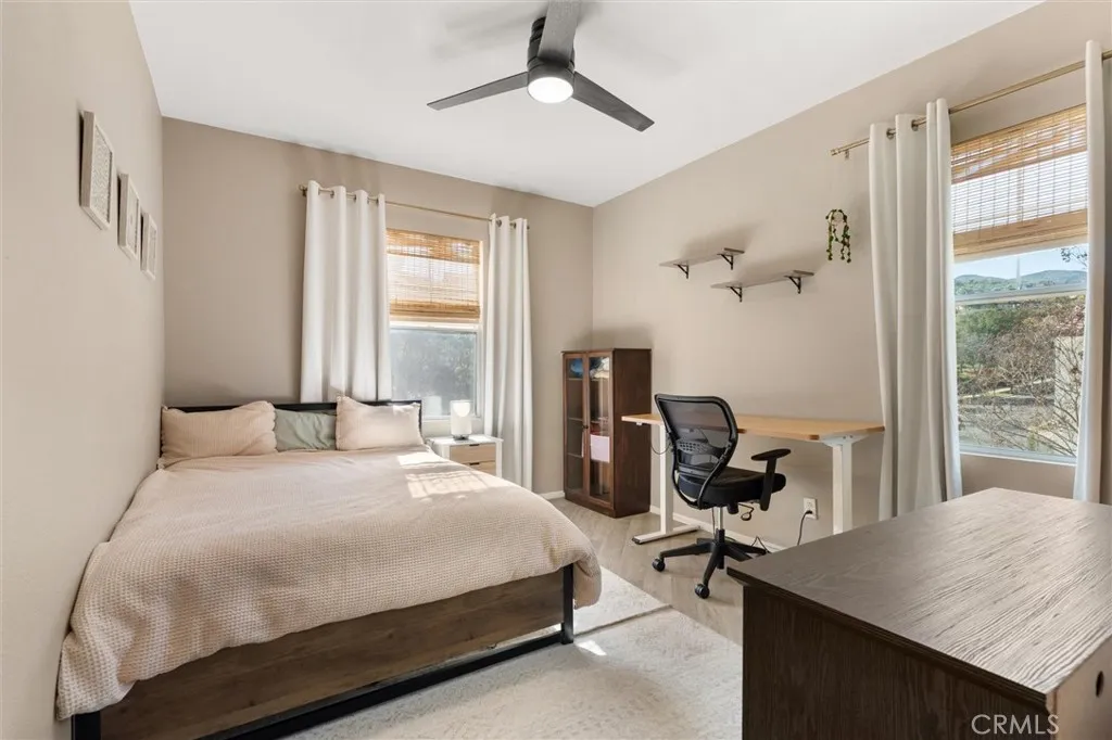 Stunning VIEWS and SOLAR in one exceptional home! Located on a single-loaded street with no neighbors across, this residence blends privacy, energy efficiency, and flexible living space - making it an ideal family home. Step inside to soaring 9-foot ceilings and a light-filled, open living room with plantation shutters. The downstairs features a spacious kitchen with large center island, walk-in pantry, and upgraded cabinetry, along with both formal and casual dining areas. A main-level bedroom and full bathroom offer an excellent multigenerational living option or private guest suite, while the converted extra third garage space adds valuable bonus space, ideal for a home office, playroom or gym. Upstairs, unwind in the luxurious primary suite complete with a private balcony overlooking panoramic views, and en-suite bathroom with dual vanities, a soaking tub, walk-in shower, and a generous walk-in closet. Three additional bedroomseach with walk-in closetsplus a full bath with dual sinks, built-in desk, and an upstairs laundry room complete the second level. The backyard is designed for low-maintenance outdoor living and entertaining, featuring stamped concrete, artificial turf, and a built-in BBQ with sinkall framed by breathtaking city and hillside views. Enjoy fresh fruit from your own trees, including guava, mulberry, apricot and more. Energy-saving upgrades include solar panels, a new HVAC system, a whole house fan, and built-in EV charger, keeping monthly utility costs low. Located walking distance to community parks and pickleball courts, residents enjoy easy access
