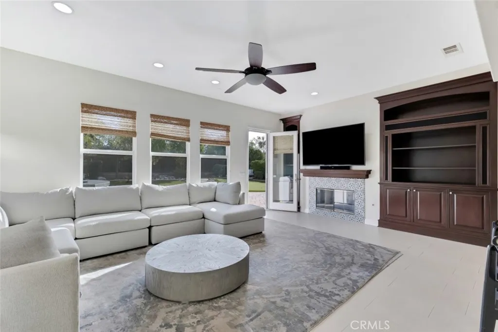 Located within the boundaries of highly rated Porter Ranch schools and set behind the guard gates of the prestigious Renaissance community, this exceptional single-story residence offers an open and airy floorplan enhanced by high ceilings, recessed lighting, abundant natural light, and refined architectural details throughout. The expansive kitchen is thoughtfully designed with generous storage, a large center island with seating and workstation, and a full suite of stainless-steel appliances including a double oven, 6-burner gas range, dishwasher, trash compactor, wine refrigerator, and microwave. The inviting family room features built-in shelving, large windows, and direct access to the backyard, with formal living room, and formal dining room provide flowing spaces for entertaining. The home offers 4 spacious en-suite bedrooms, including a massive primary suite with double-door entry, walk-in closet, and a spa-inspired bath with dual vanities, soaking tub, and glass-enclosed shower, complemented by a separate powder room for guests. A dedicated laundry room with extra storage and a 3-car attached garage with direct access enhance everyday functionality. The backyard is designed for both relaxation and recreation, featuring a built-in BBQ and gorgeous hardscape meandering between a spacious faux lawn with hot tub area and a custom putting green with raised seating area, all highlighted by lush mature landscaping and surrounded by stunning mountain views. The Renaissance community is known for its 24-hour guard-gated security, beautifully maintained grounds, and communit