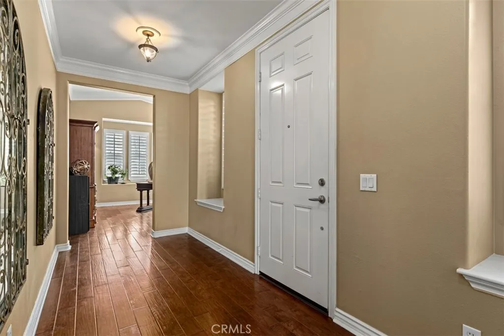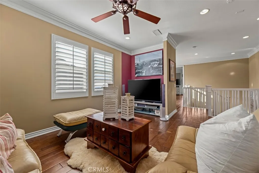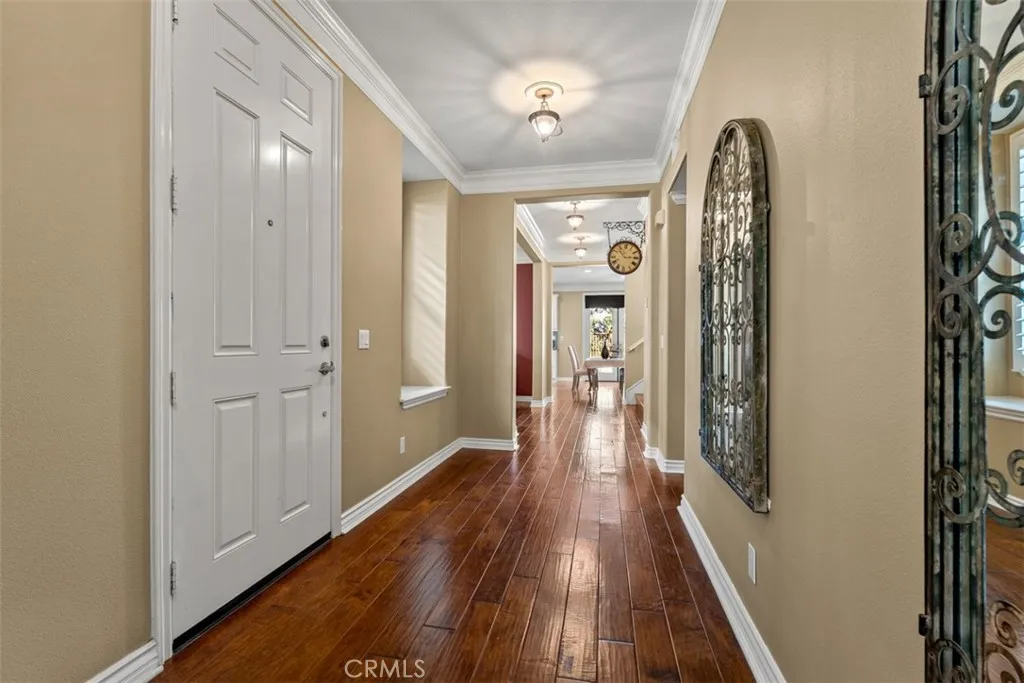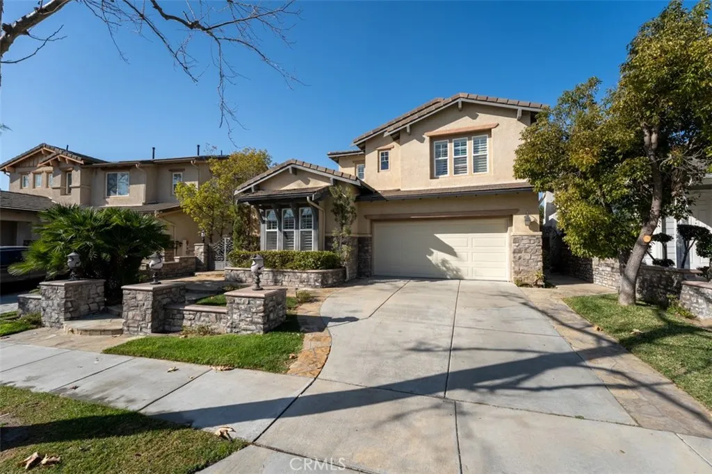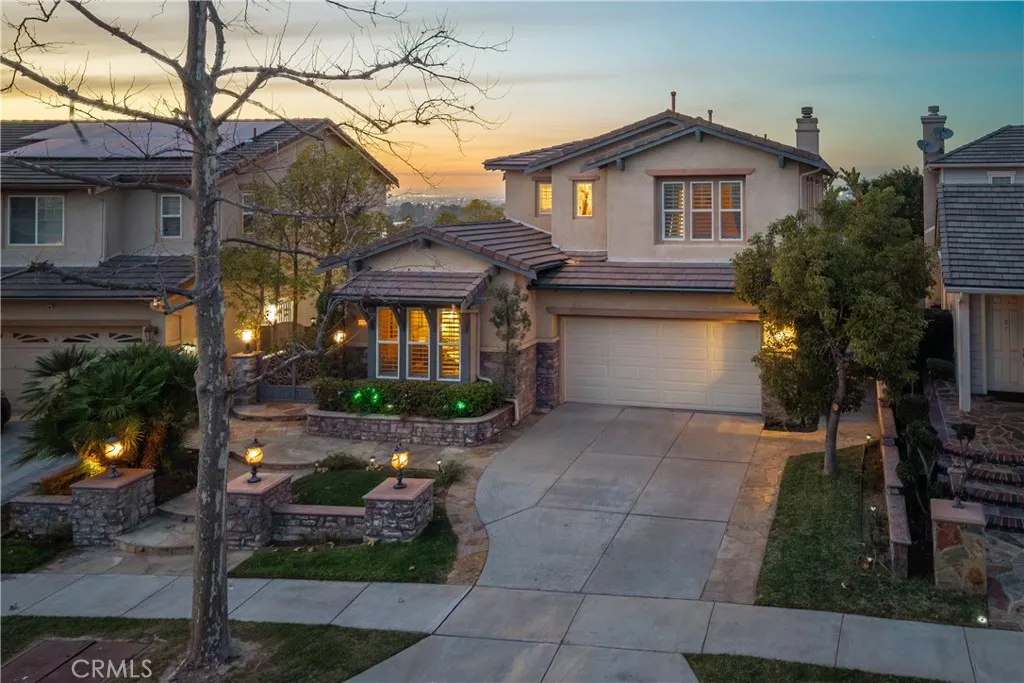 Located in the guard-gated community of Hawks Pointe, this executive-style home offers mountain views, city light views, and a flexible floor plan with a highly desirable main-floor bedroom and full bathroom. Designed with curb appeal in mind, the property features a stacked-stone and wrought-iron entry gate, flagstone walkways, and a private courtyard entry. Interior highlights include wood flooring, crown molding, custom window shutters, and an open-concept layout ideal for everyday living and entertaining. The formal dining room features designer lighting and custom wall finishes. The living room is currently configured as a home office, providing a dedicated work-from-home option. The kitchen is anchored by a large granite island with ample counter space and opens directly to the family room. French doors lead to a low-maintenance backyard with unobstructed mountain views, nearby walking trails, and city lights. Upstairs includes a spacious loft/den and generously sized secondary bedrooms with custom textured carpeting. The primary suite offers a spa-style bathroom with granite countertops, full tile shower surround, soaking tub with granite slab surround, and detailed backsplash finishes. Additional features include ceiling fans, custom blinds and drapery, curated light fixtures, and whole-house PEX plumbing, plantation shutters, LED lighting, and an abundance of storage. The main-level bedroom provides flexibility for guests or extended living needs. Hawks Pointe offers a guard-gated entrance, several mini parks, a tot lot, and scenic walking and hiking trails through
