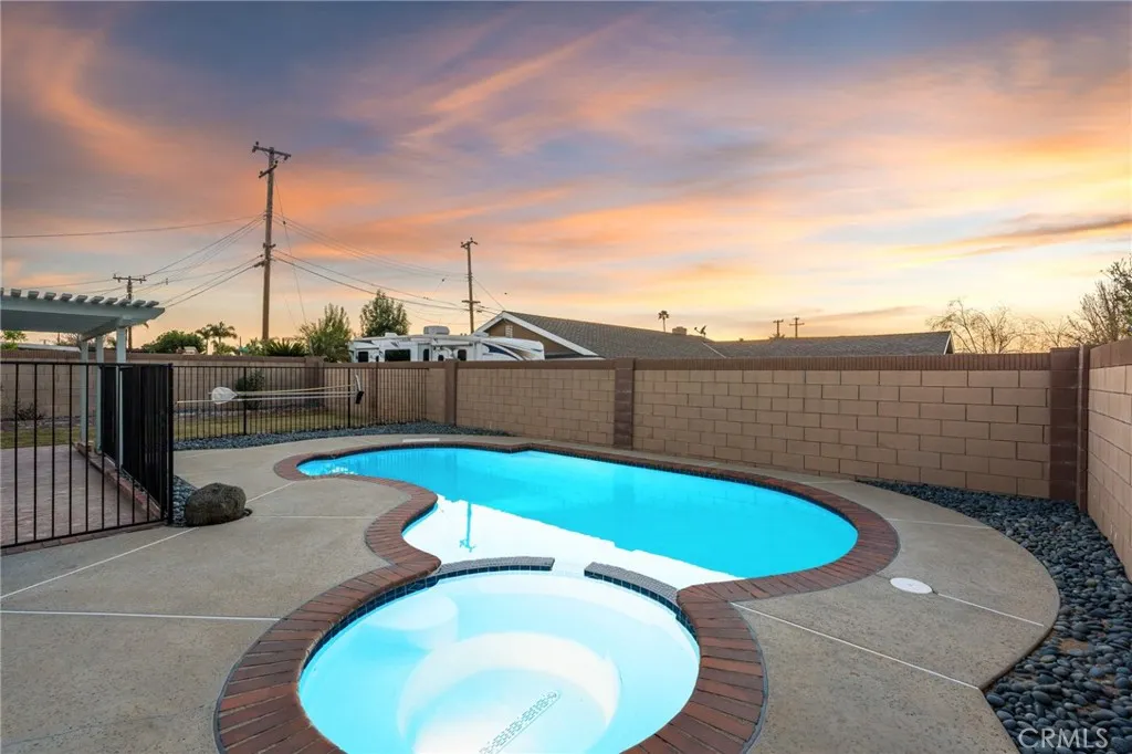 Single-story pool home situated on a desirable corner lot. The front yard features a manicured lawn, decorative river-rock garden with a Victorian lantern, and a herringbone brick planter leading to the covered front entry with a wood and glass front door . Inside, the home offers tiled flooring and a bright, open feel with LED recessed lighting throughout. The spacious kitchen features rich wood cabinetry, granite countertops, stainless steel appliances, and a peninsula with a gas cooktop and four-sided stainless steel vent hood. An adjacent dining area opens directly to the kitchen and includes custom built-ins and a window overlooking the front yard. The family room offers carpeted flooring, a fireplace with tiled surround and wood mantel, a built-in workstation, and a sliding glass door with views of the backyard and swimming pool. Down the hallway, ample built-in storage cabinetry provides added convenience and leads to the bedroom wing. The primary bedroom features carpeted flooring, custom built-ins, and an en-suite bathroom with tiled flooring, an expansive wood vanity, and a custom tiled shower with sliding glass enclosure. Two additional bedrooms are generously sized, one currently configured as a home office, along with an updated hall bathroom. The spacious garage includes a laundry center, bright lighting, and a pull-down ladder providing access to attic storage. The backyard is ideal for entertaining, offering a newly refinished pool and spa with brick coping, concrete decking, a large grass area, rock gardens, a covered patio with herringbone brick decking, a