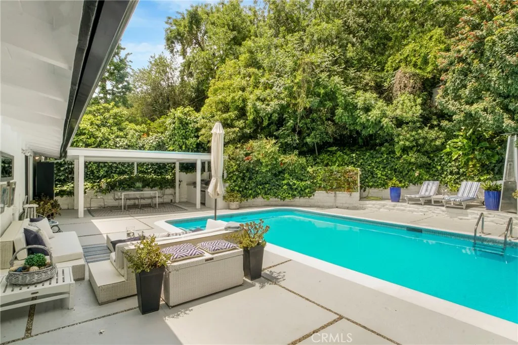 This exquisite mid-century contemporary home with fantastic curb appeal is nestled on a secluded hillside in a coveted Sherman Oaks neighborhood. Ideally located South of Ventura Blvd., this property offers close proximity to top-rated schools, premier dining/shopping, and easy freeway access. It features 4 bedrooms & 4 bathrooms (3 en suite), and 2,597 sq. ft. of thoughtfully designed living space on a 7,988-sf. lot that perfectly blends privacy, comfort, and style. Lush, mature landscaping surrounds the home, highlighted by an inviting heated swimming pool and a covered outdoor dining/BBQ areaideal for enjoying the quintessential Southern California lifestyle year-round. Recently updated, the home showcases new hardwood floors, fresh interior/exterior paint, recessed lighting throughout, solid oak-veneer doors, and abundant built-in storage. The open-concept floor plan features high ceilings with exposed wood beams, floor-to-ceiling windows, and seamless indoor-outdoor flow. The living room is a true showpiece, featuring custom built-in cabinetry with a wine rack and a stunning fireplace as the focal pointperfect for both entertaining and everyday living. Some furniture may be included, offering added value and convenience. The beautiful kitchen is equipped with a stainless-steel built-in GE Monogram refrigerator, quartz countertops, a stainless-steel farmhouse sink, a generous island with ample storage, and brand-new GE gas stove and dishwasher. One of the homes standout features is a custom-built recording studio, constructed with QuietRock drywall for superior soundpro