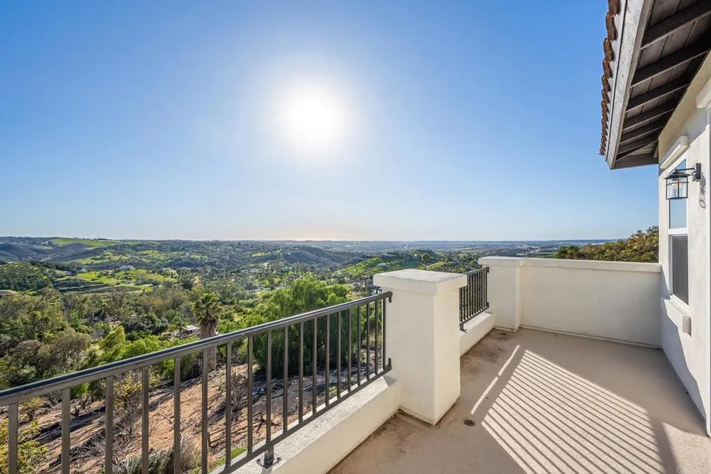 Welcome to Aguacate Ranch, one of Bonsalls most prestigious gated communities. Step inside this 4,640 sq ft estate and youre immediately greeted by natural light and panoramic sweeping views of valleys, hills, and ocean horizon. Expansive windows frame the views from nearly every main living space, creating a home that feels connected to the surrounding beauty in a way few properties can match. Situated at the end of a private cul-de-sac on more than 4 acres, the home was built in 2006 and thoughtfully refreshed in 2021 with a full interior and exterior repaint, updated kitchen cabinetry, mature, curated landscaping, and artificial turf. The open floor plan features hardwood flooring, high ceilings, and a chefs kitchen with stainless steel appliances, butlers pantry, and walk-in pantry. The primary suite is a retreat unto itself, with two generous walk-in closets and a private balcony where sunsets paint the hills every evening. A main-level room with full bath and its own exterior door offers flexible space for guests, multigenerational living, or a home office. The oversized bonus room works as a media room, gym, or playroom. Outside, the solar-heated pool and entertainers patio are surrounded by sweeping views and afternoon ocean breezes. The acreage includes graded areas, beautiful grounds, and room for an ADU, detached garage, or whatever you envision. A three-car garage with dedicated storage, wide community roads, and a peaceful gated setting complete the picture, all just 20 minutes to the beach and moments from Oceanside, Vista, and Fallbrook. A rare opportunity to