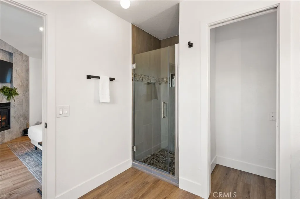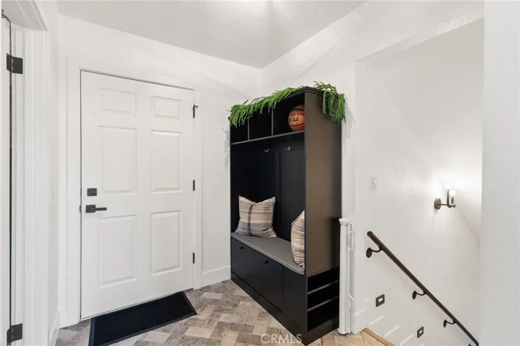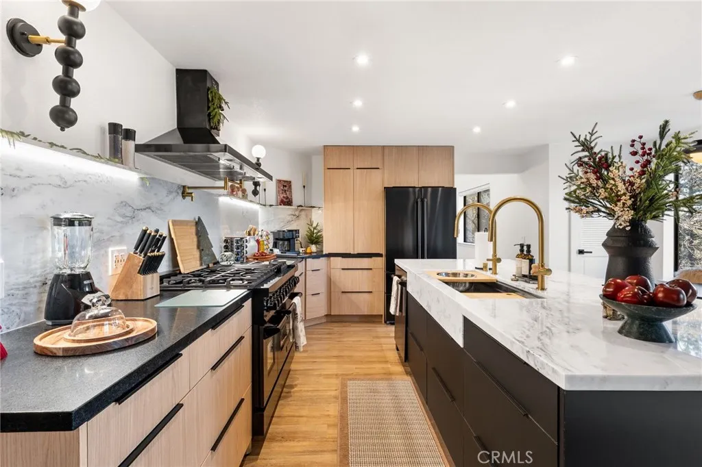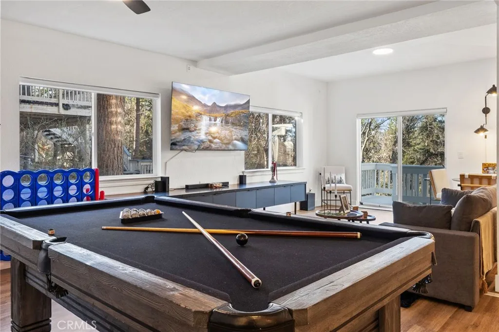 Set on a quiet cul-de-sac in the Enchanted Forest neighborhood of Running Springs, this fully turn-key mountain home delivers rare privacy and immersive forest views across all three levels. Thoughtfully renovated, it pairs clean contemporary finishes with warm mountain character in a setting that feels both secluded and refined. The kitchen is a true showpiece, designed for both daily living and entertaining. It features a 48 black stainless steel ZLINE professional-grade range and matching appliances, a 45 Kraus workstation trough sink, brushed brass fixtures, a pot filler, and an appliance garage with built-in electrical. Dolomite and Black Mist honed granite extend across the countertops and full backsplash, complemented by flat-panel European rift white oak cabinetry and a striking 8-foot island with double-sided black cabinetry. Living spaces are warmed by three fireplaces, including wood-burning and gas fireplaces in the family room and primary suite, plus an electric fireplace in the game room. The game room is theater-ready with surround sound, a floating entertainment center, a bar/kitchenette, dual wine refrigerators, and custom wine storage. All four bathrooms have been fully renovated, while recent whole-home upgrades include new LVP flooring, fresh interior and exterior paint, updated lighting throughout, and new door hardware. Outdoor living is equally compelling, with multiple decks, a private spa, garden beds, and a charming chicken coop. Confidence-inspiring improvements include two laundry areas, a full-house generator, new electrical panels, a brand-new
