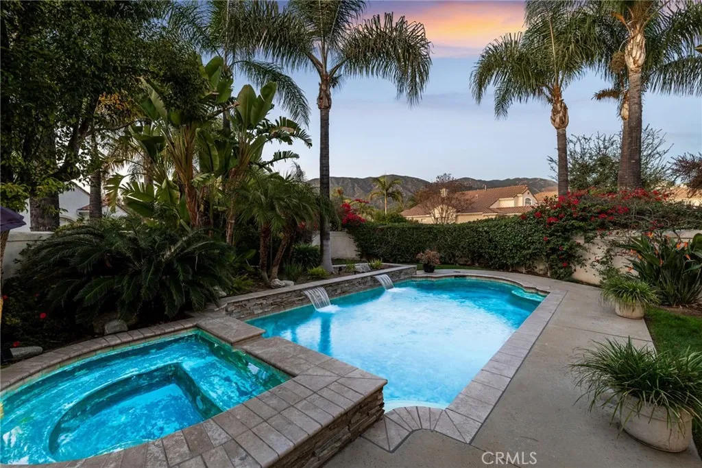 A refined single-story residence offering timeless architecture, privacy, and resort-style outdoor living, introduced by a striking stone-arched entry. Set within the gated La Verne Heights community, the home is approached by a brick-lined walkway and manicured landscaping, creating a warm and architectural first impression. Inside, the entry opens seamlessly into the main living spaces, where abundant natural light, plantation shutters, and crown molding establish an inviting, refined tone. The living room overlooks the front yard with mountain views through a bay window and flows effortlessly into the adjacent dining area. Just off the entry, a private office or optional fourth bedroom with double doors offers flexible use. The kitchen opens directly to the family room, forming a natural gathering space and featuring rich wood cabinetry, a spanning island with bar seating, Thermador stainless steel appliances, and a pantry. An open breakfast nook with sliding glass doors extends the living space outdoors, reinforcing the homes effortless indooroutdoor connection. The family room is anchored by a stone fireplace with custom built-in cabinetry and media center, complemented by crown molding, plantation shutters, built-in surround speakers, and abundant natural light through a wall of shuttered windows. The primary suite is a serene, retreat-like space designed for comfort and privacy. Generously sized, it features plush carpeting, crown molding, a ceiling fan, and shuttered windows that fill the room with soft natural light. A cozy fireplace adds warmth and character, whil