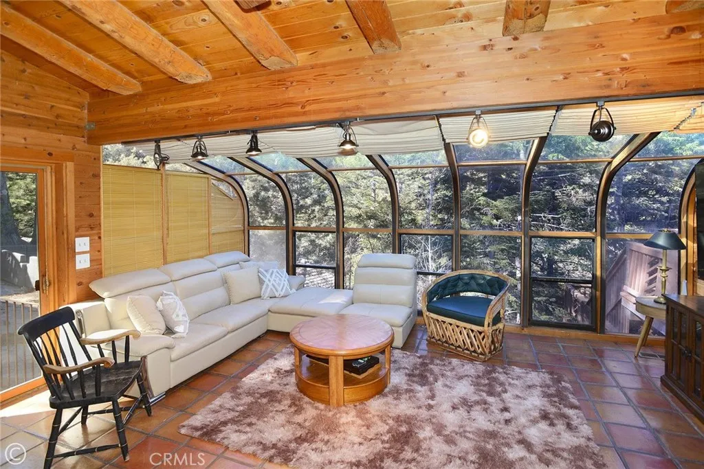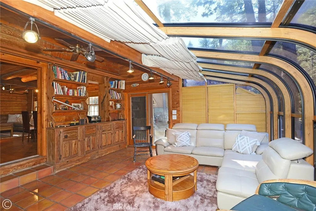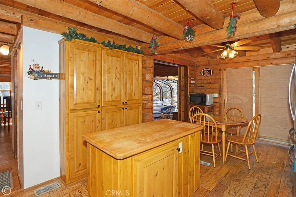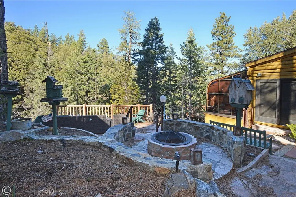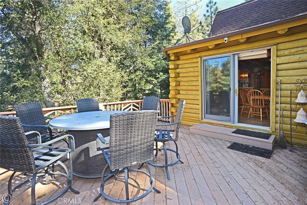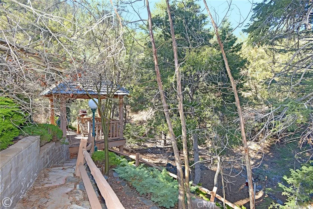 Mountain Living at its best! Enjoy this stunning secluded Log Cabin Style, private gated entry 3 bed, 2 bath retreat family home. Enter an impressive concrete stone driveway in the midst of pine trees and mountain views. Brick stairs and covered porch lead right to front door entrance. Enter an entertainers galley kitchen with extra cabinets, storage, 2 islands with seating, 2 ovens, kitchenet, laundry, wet bar, granite counters, sliding doors open to decks from the kitchen with plenty of space to entertain under the stars or your morning coffee. The main floor also includes the family room with pellet stove during cozy evenings. Ceilings are designed with logs and T&G wood, double pane wood framed windows throughout 2 stories of living. 1 full bath downstairs sandwiched between the kitchen and Living Room. The main living Room invites family and friends to gather around the pellet stove fireplace or the open dining room with a peek a boo wall stepping down into sun room, Spanish tile flooring, wood built in shelving, ceiling fan, a wall of windows with plenty of light offering panoramic views, and wood sliding glass doors leading outside. Step down to professionally landscaped outdoor entertaining areas offering multiple decks, terraced walkways, gazebo, outdoor charcoal pit, perfect for an evening of fresh air and night sky. Oversized single car garage faces properties entrance. Once entered, you are greeted with a wide wood floor staircase leading up to the Master bed, large closet, 2 guest beds, 1 full bath, windows inviting plenty of light throughout the second floor.